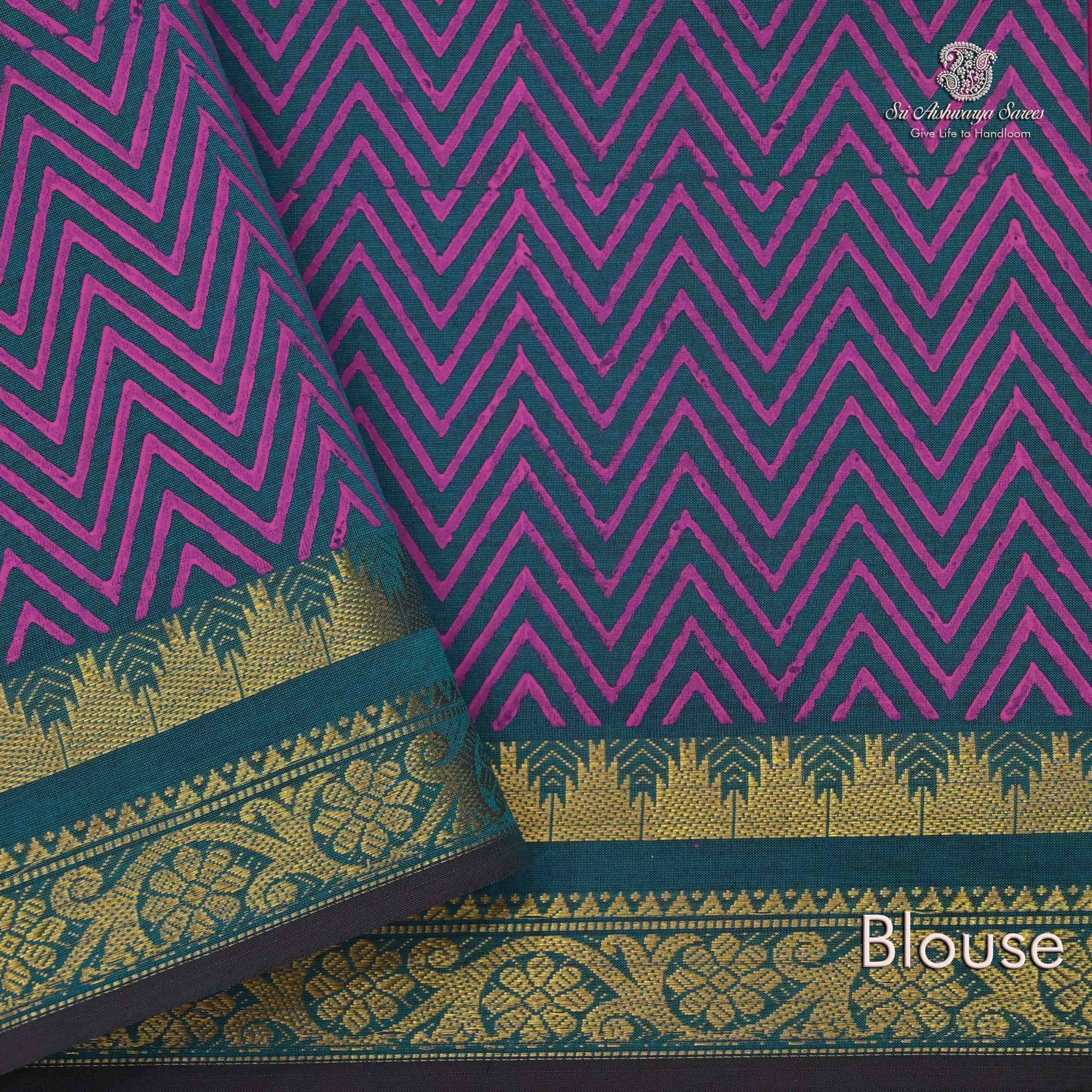 Vibrant Semi Silk Cotton Printed Saree featuring a vibrant magenta body, dark mandulir green pallu, and hand block prints.
