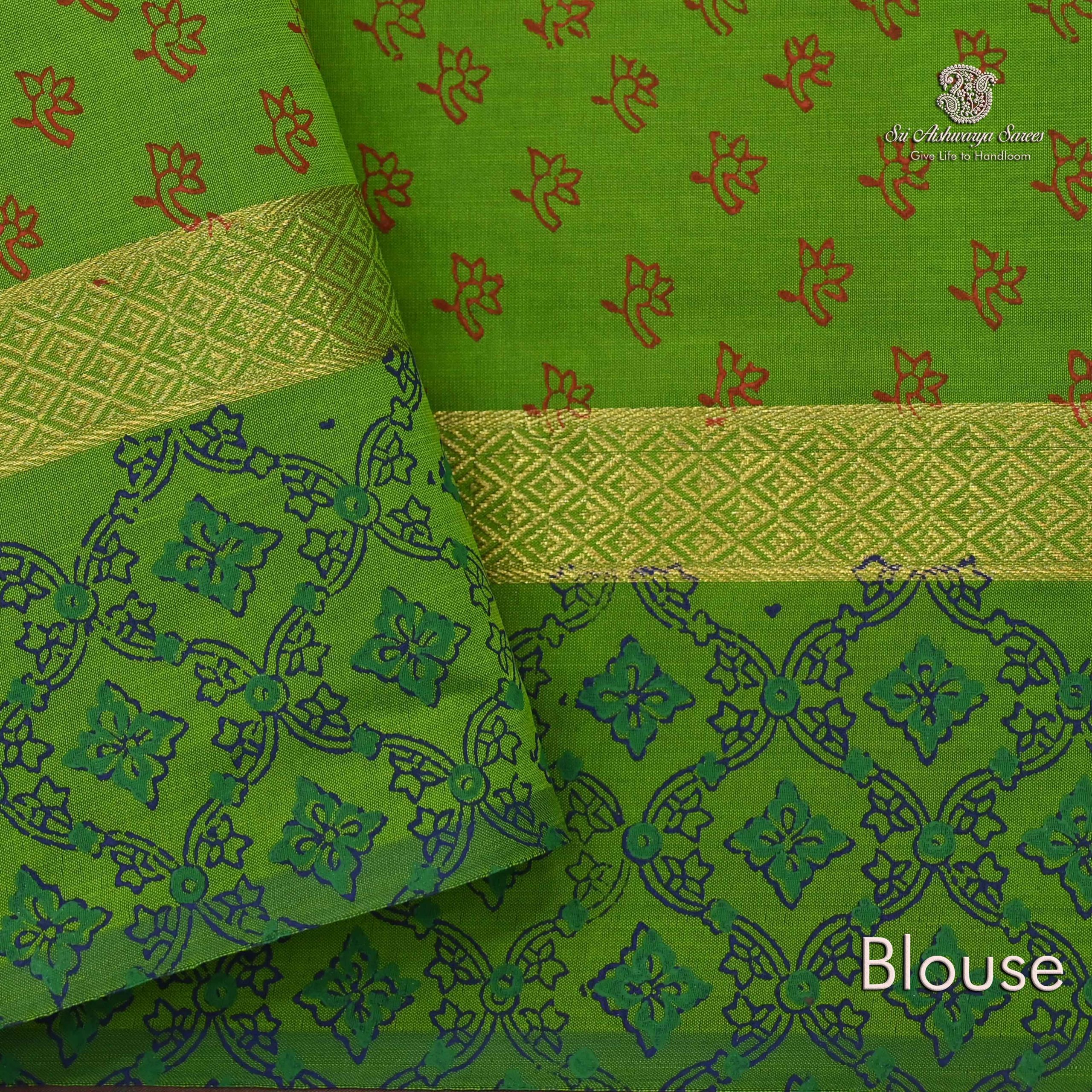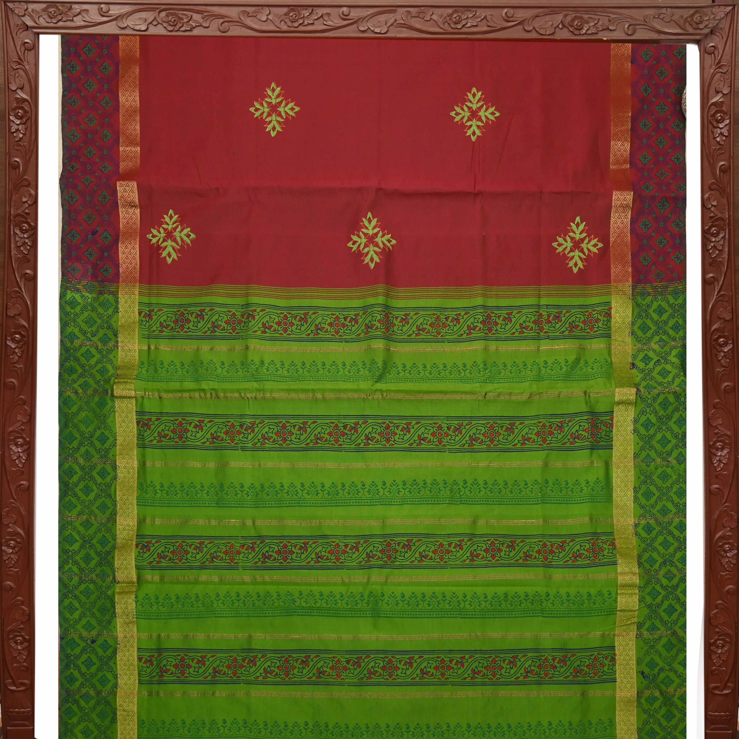 Elegant semi-silk saree featuring a Mandhulir Maroon body and rich Olive Green pallu, adorned with traditional hand block-printed rangoli design.