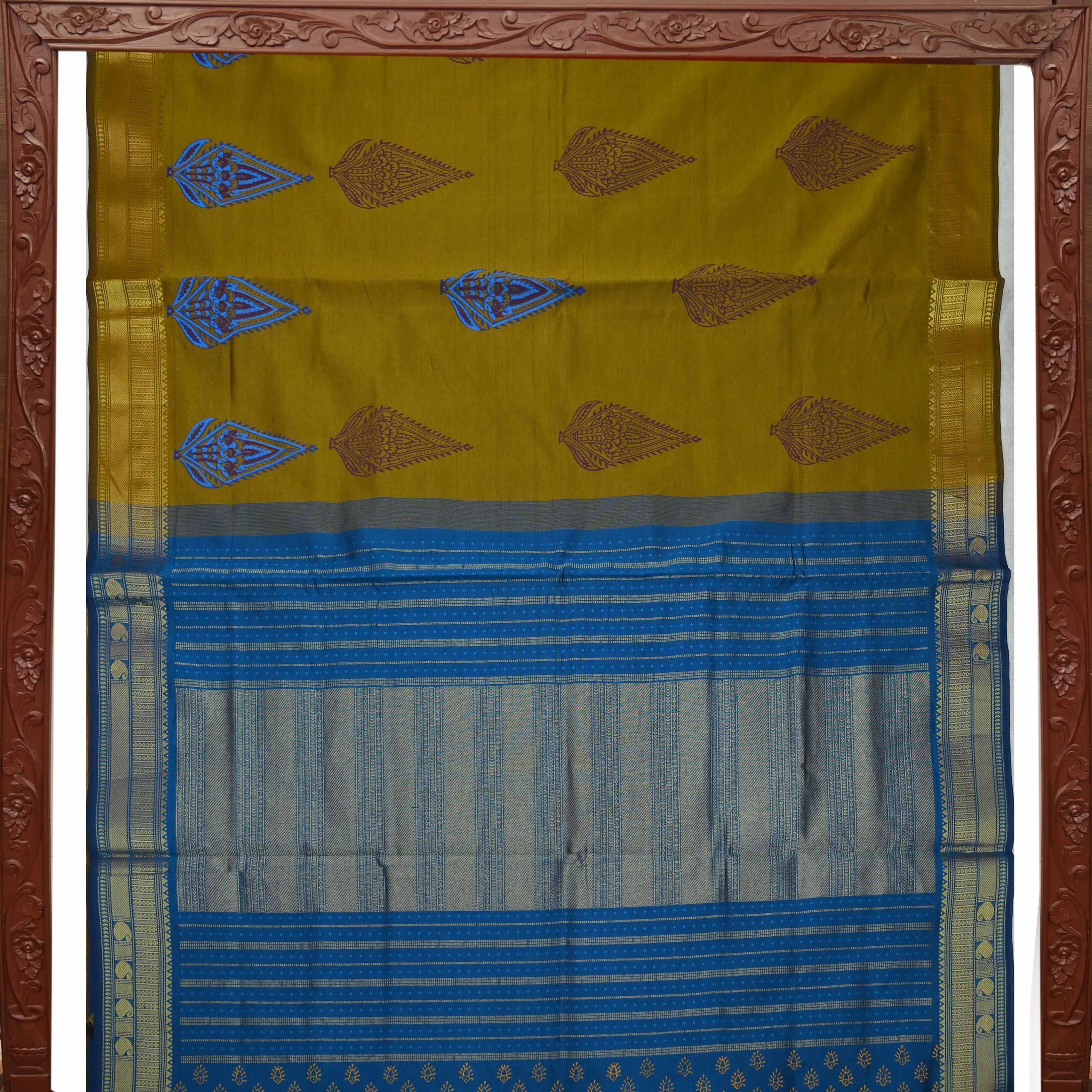 Elegant semi-silk saree featuring a Mehandi Green body and rich pallu, adorned with traditional hand block-printed rangoli design.