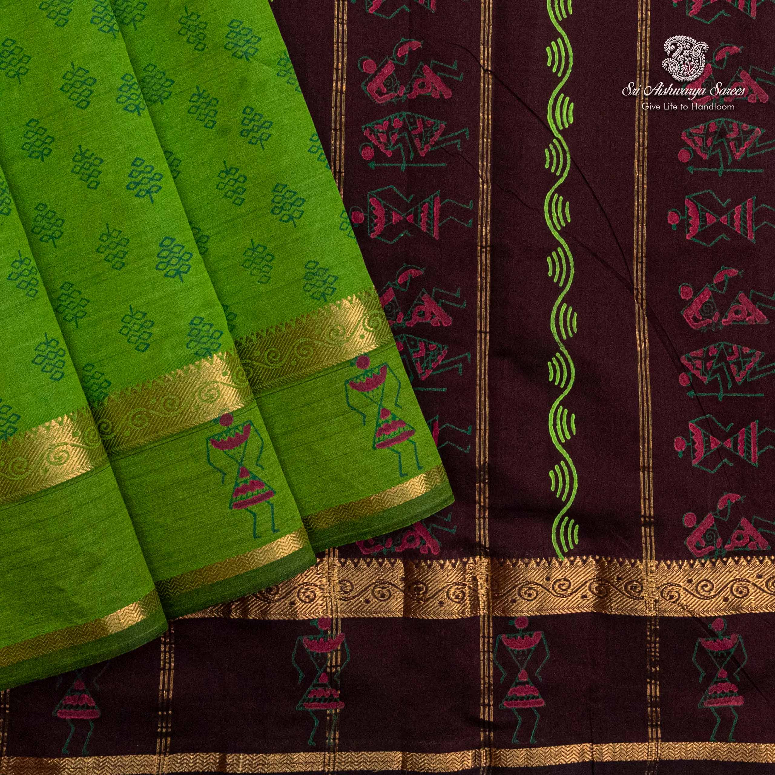 Elegant semi-silk saree featuring a olive drab and dark brown pallu, adorned with traditional hand block-print design.