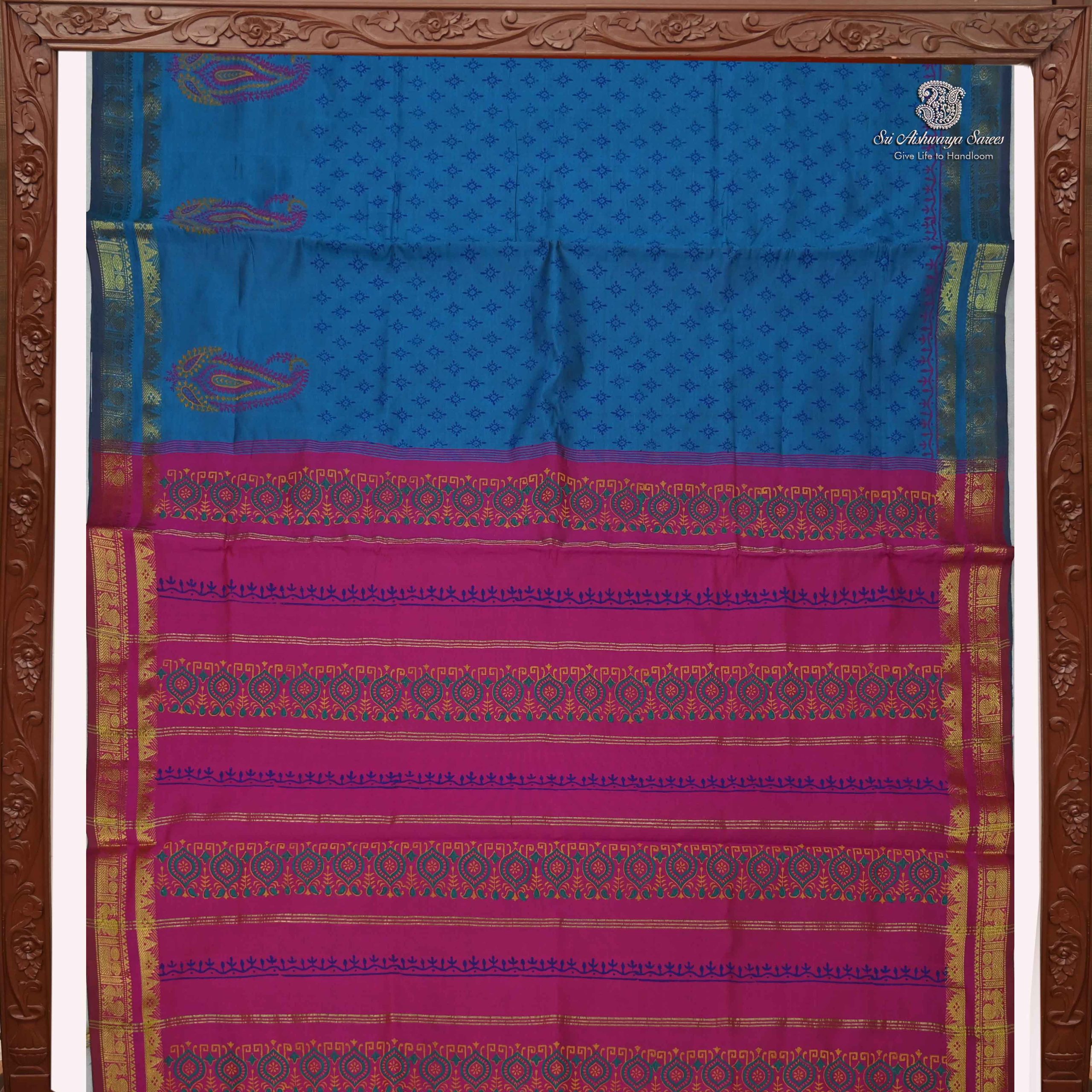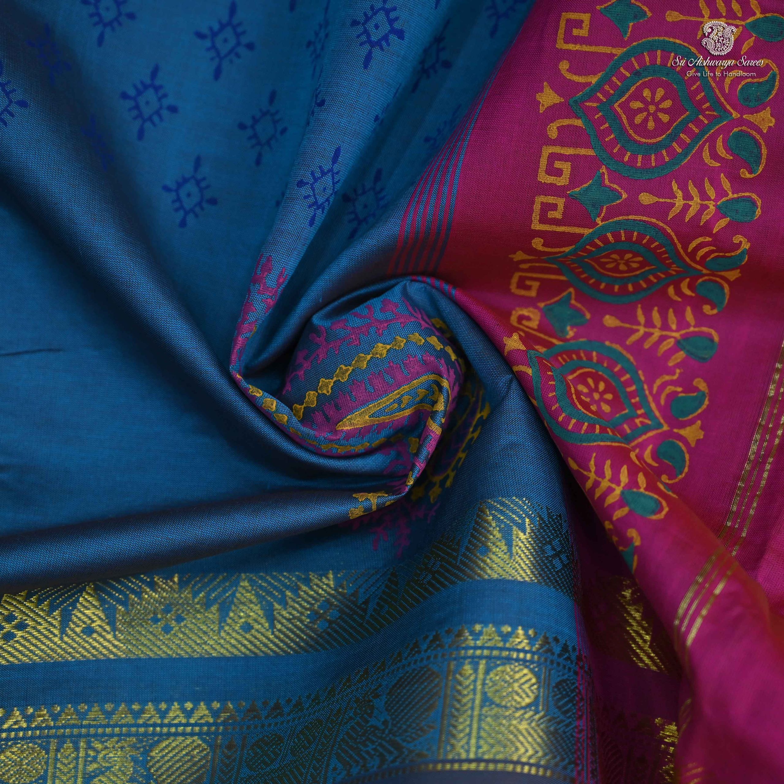 Elegant semi-silk saree featuring a Peacock Blue body and rich Mustard yellow pallu, adorned with traditional hand block-printed peacock design.