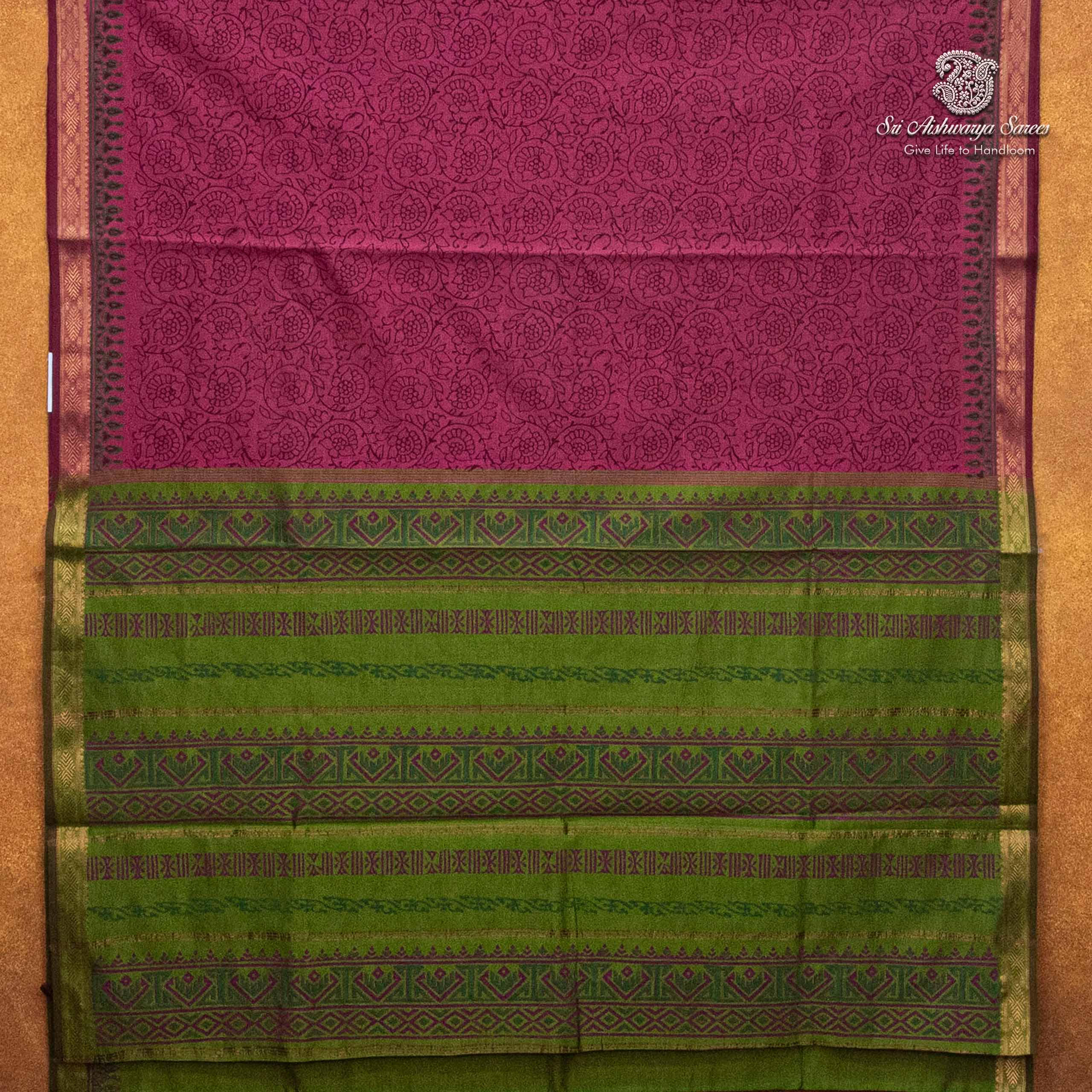 Elegant semi-silk saree featuring a rouge pink body and mehandi green pallu, adorned with traditional hand block-print design.