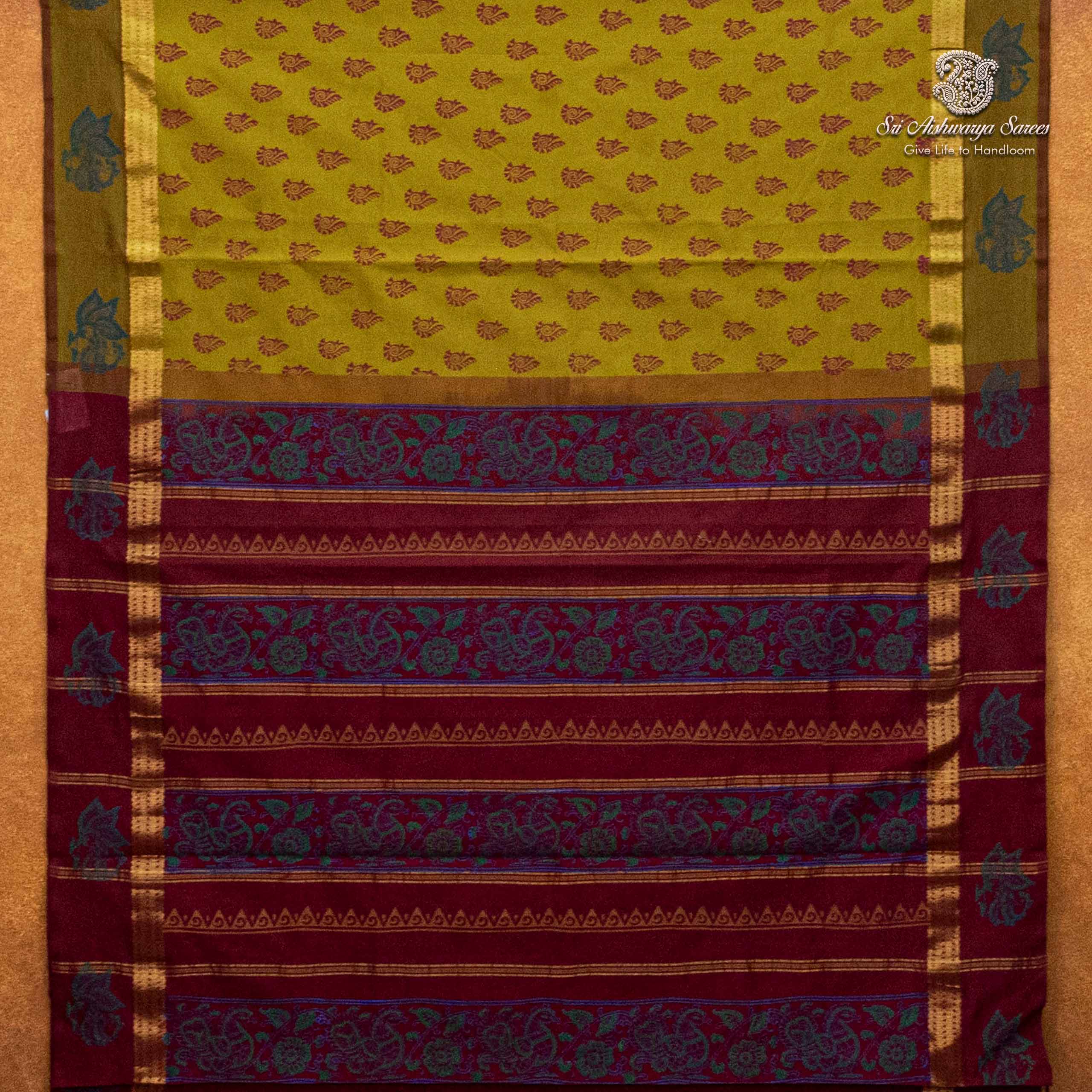 Elegant semi-silk saree featuring a sambangi yellow body and maroon pallu, adorned with traditional hand block-print design.