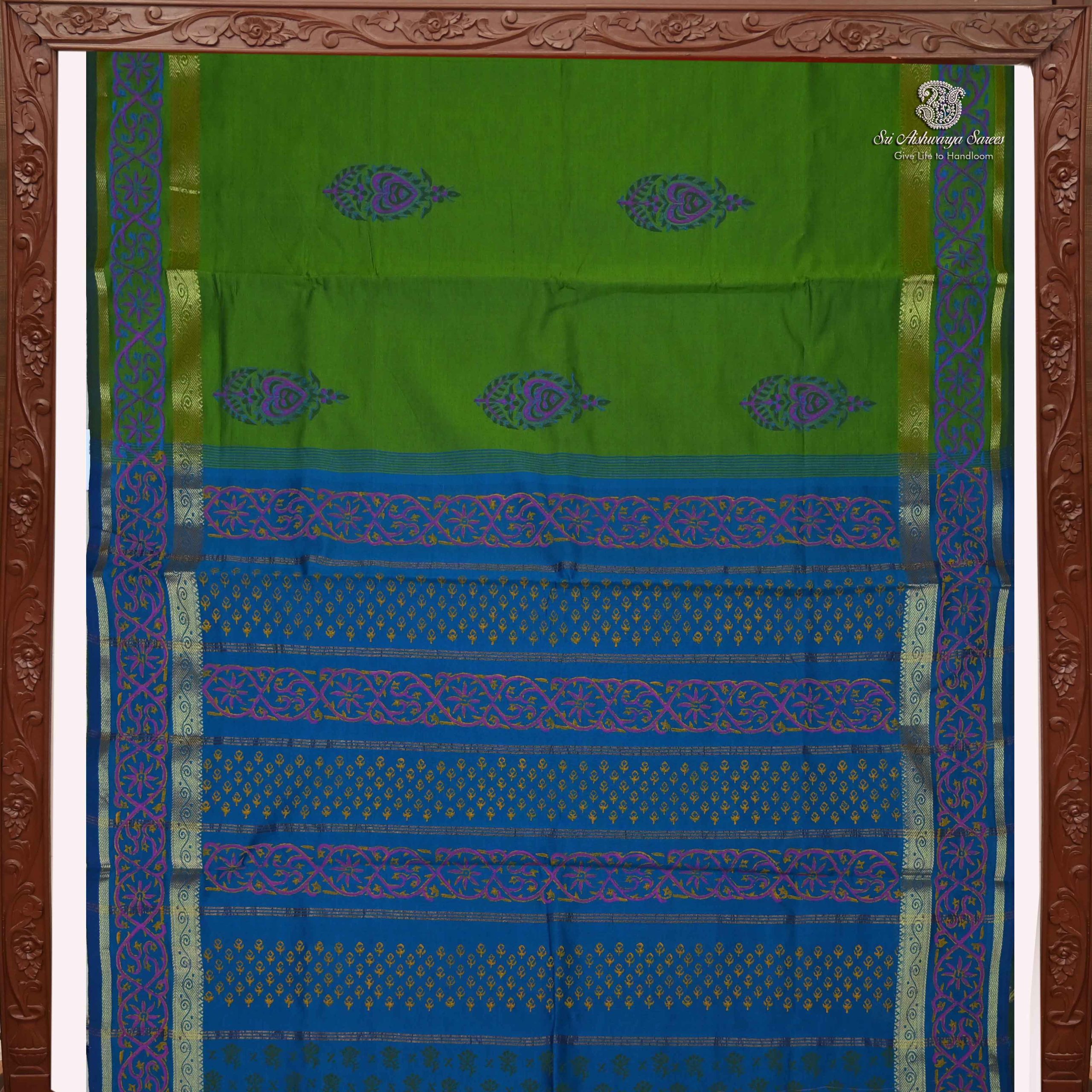 Elegant semi-silk saree featuring a Turquoise Green body and rich pallu, adorned with traditional hand block-printed peacock design.