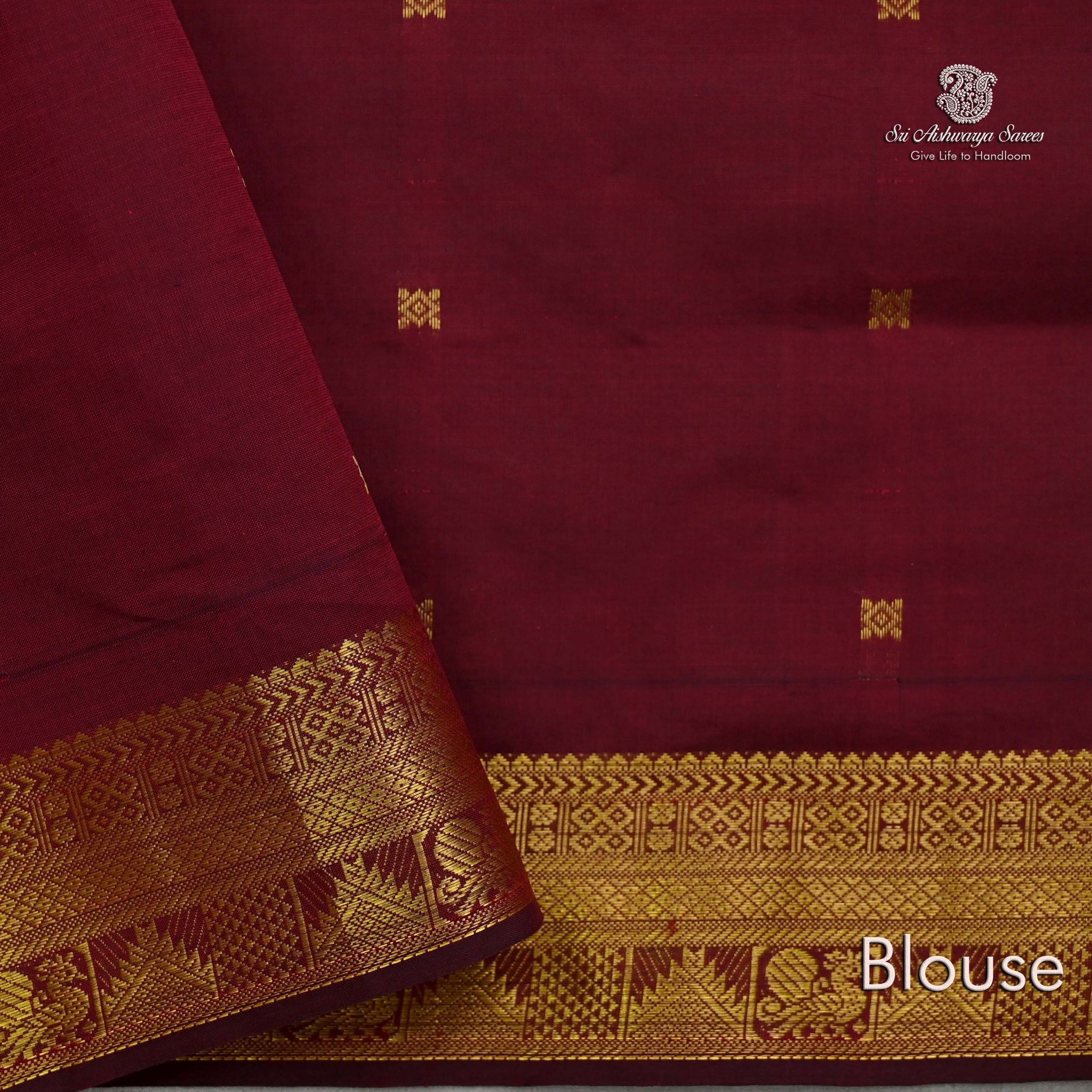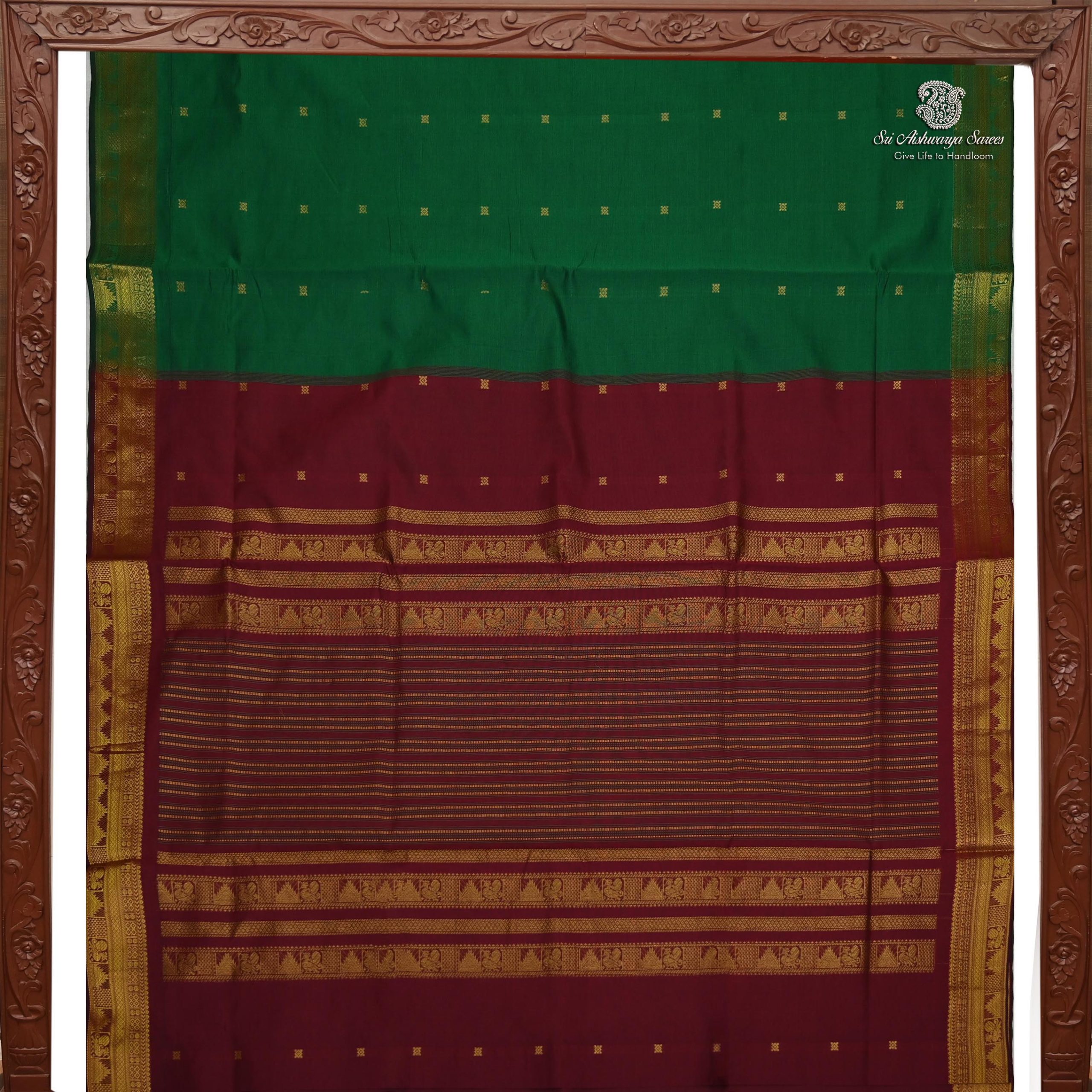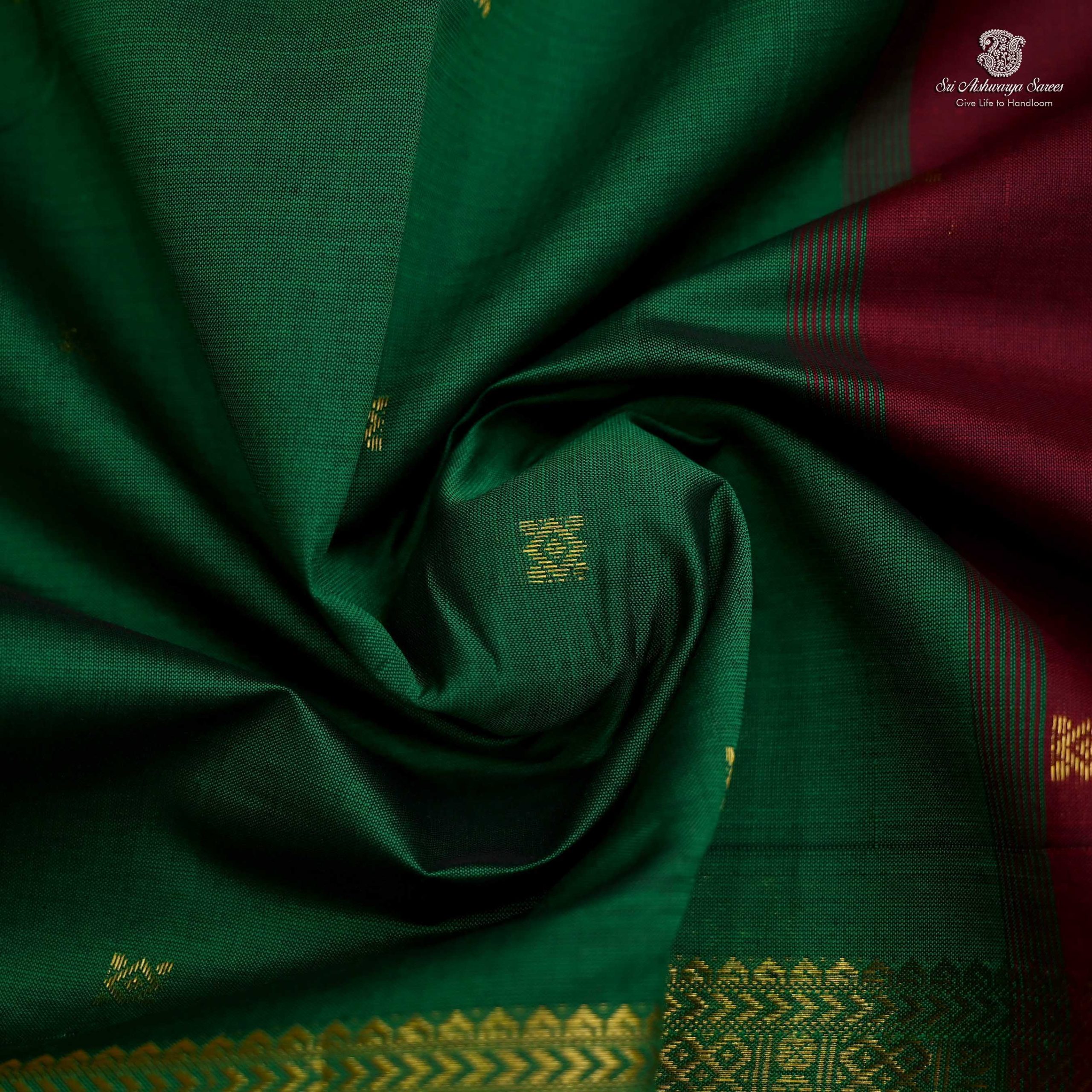 • Semi silk cotton saree in forest green features elegant butta designs across the body. Enhanced with a maroon rich pallu and blouse, it carries a golden zari border of peacock and temple motifs. A graceful pick for festive wear, offering a blend of tradition and style.
