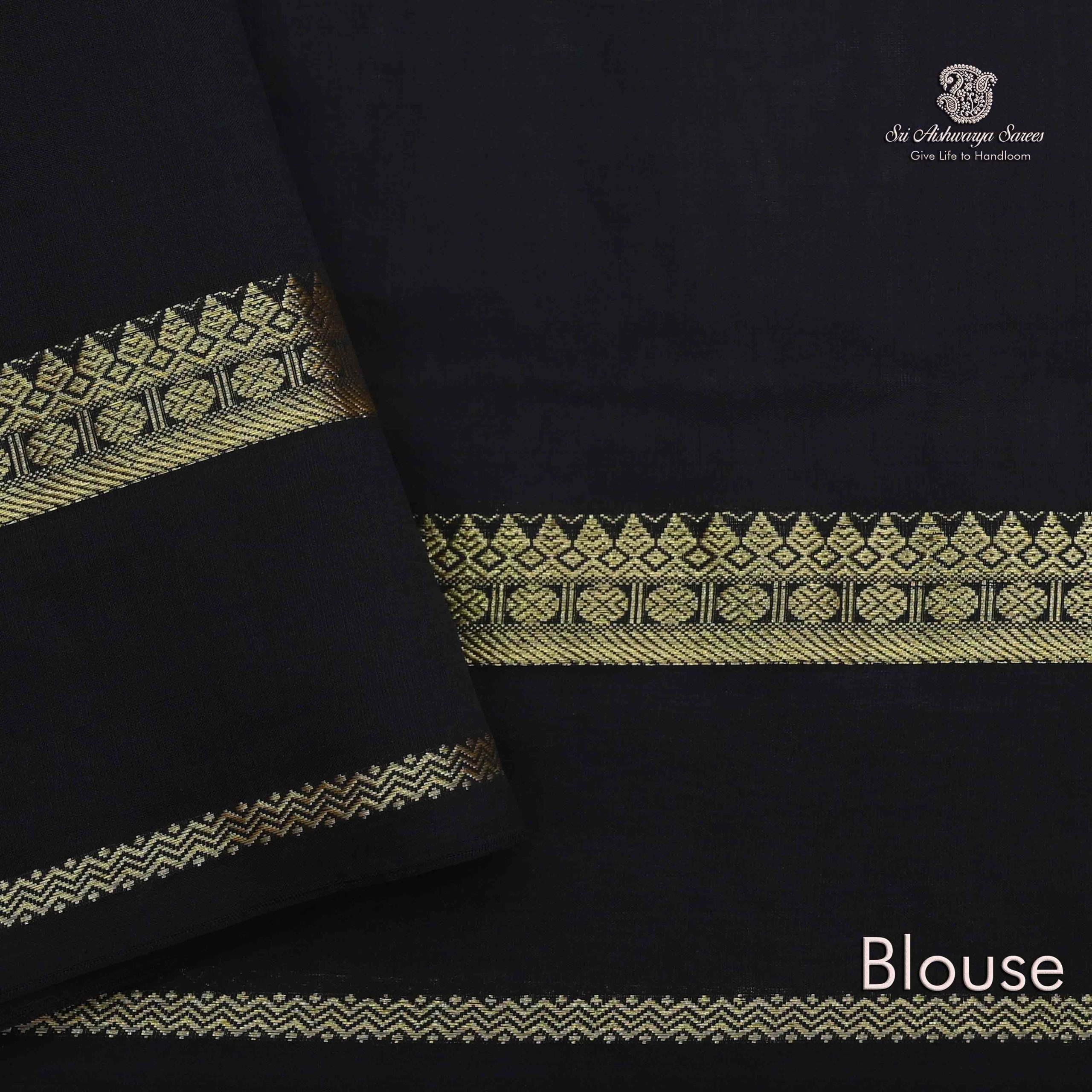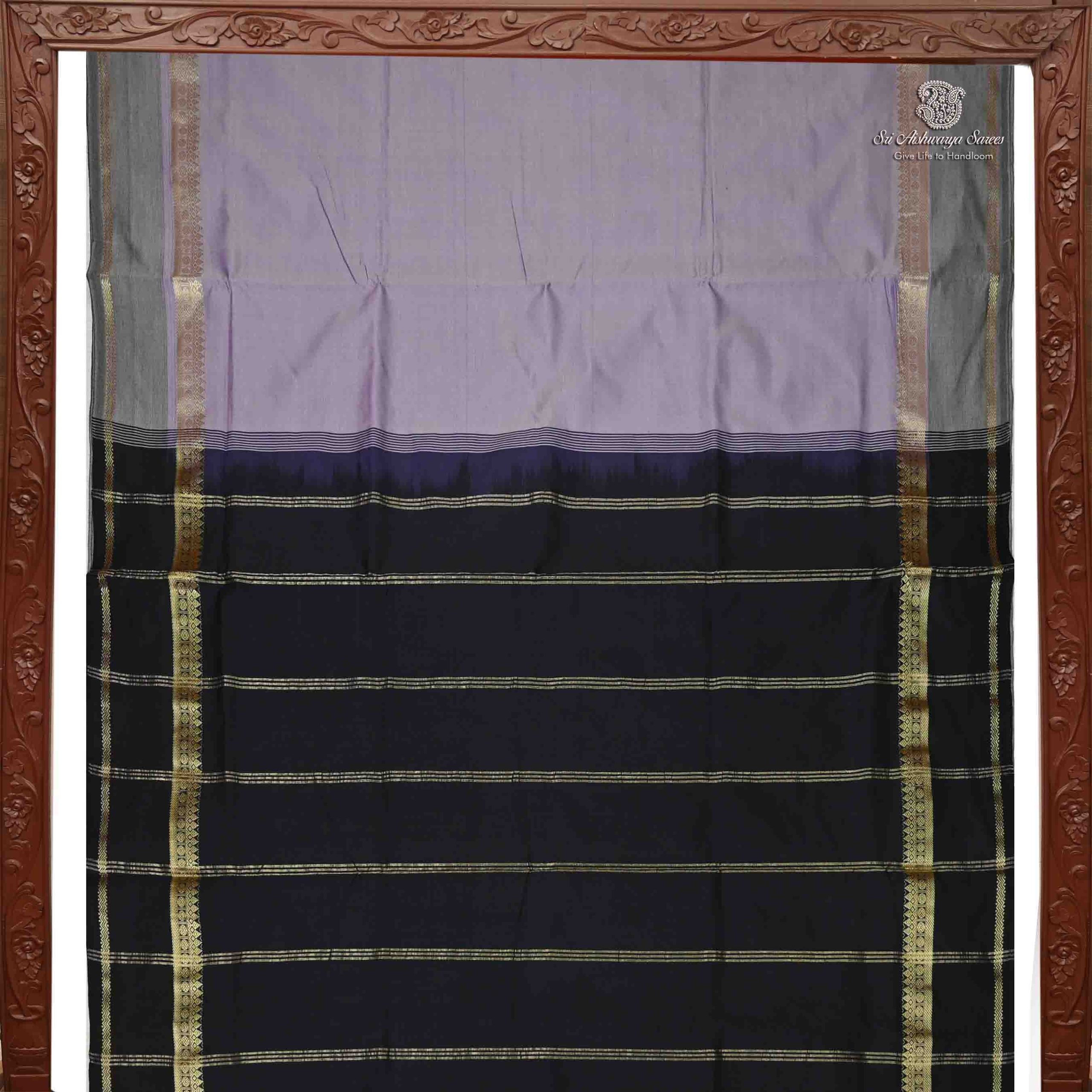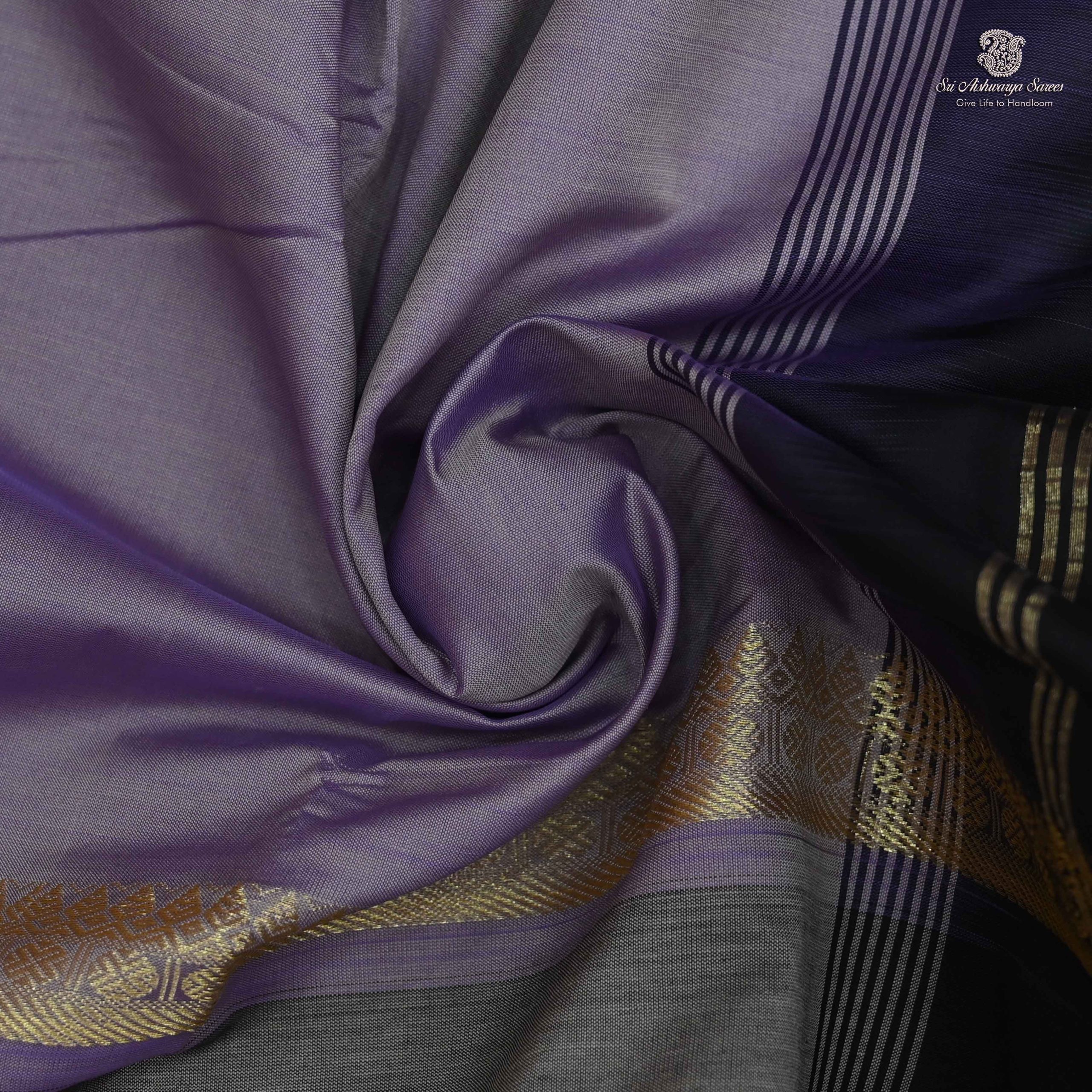 A rich Lilac semi‑silk cotton saree woven with understated Veldhari stripes, elegantly accented by a sleek black pallu and matching blouse for a timeless, sophisticated ensemble