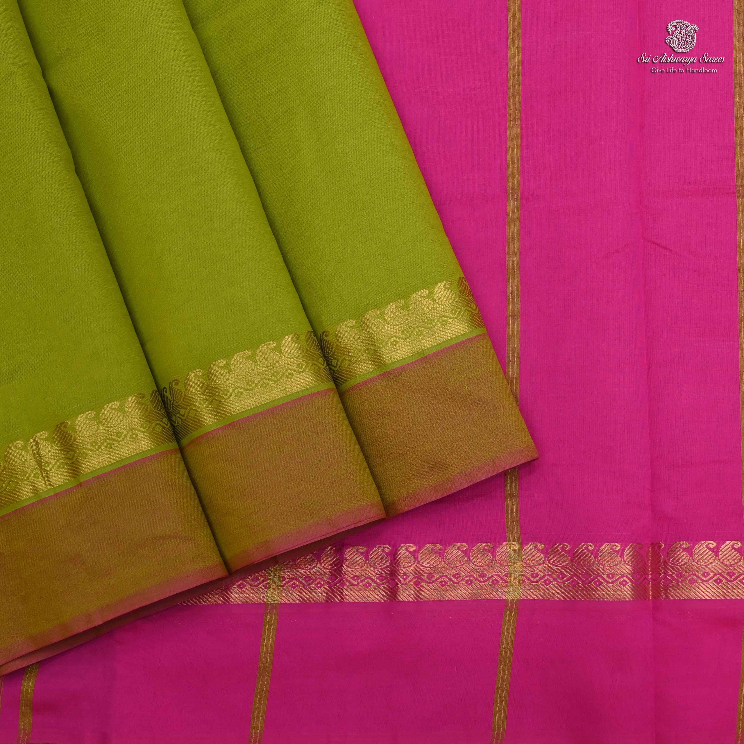 Shop this elegant semi silk cotton saree featuring a Lime Green body with a rich pink pallu—perfect for festive and traditional occasions.