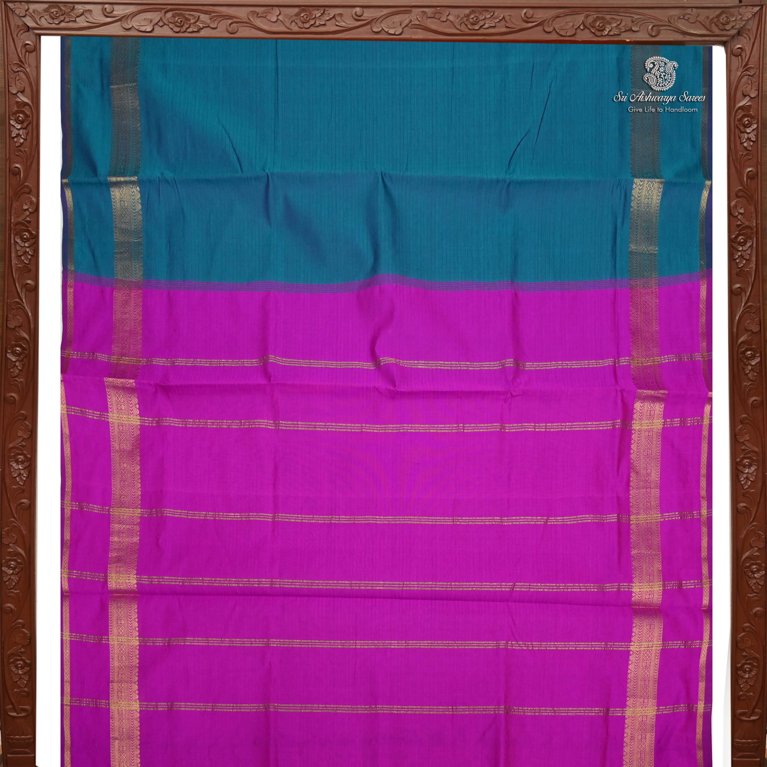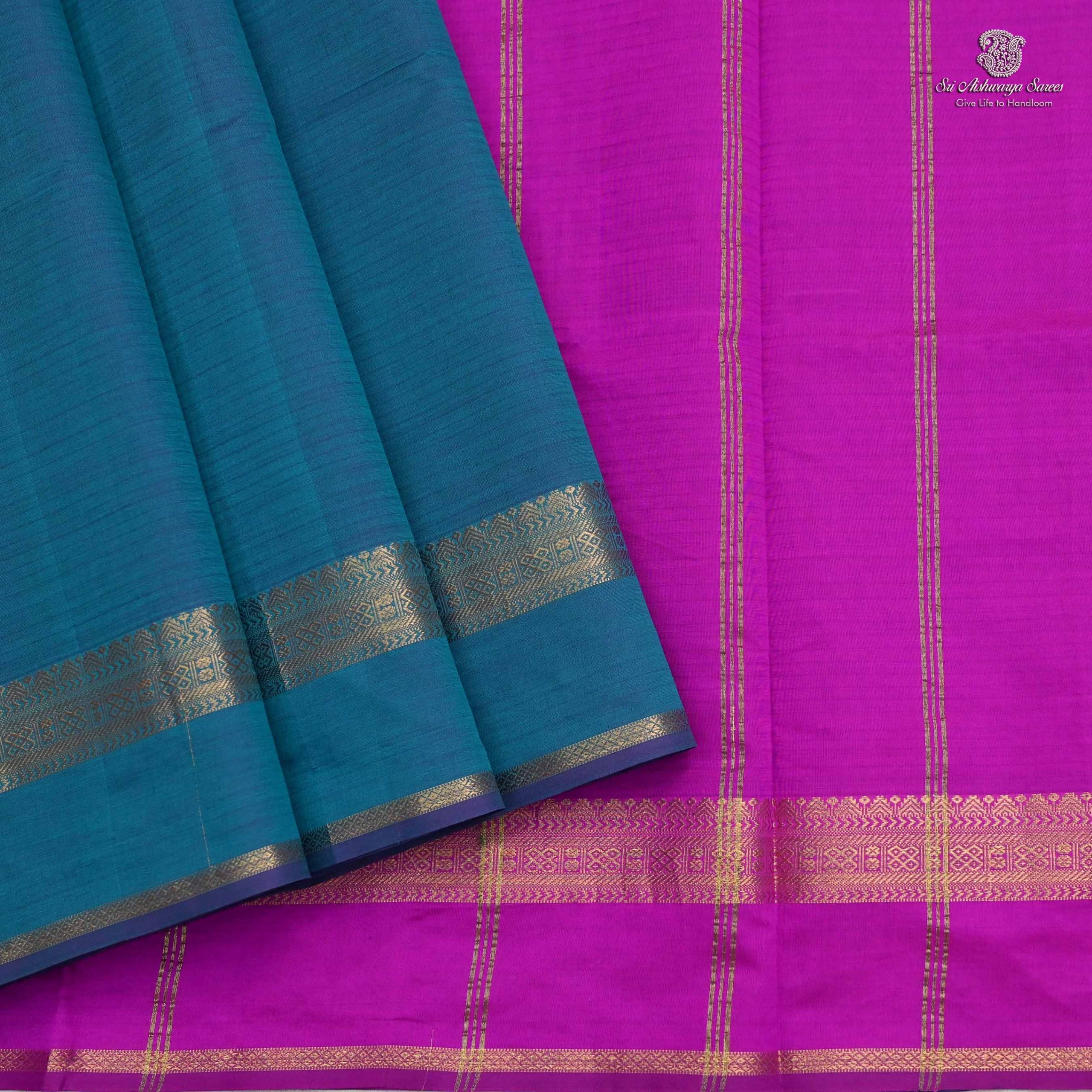 Vibrant semi-silk cotton saree with a Magenta Pink body and a contrasting peacock green pallu for a traditional look.