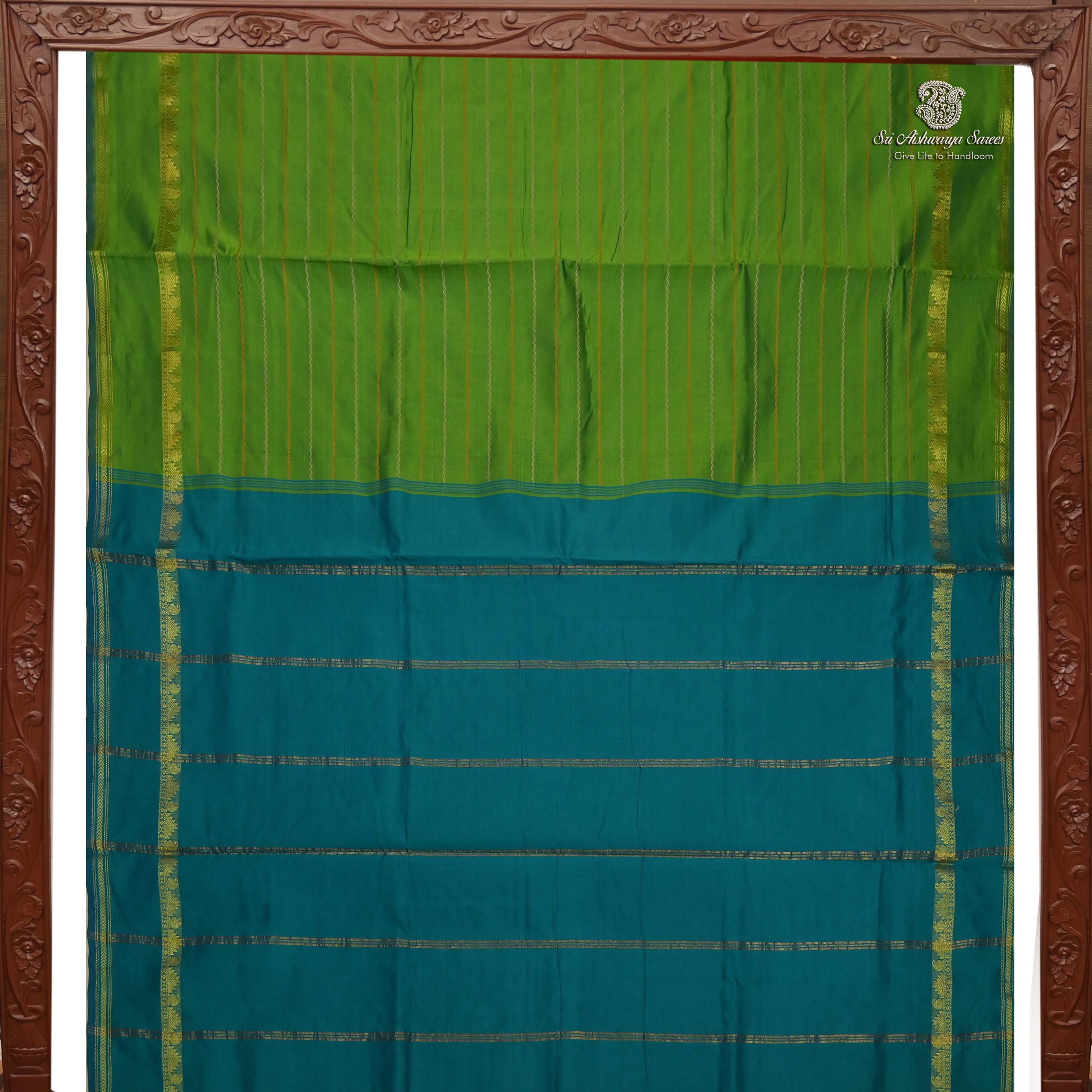 Vibrant Veldhari Design semi-silk cotton saree with a Medium Parrot Green body and a contrasting Dual Dark Teal pallu for a traditional look.