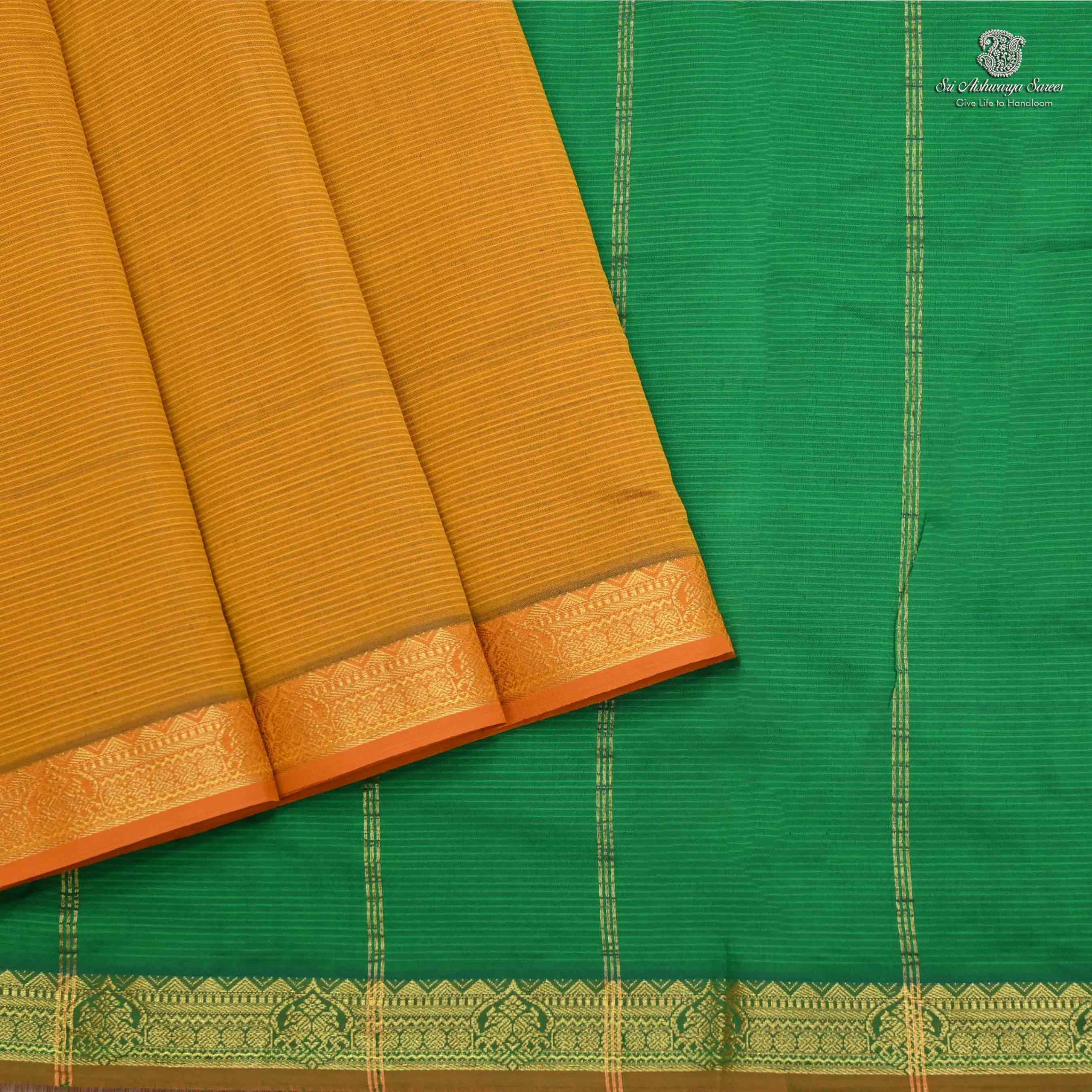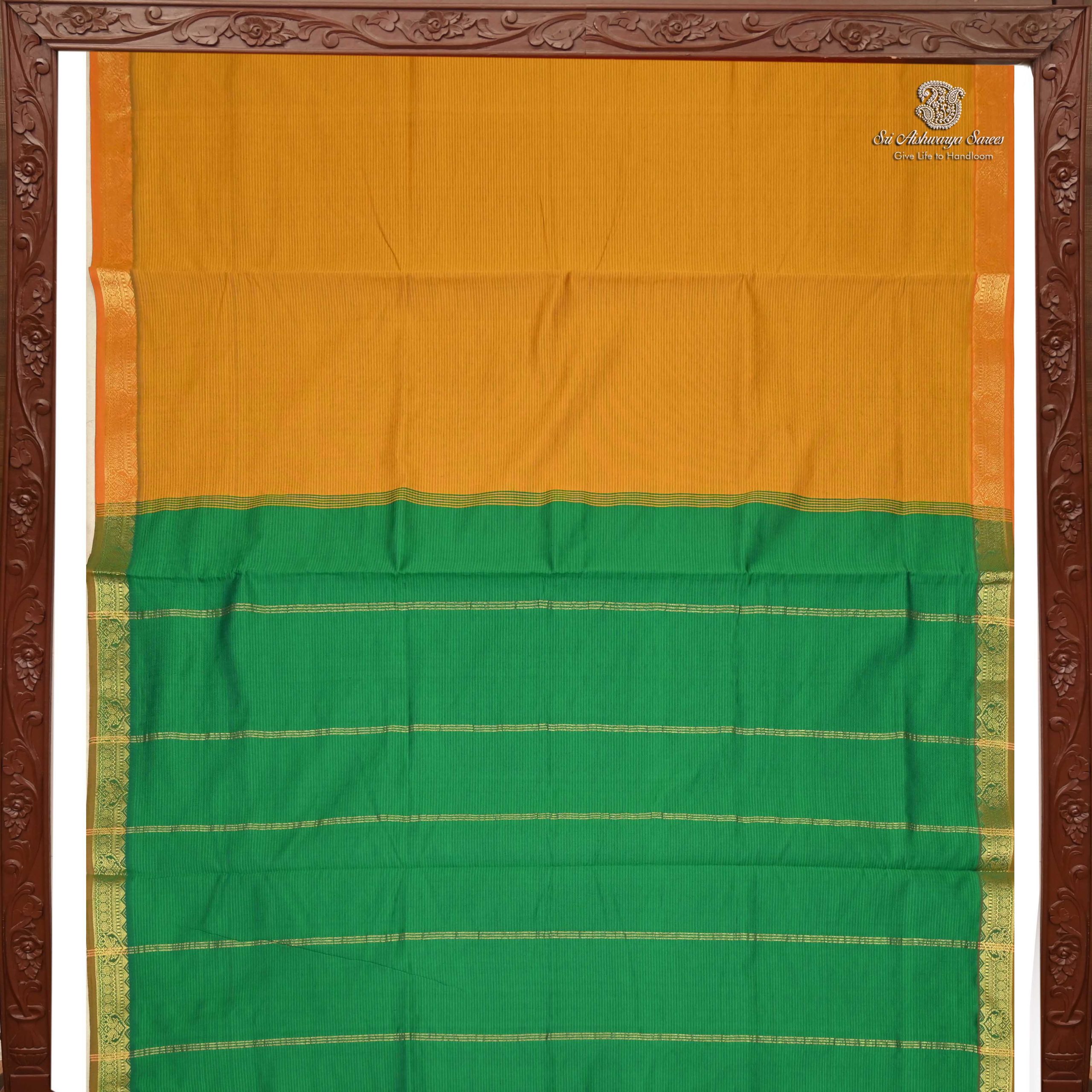 Vibrant semi silk cotton saree in mustard yellow with green pallu, ideal for a bold and elegant traditional look.