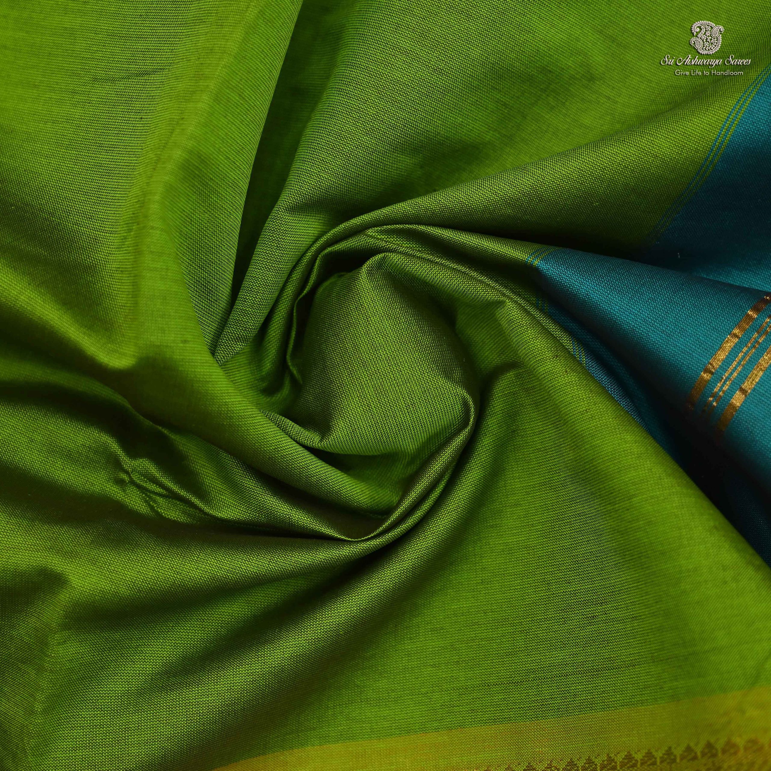 Vibrant semi silk cotton saree in Olive Green with Teal Blue pallu, ideal for a bold and elegant traditional look.