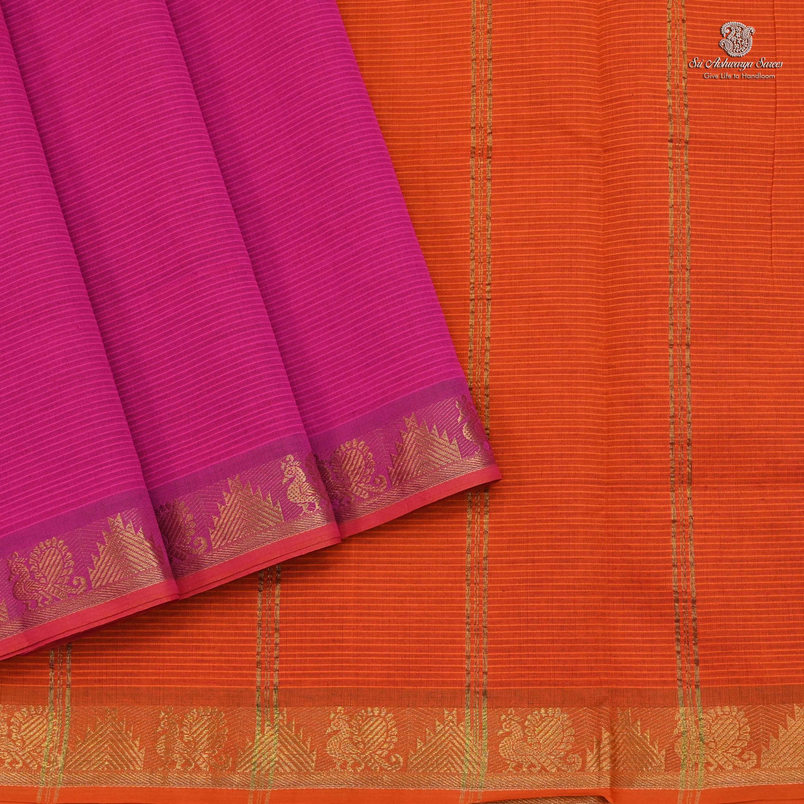 Vibrant semi silk cotton saree in Rani Pink with Sunset Orange pallu, ideal for a bold and elegant traditional look.