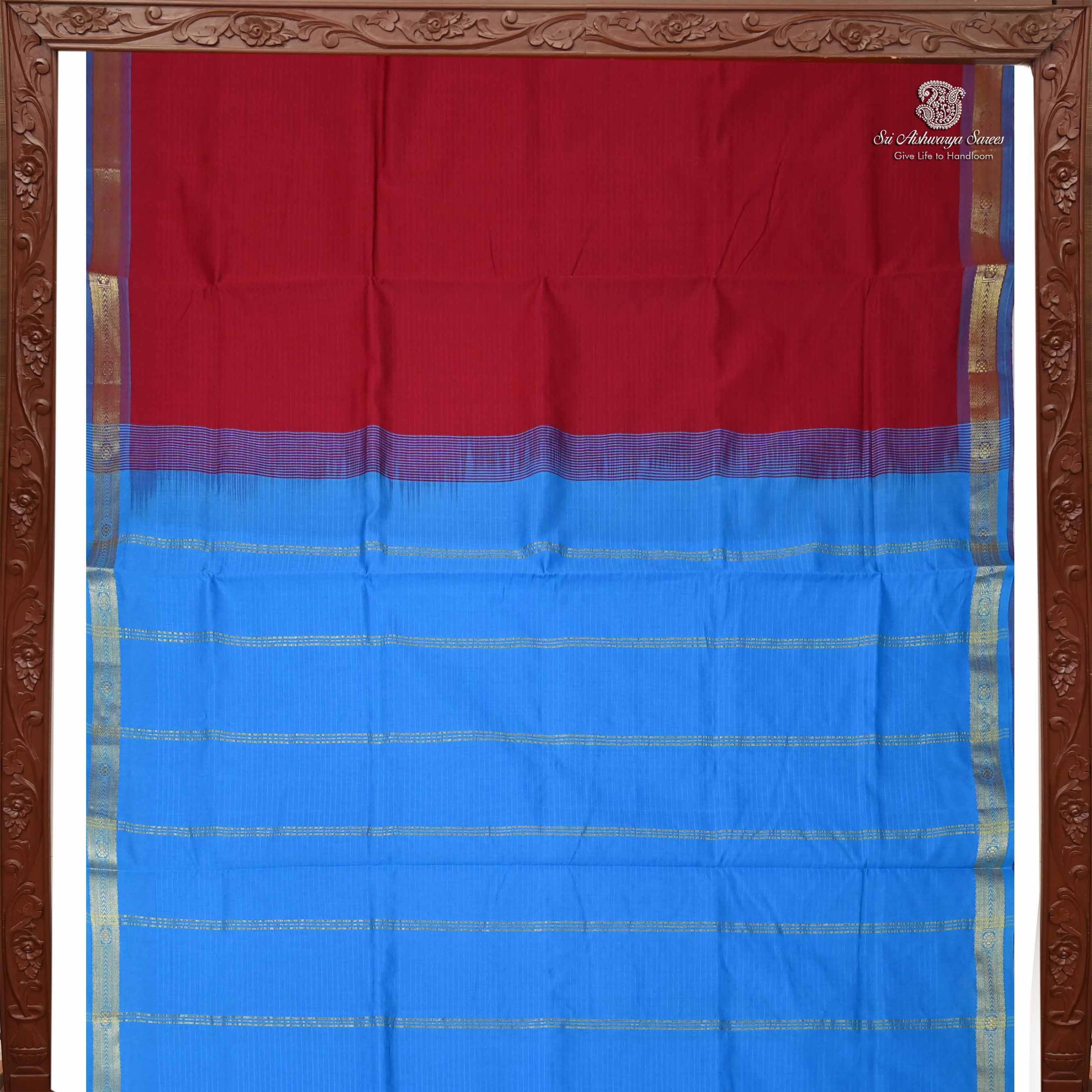 Shop this elegant semi silk cotton saree featuring a Red body with a rich blue pallu—perfect for festive and traditional occasions.