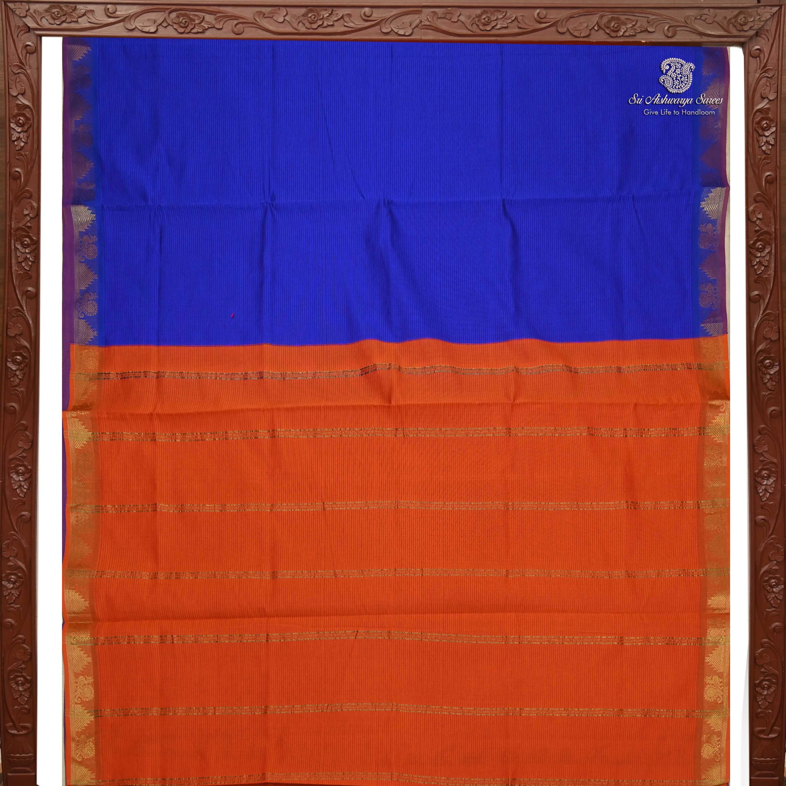 Vibrant semi silk cotton saree in Royal blue with Sunset orange pallu, ideal for a bold and elegant traditional look.