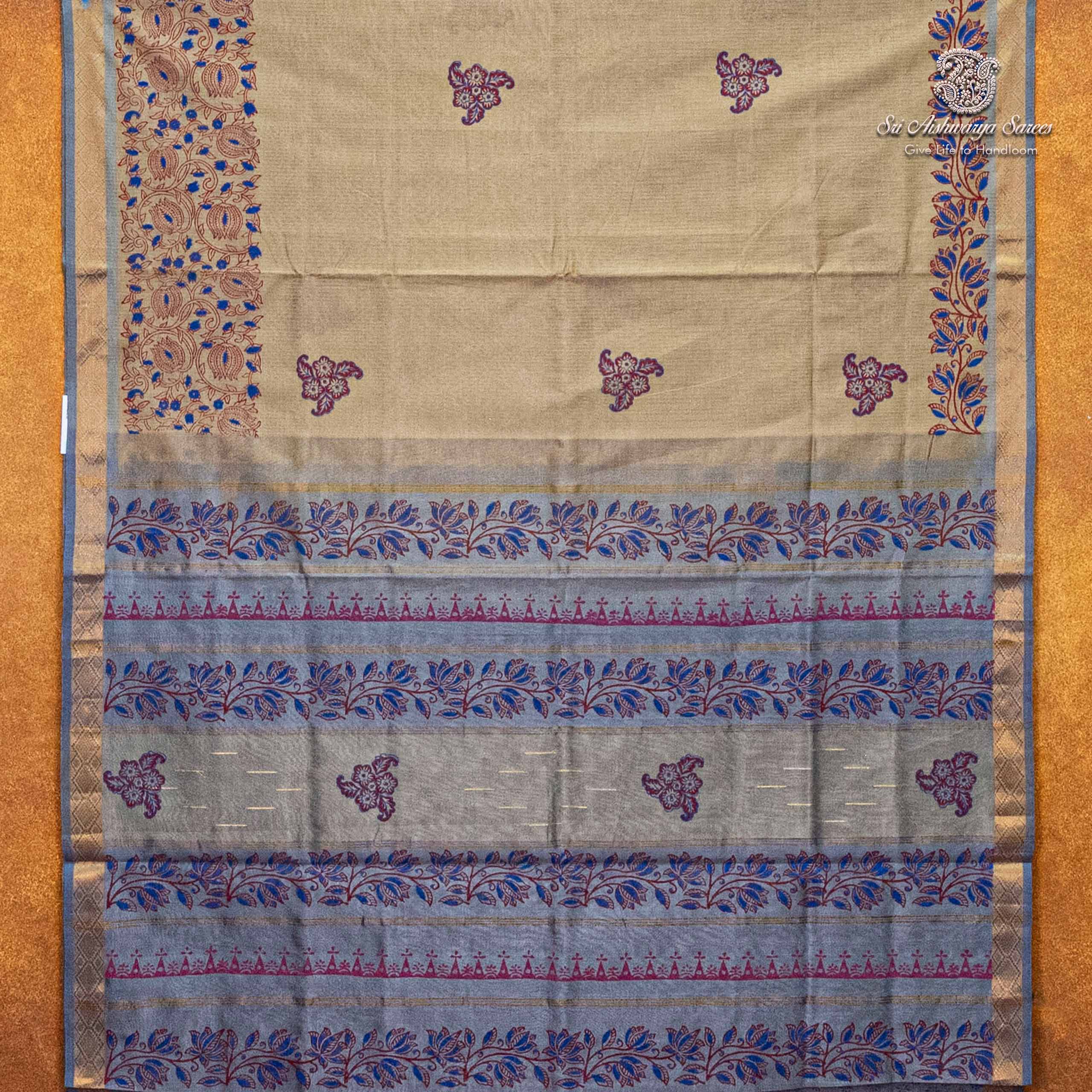 Pure silk cotton printed saree with a beige body and bluish grey pallu, adorned with elegant motifs in hand block print, creating a refined and graceful appeal.