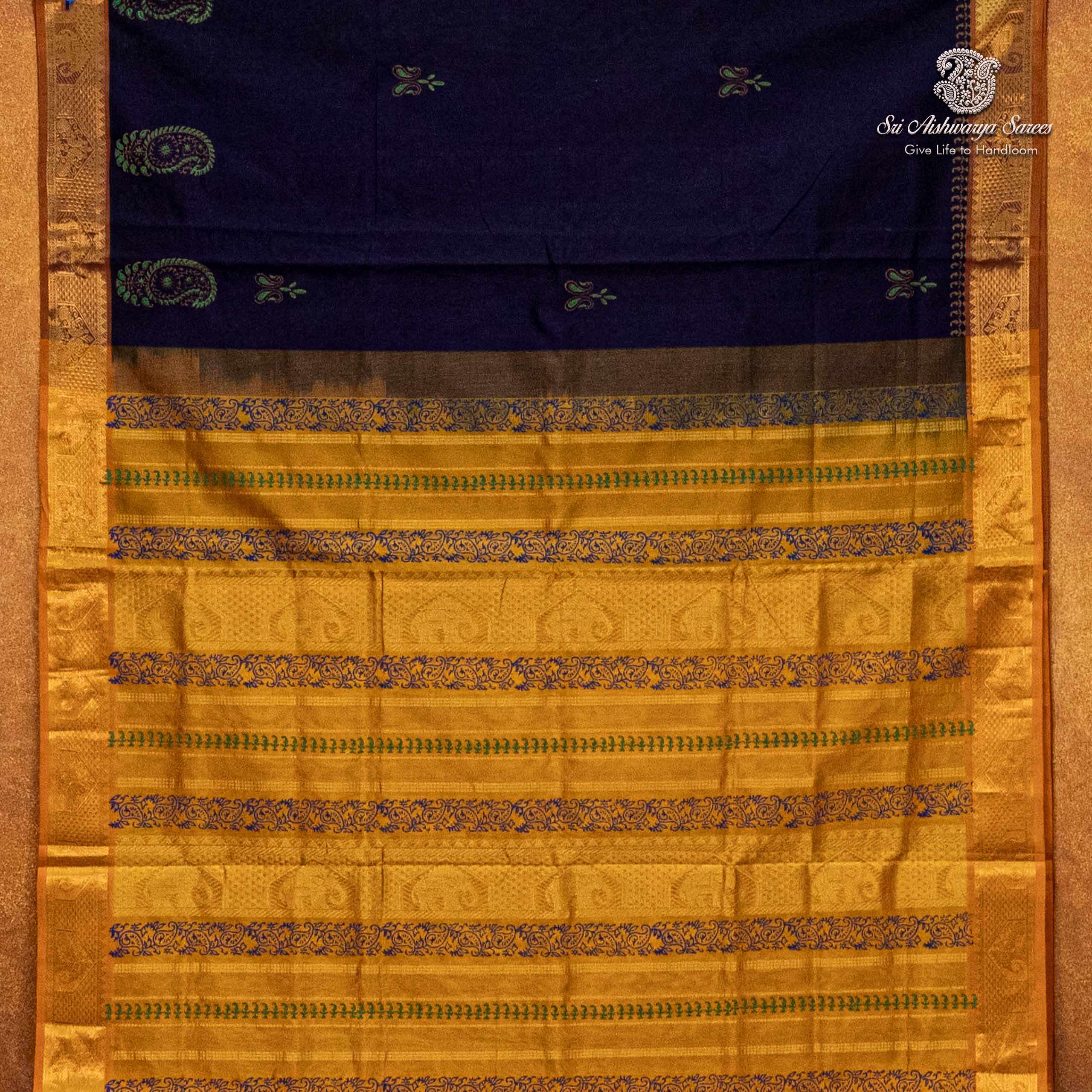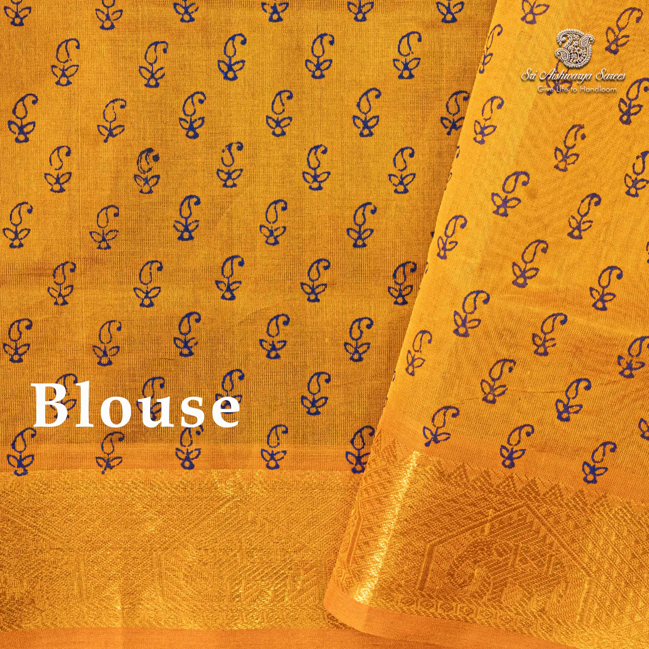 Pure silk cotton printed saree with a dark navy blue body and mustard yellow pallu, adorned with elegant motifs in hand block print, creating a refined and graceful appeal.