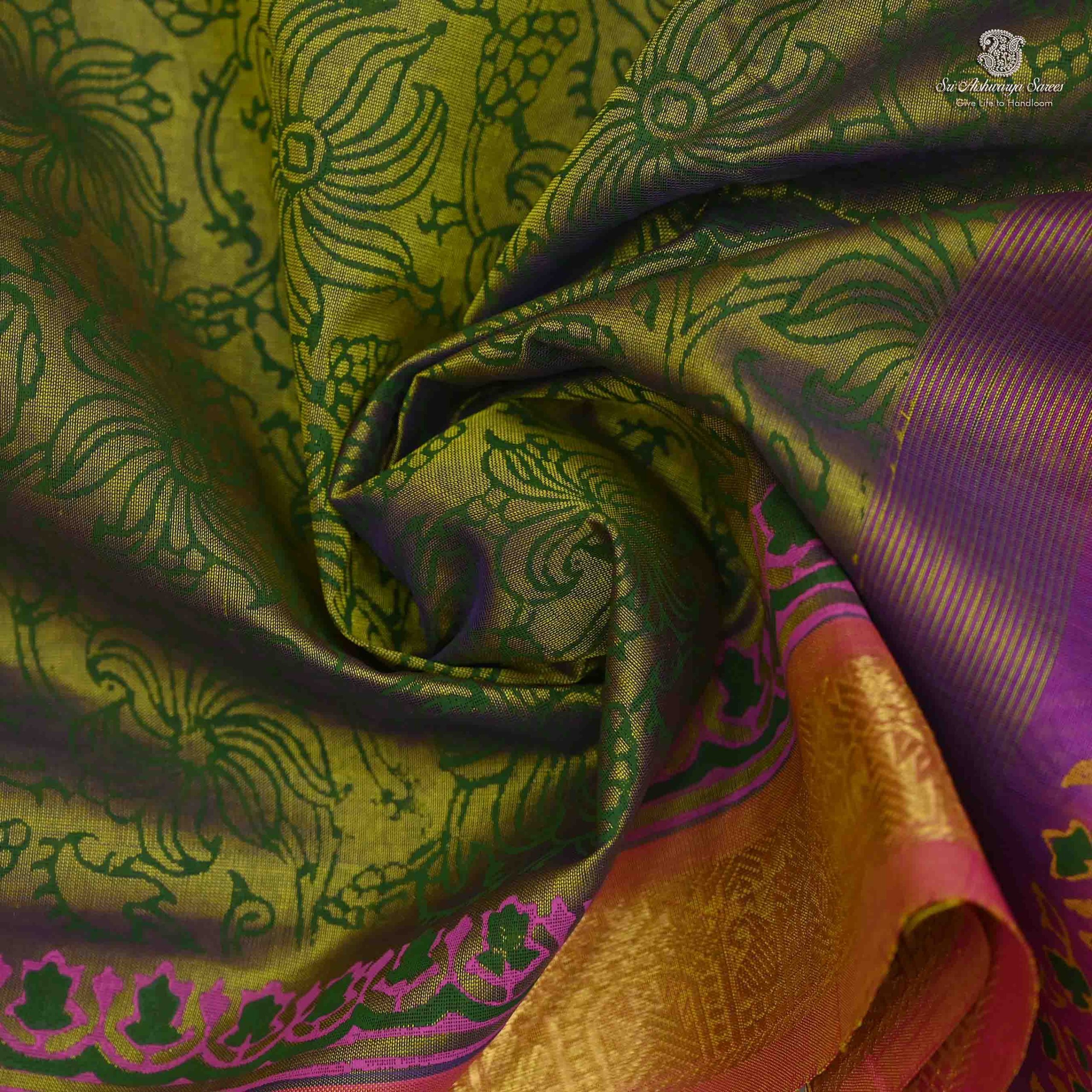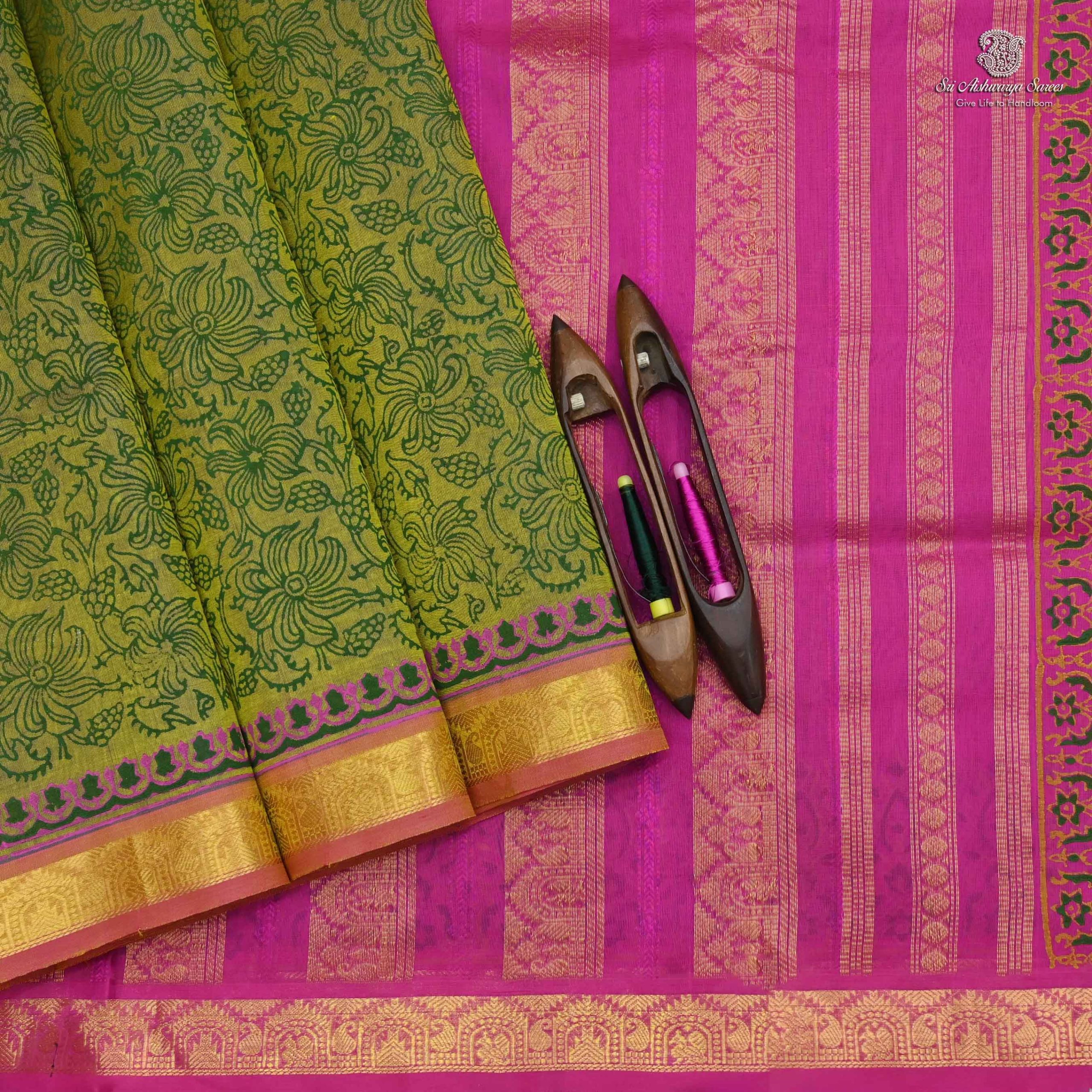 Pure Silk Cotton Printed Saree with an olive green body and pink pallu, adorned with elegant all-over creeper design for a graceful traditional look.