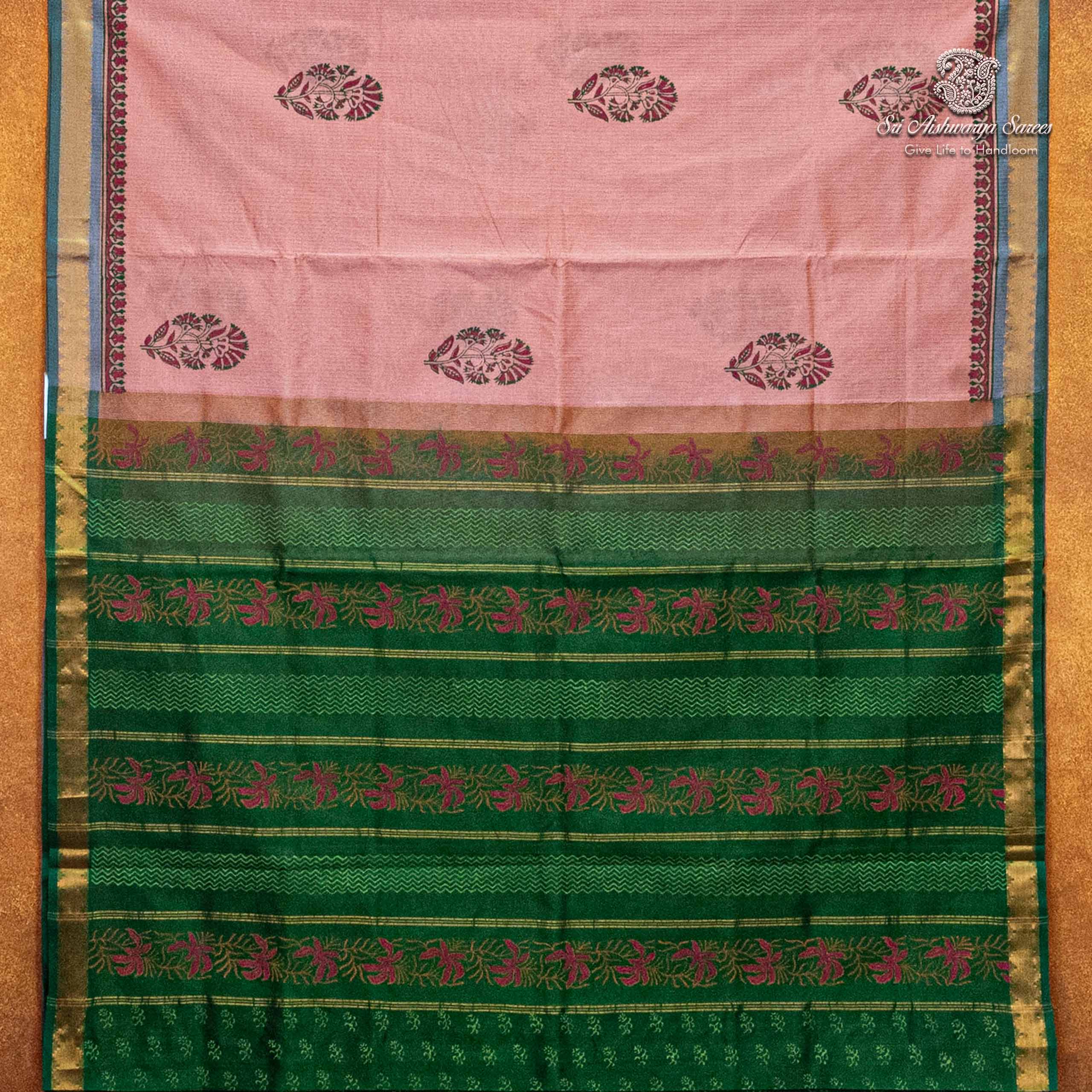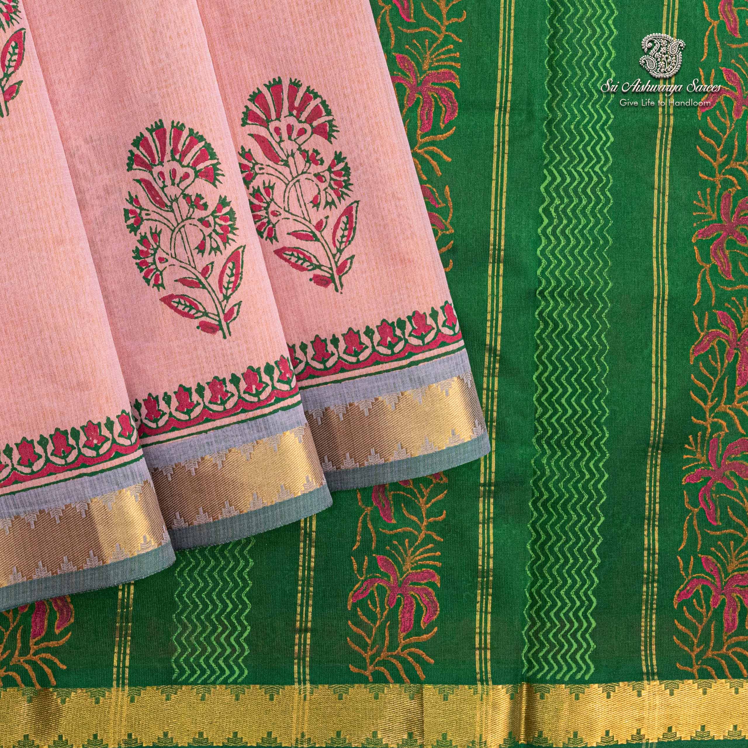 Pure silk cotton printed saree with a peach body and green pallu, adorned with elegant motifs in hand block print, creating a refined and graceful appeal.