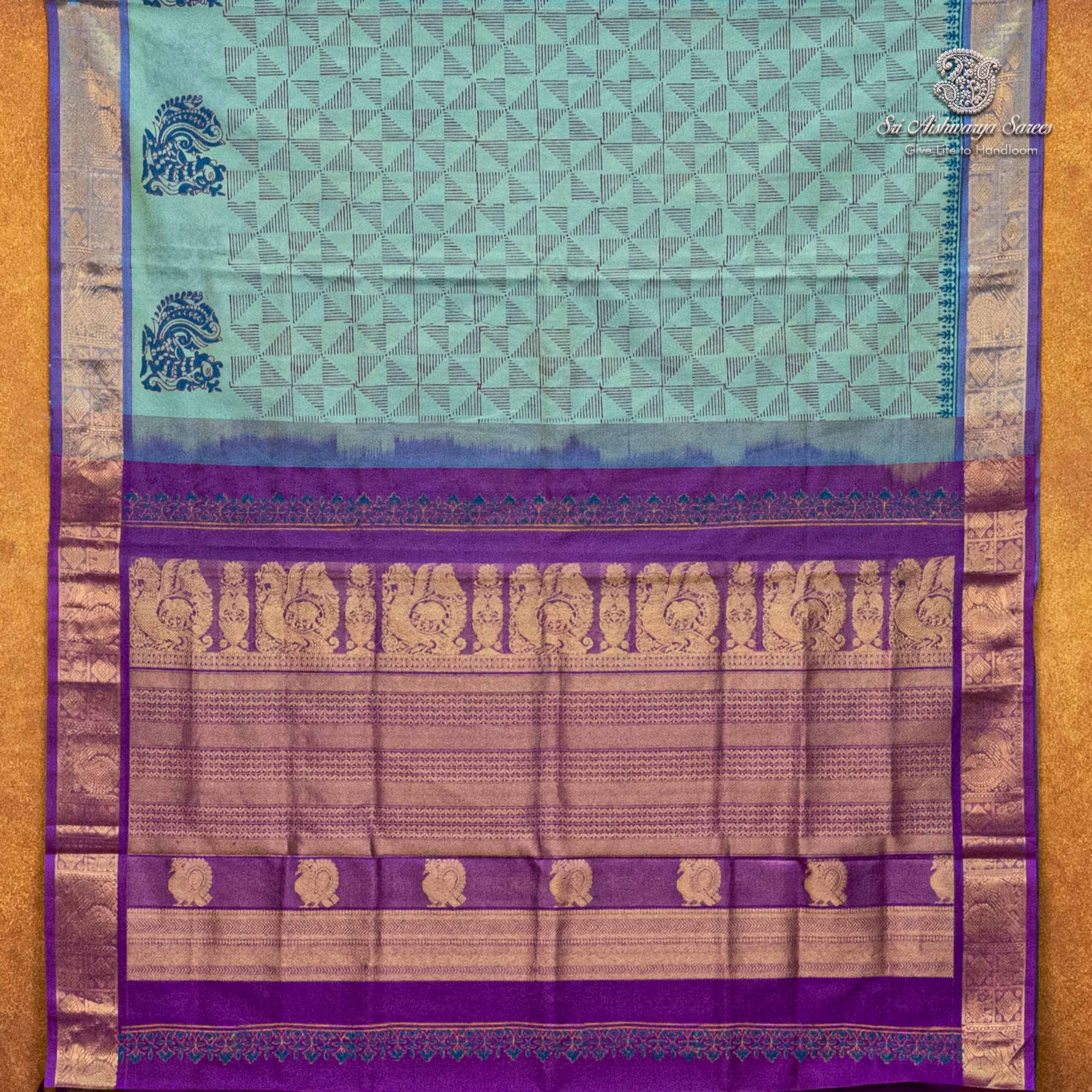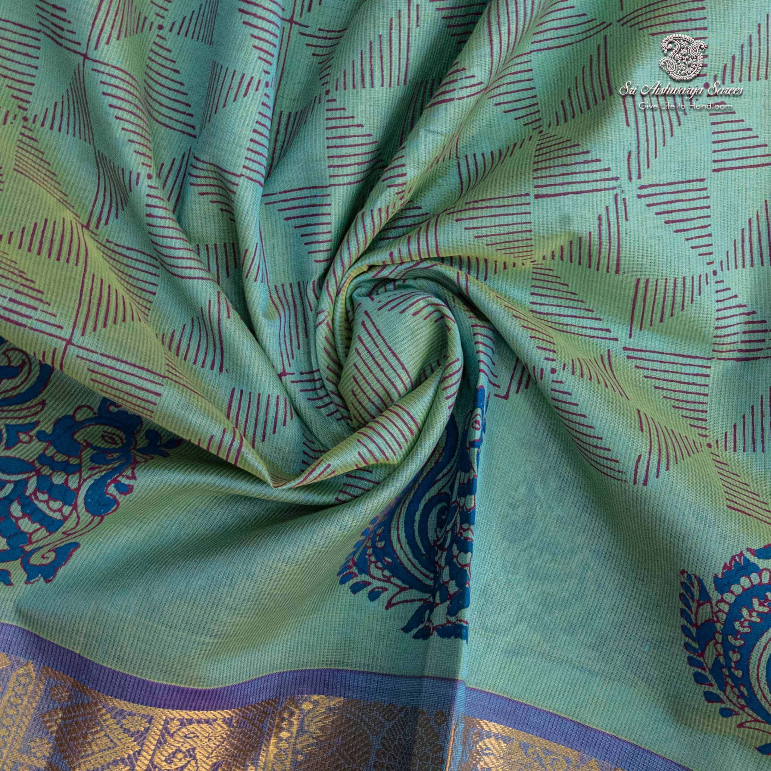 Pure silk cotton printed saree with a seafoam blue body and purple pallu, adorned with elegant motifs in hand block print, creating a refined and graceful appeal.