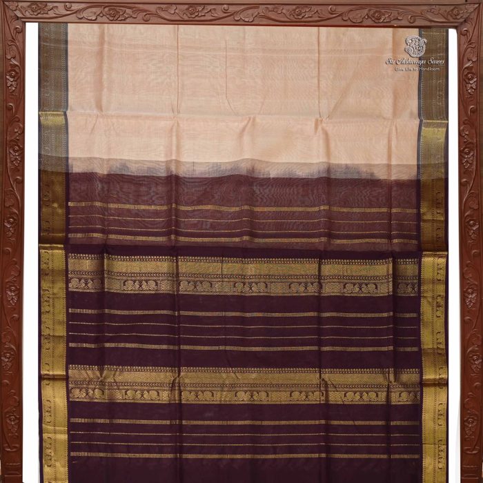 Pure silk cotton saree with a Beige body and rich brown pallu. A graceful handloom piece blending timeless tradition with elegant charm.