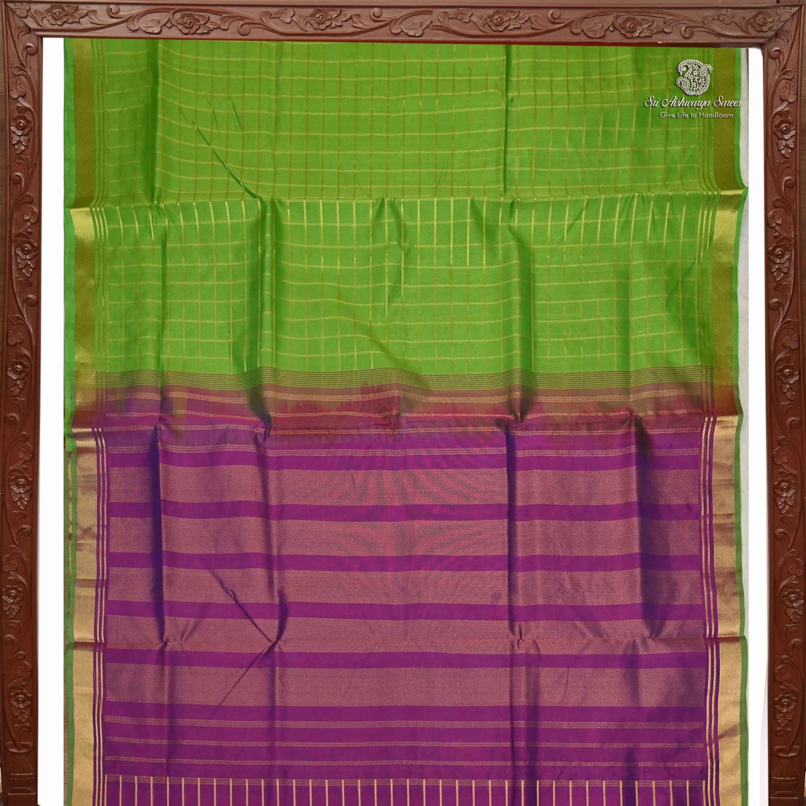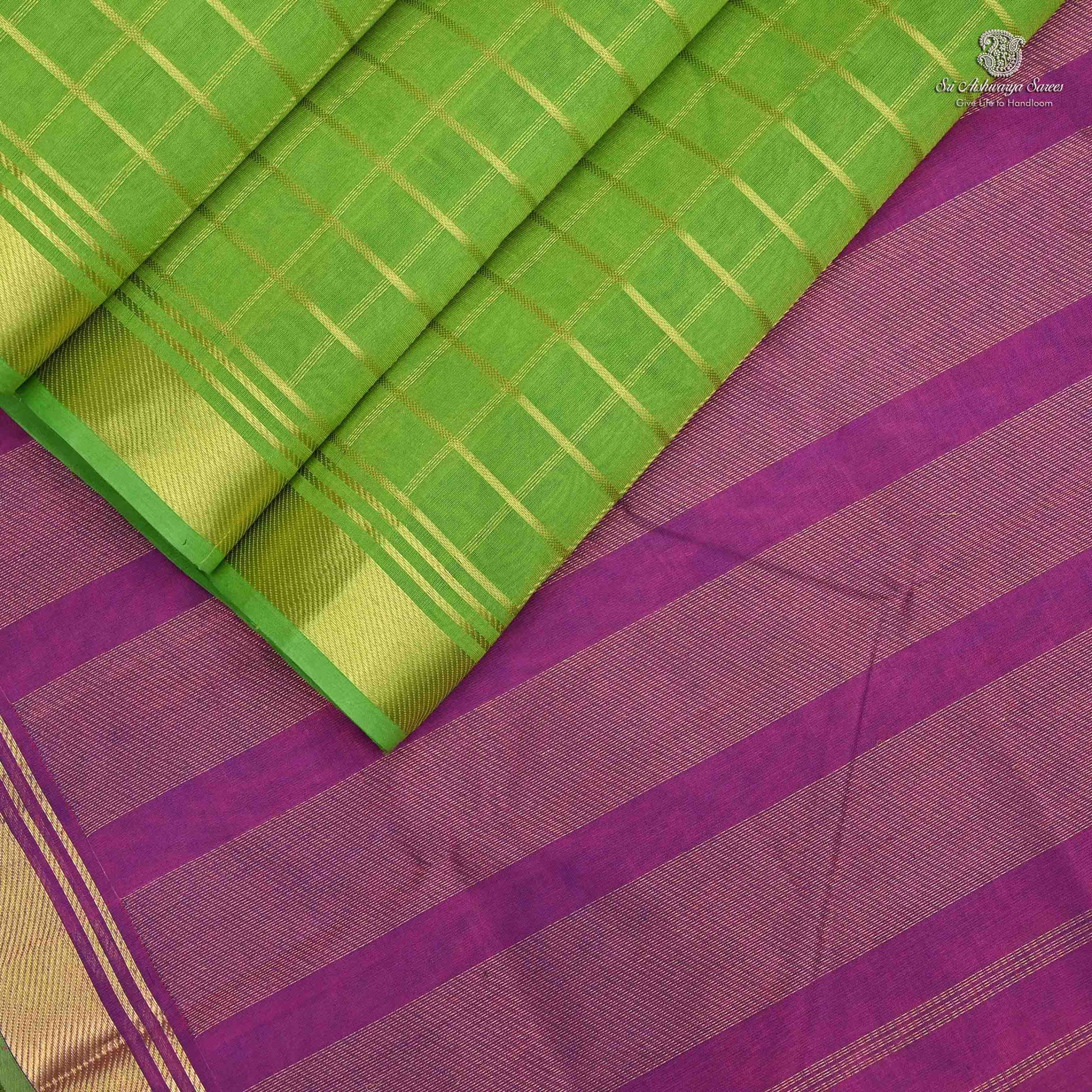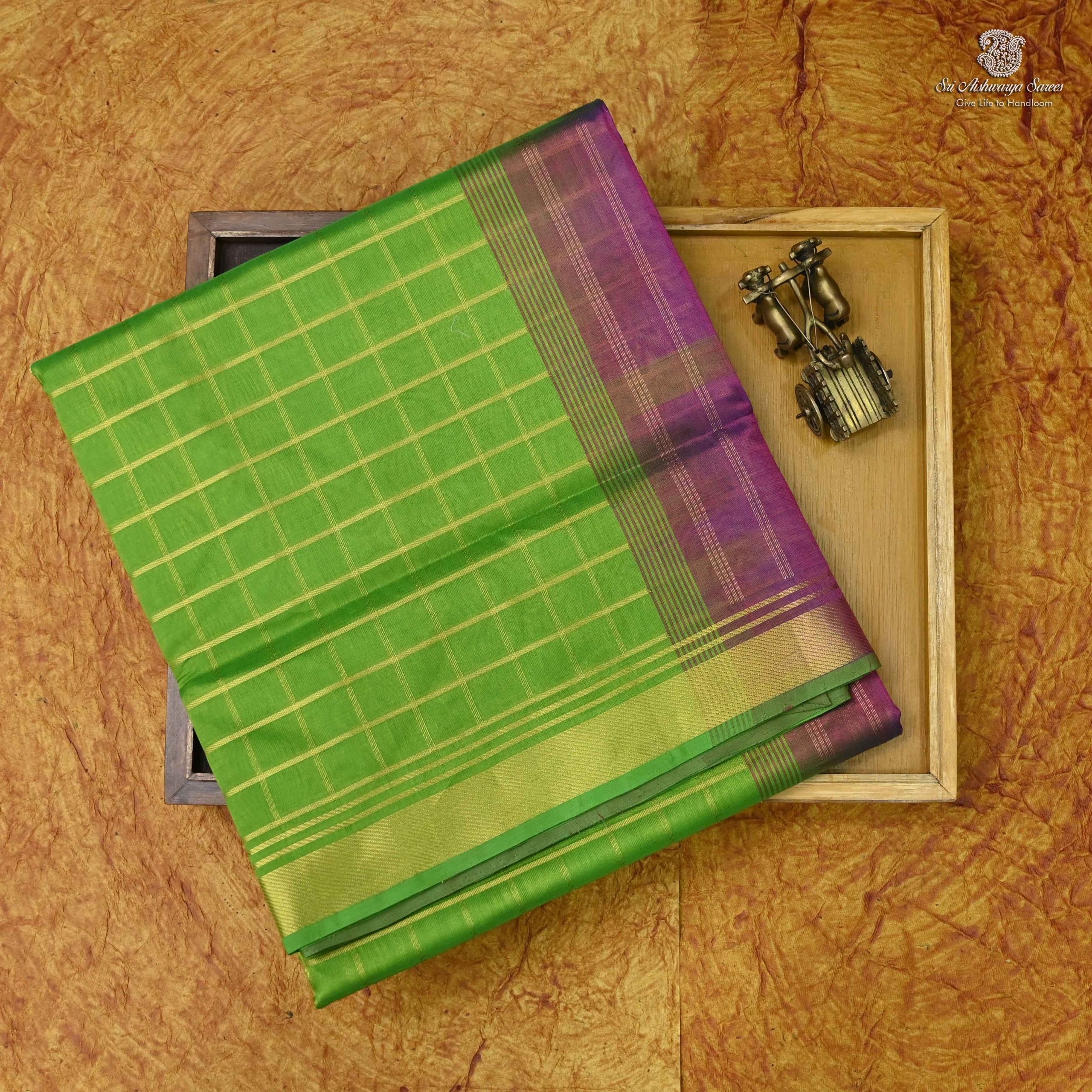 Elegant silk cotton saree in green with delicate zari checks, complemented by a rich pallu and a small, refined border—perfect for festive and formal occasions.