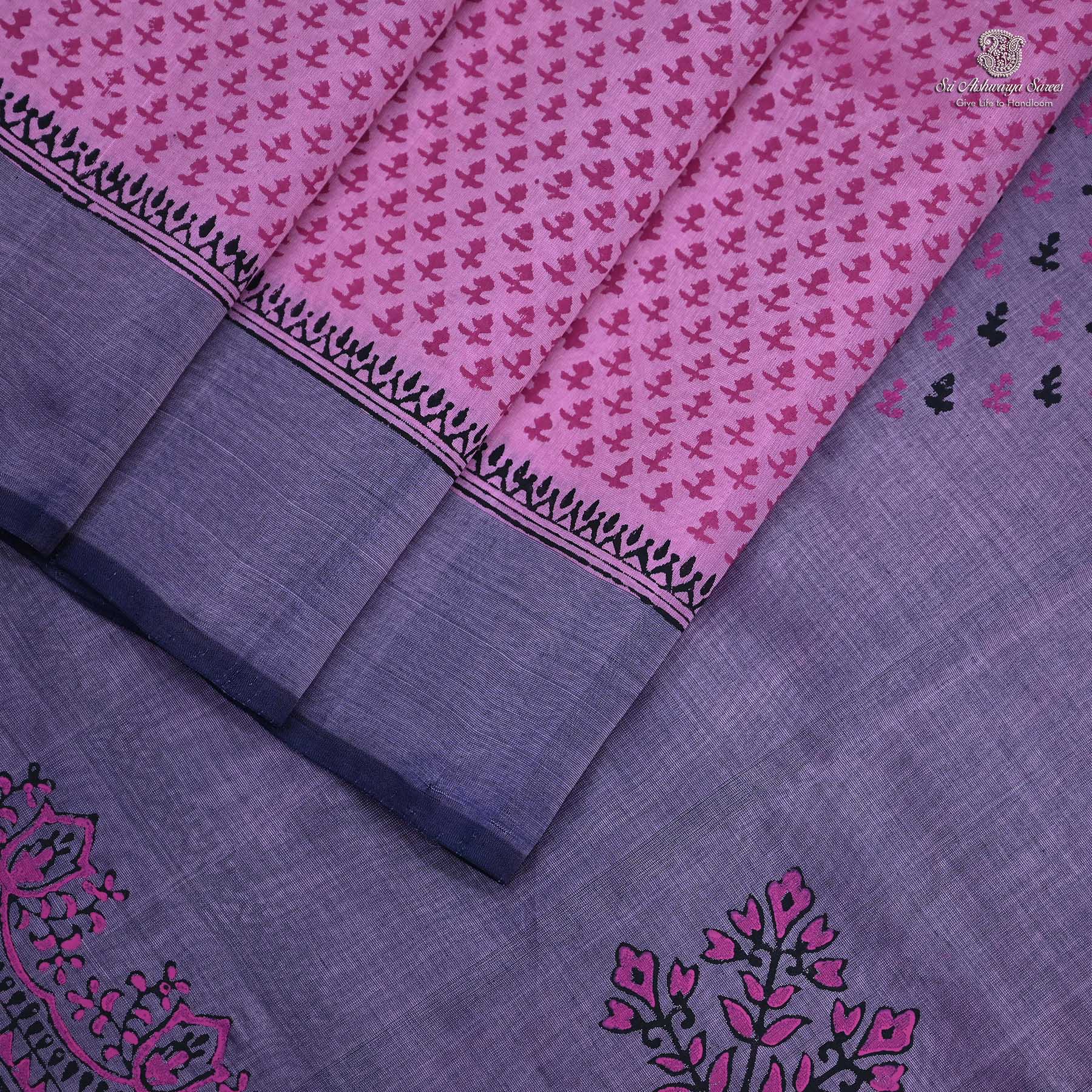 “Pure Silk Cotton Saree Printed with a rich light pink body, complemented by a green simple pallu and adorned with elegant all-over motif design.”