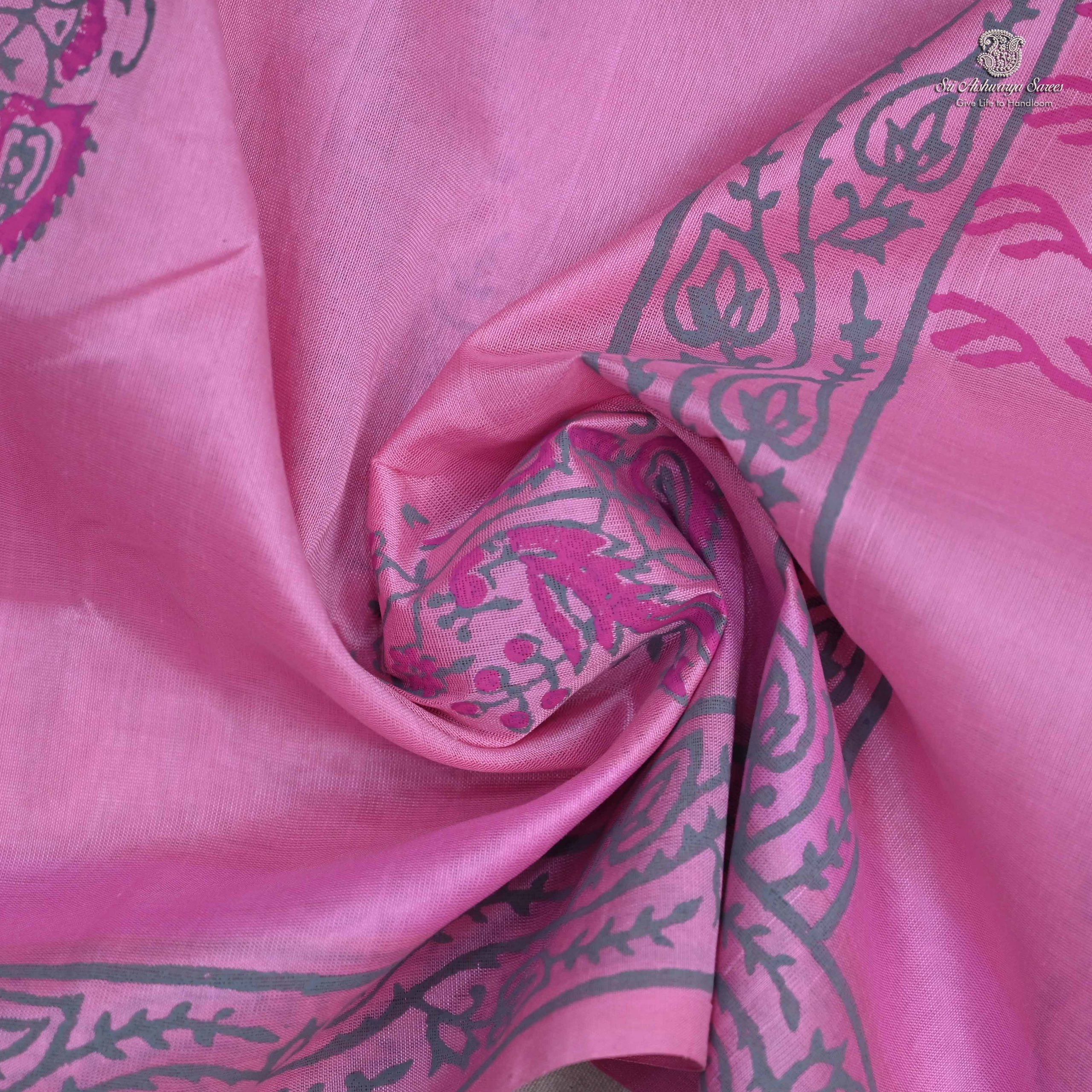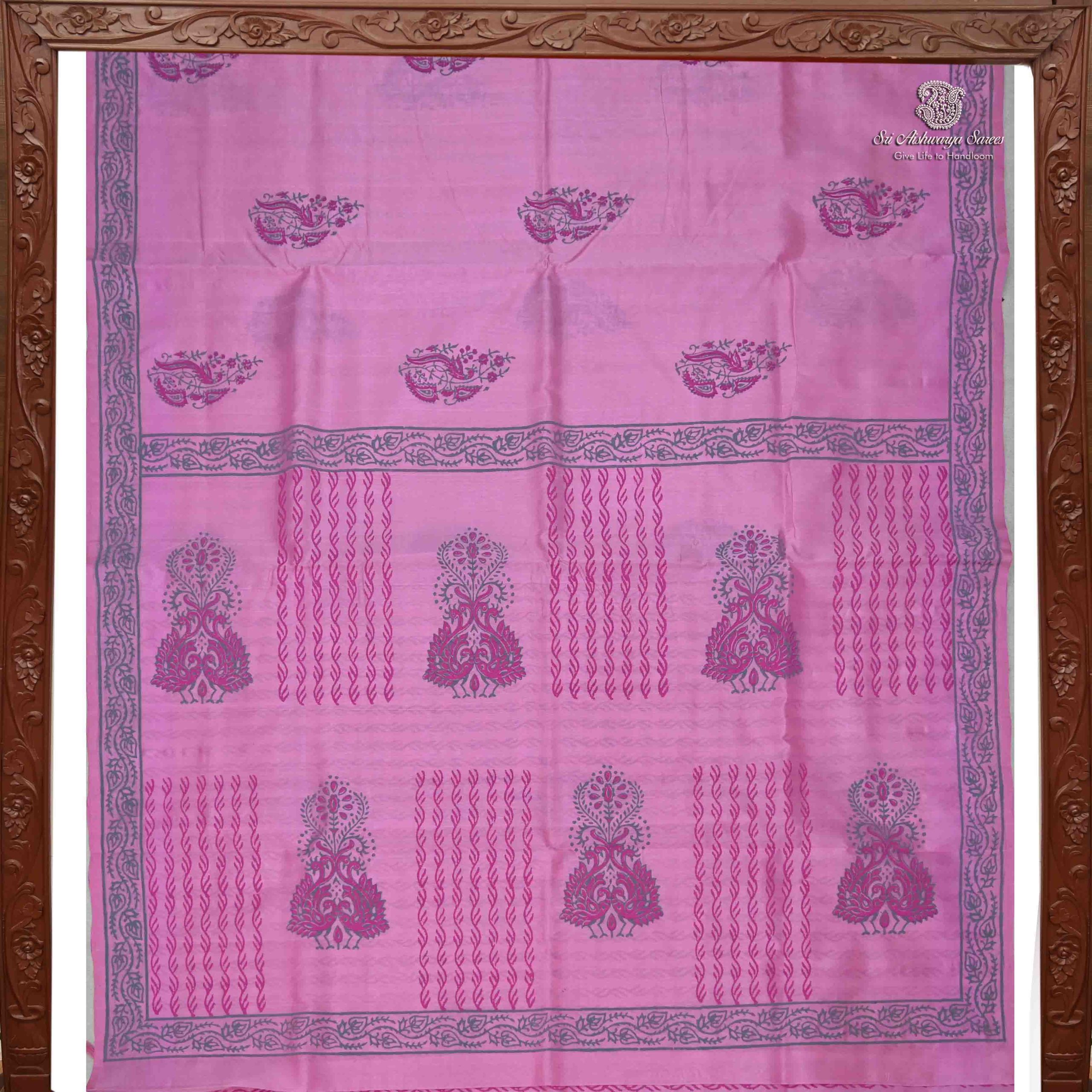 “Pure Silk Cotton Saree Printed with a rich light pink body, complemented by a green simple pallu and adorned with elegant all-over motif design.”