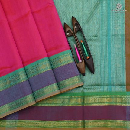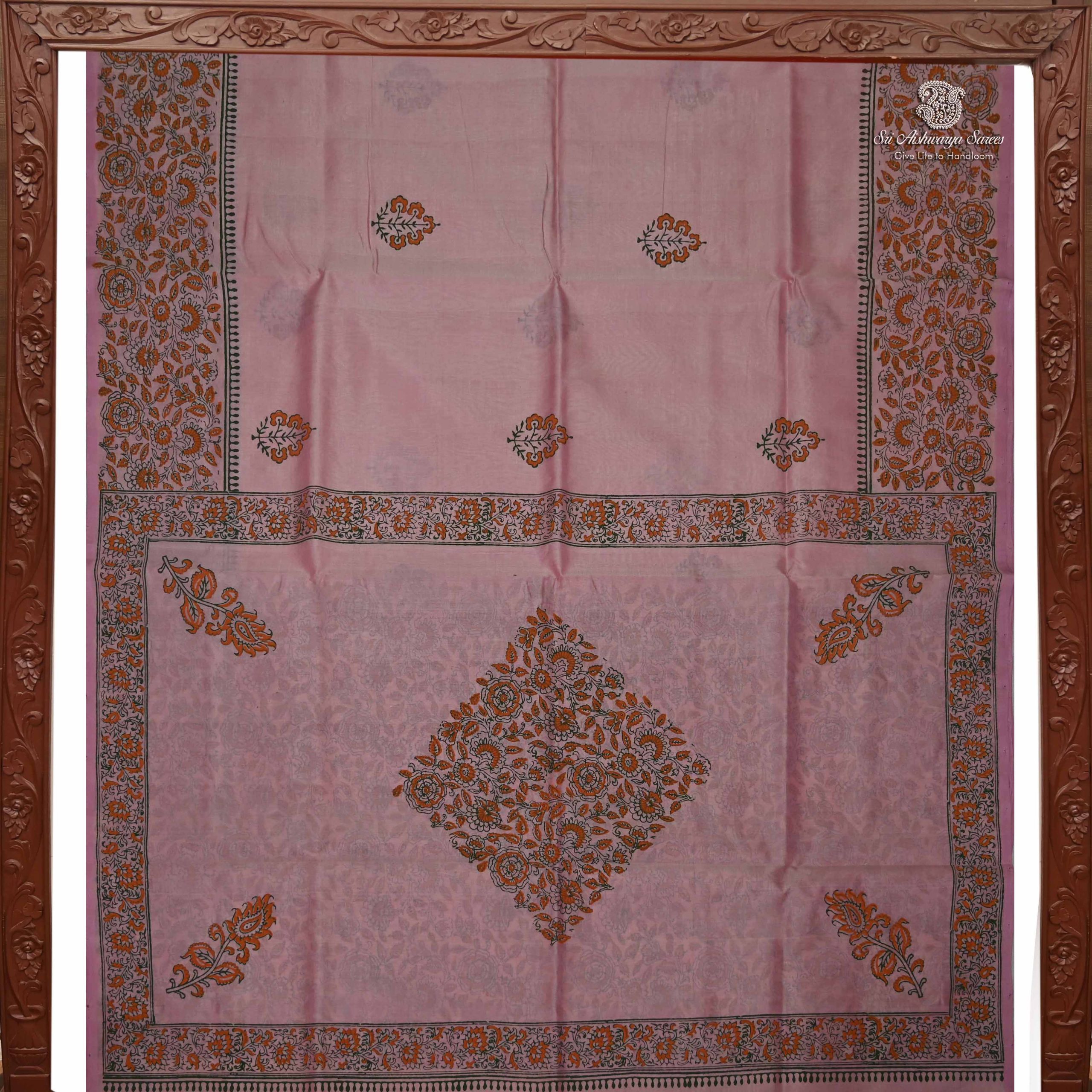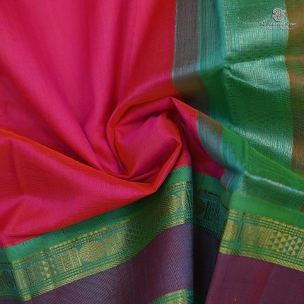 “Pure Silk Cotton Saree Printed with a rich light pink body, complemented by a green simple pallu and adorned with elegant all-over motif design.”