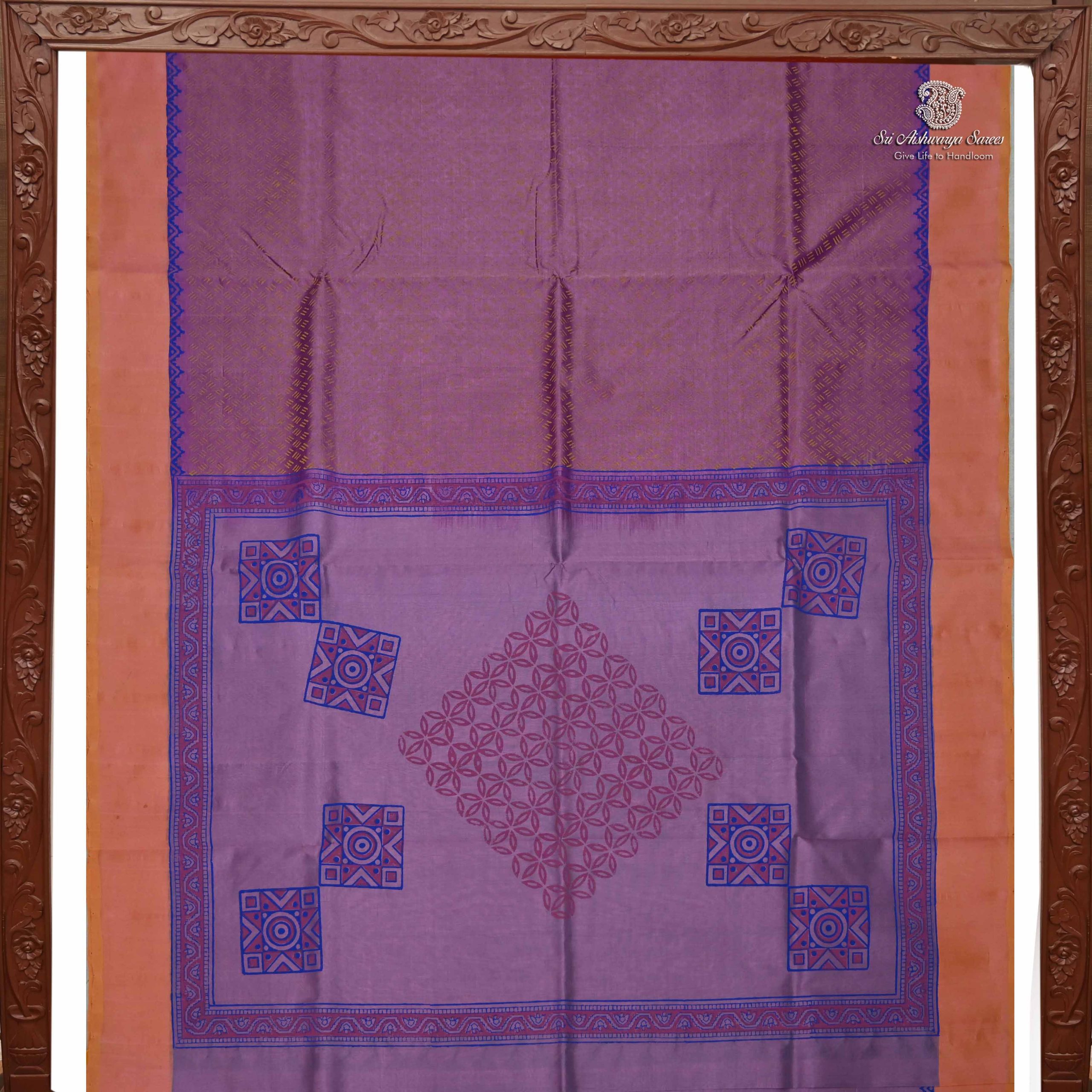 “Pure Silk Cotton Saree Printed with a rich onion pink body, complemented by a green simple pallu and adorned with elegant all-over motif design.”