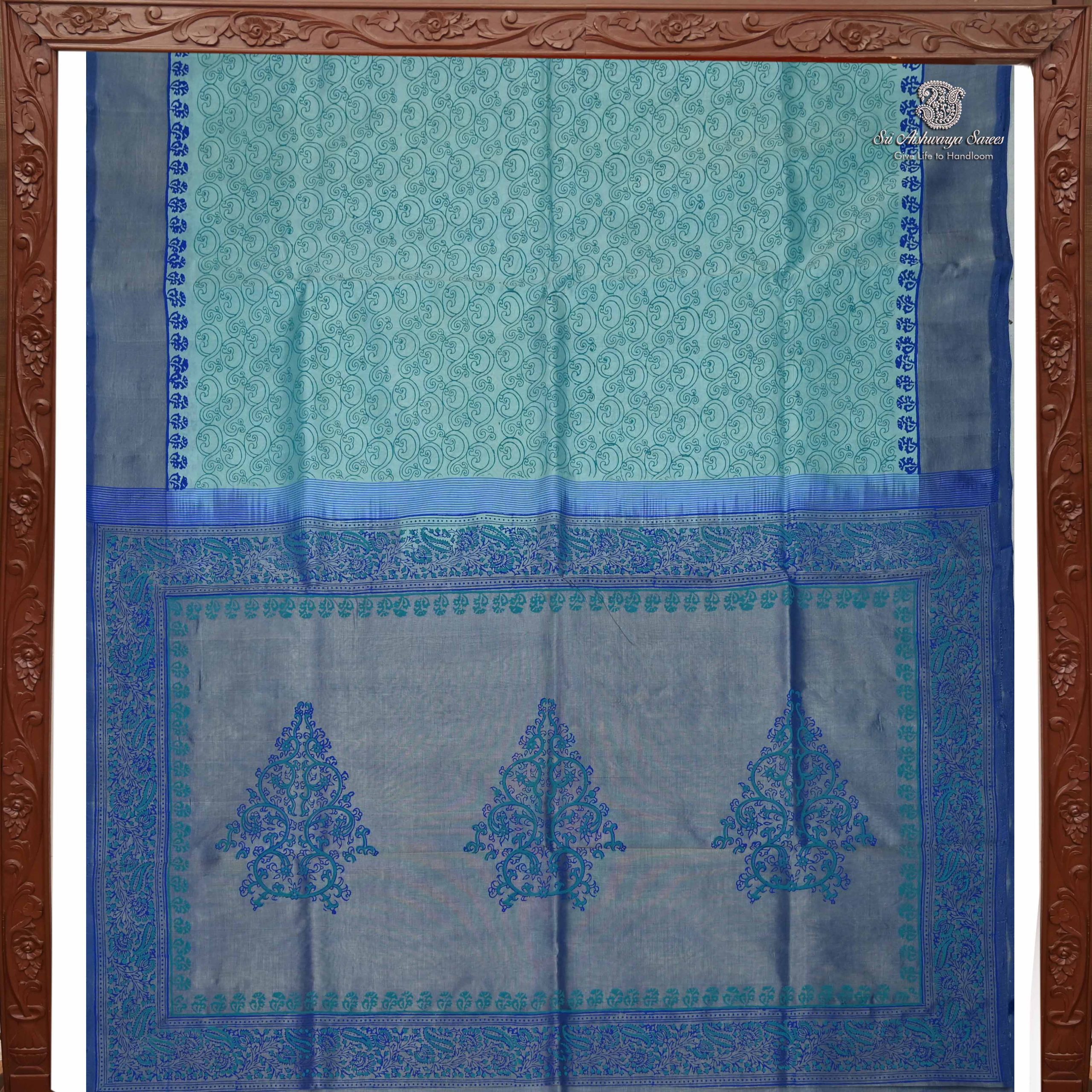 “Pure Silk Cotton Saree Printed with a rich sea blue body, complemented by a green simple pallu and adorned with elegant all-over motif design.”