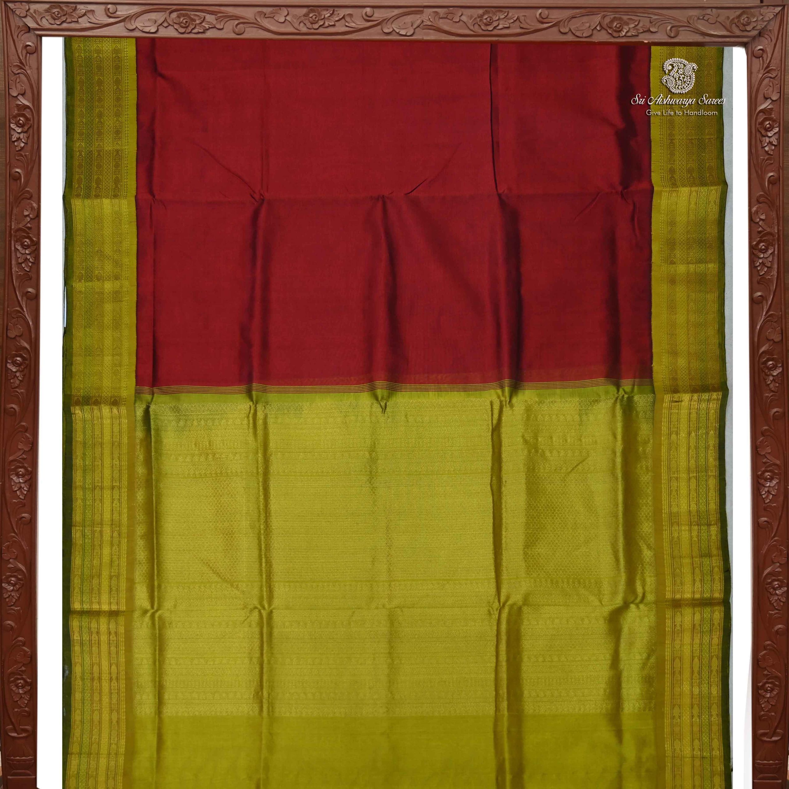 Pure silk cotton saree with a Rusty Orange body and rich mehandi green pallu. A graceful handloom piece blending timeless tradition with elegant charm.