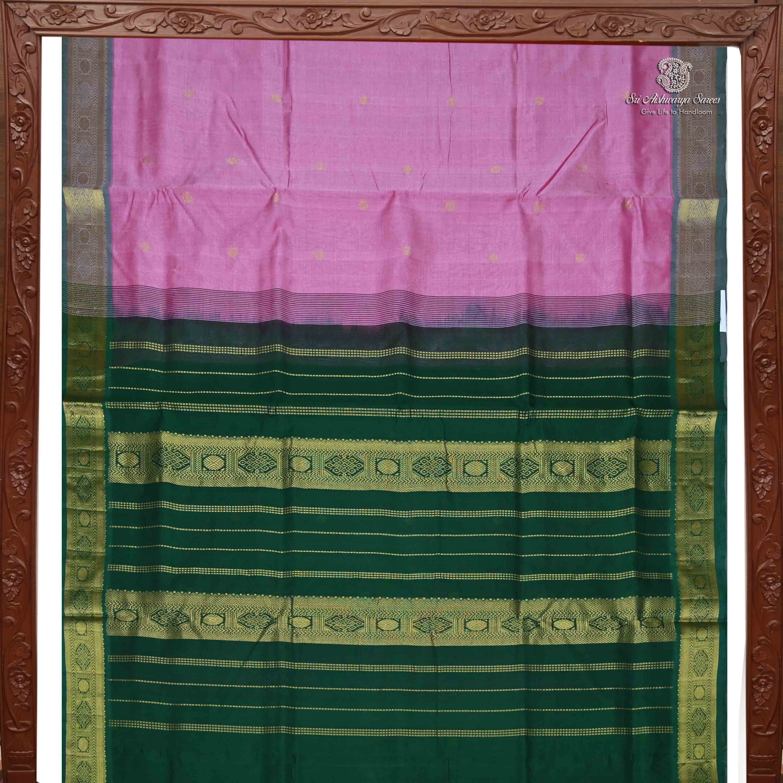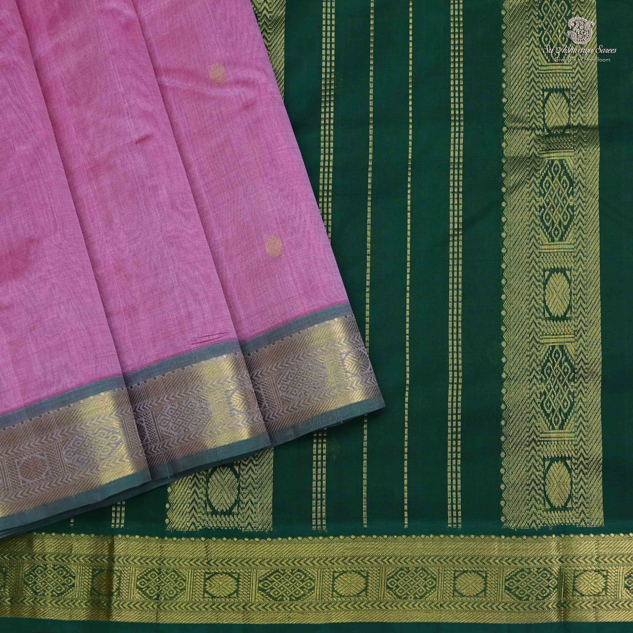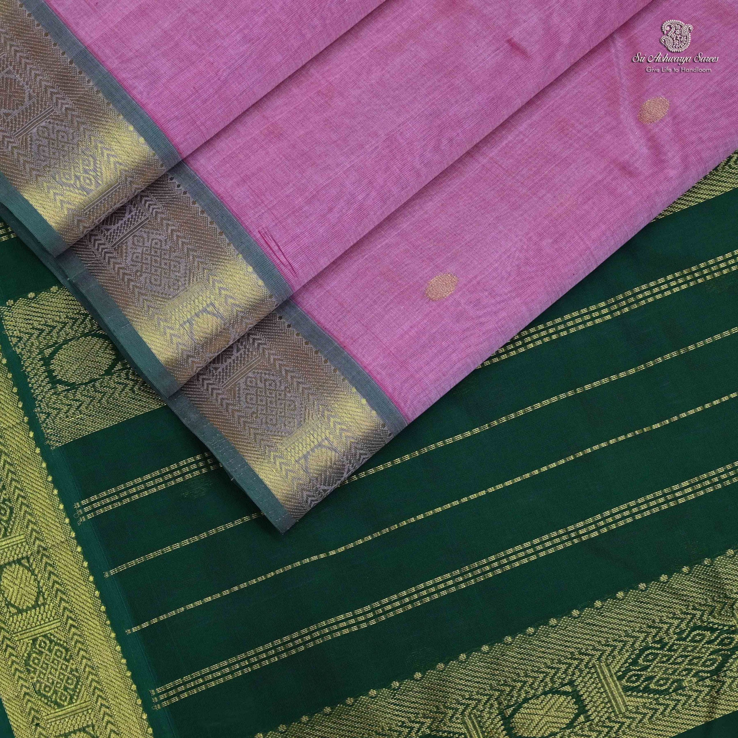 Pure silk cotton saree with a onion pink body and dark green rich pallu featuring graceful butta design. A classic handloom piece with timeless elegance.