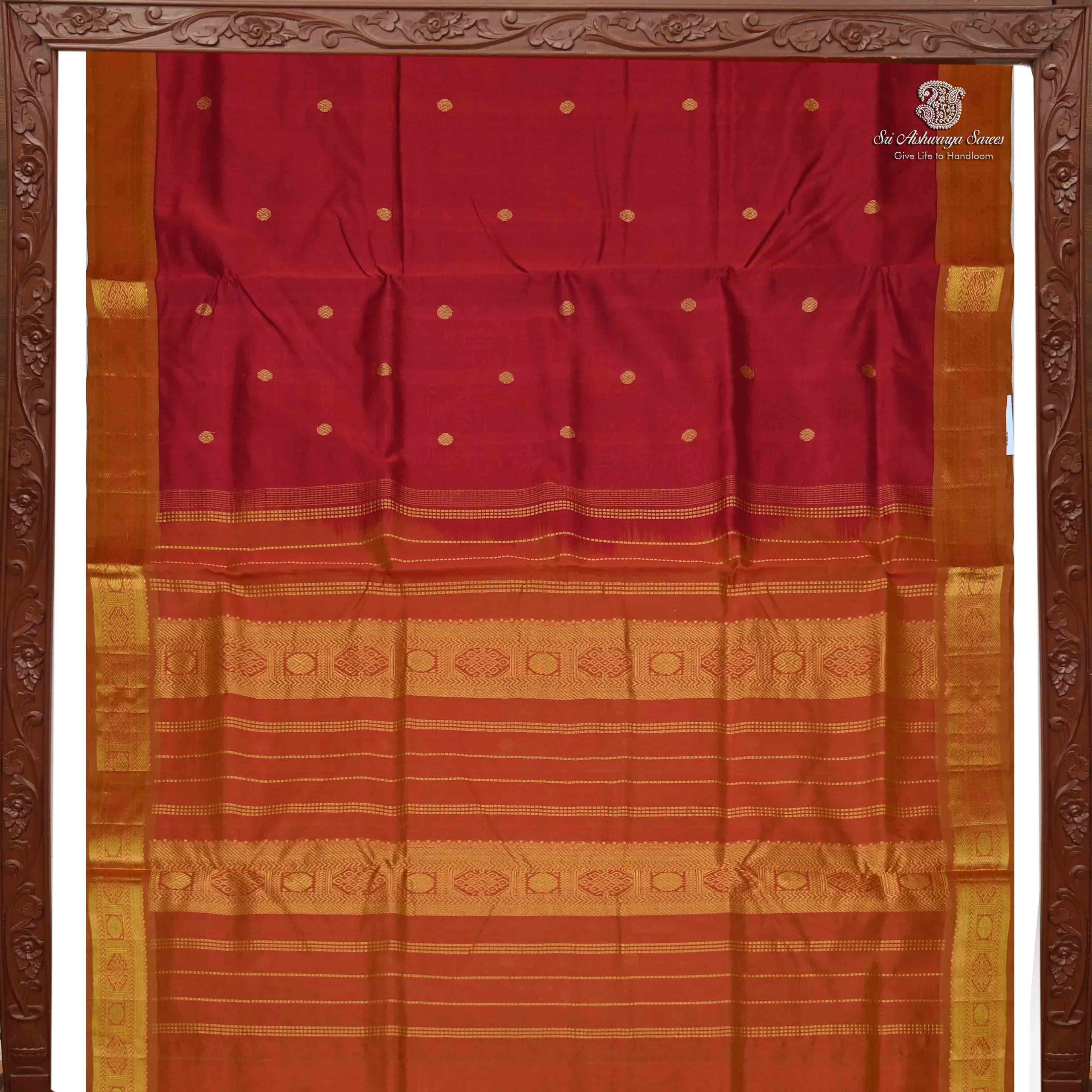Pure silk cotton saree with a dark red body and reddish orange rich pallu featuring graceful butta design. A classic handloom piece with timeless elegance.