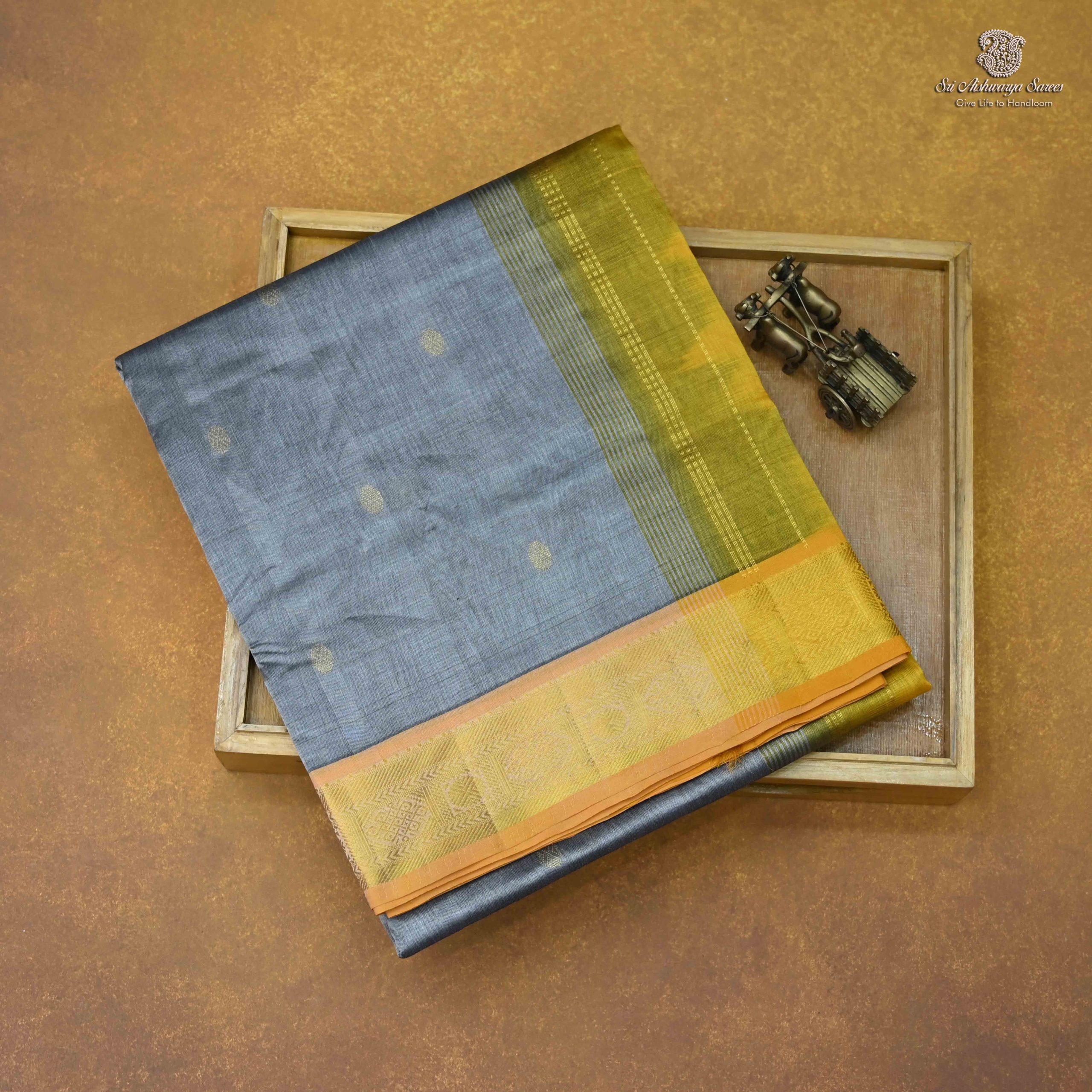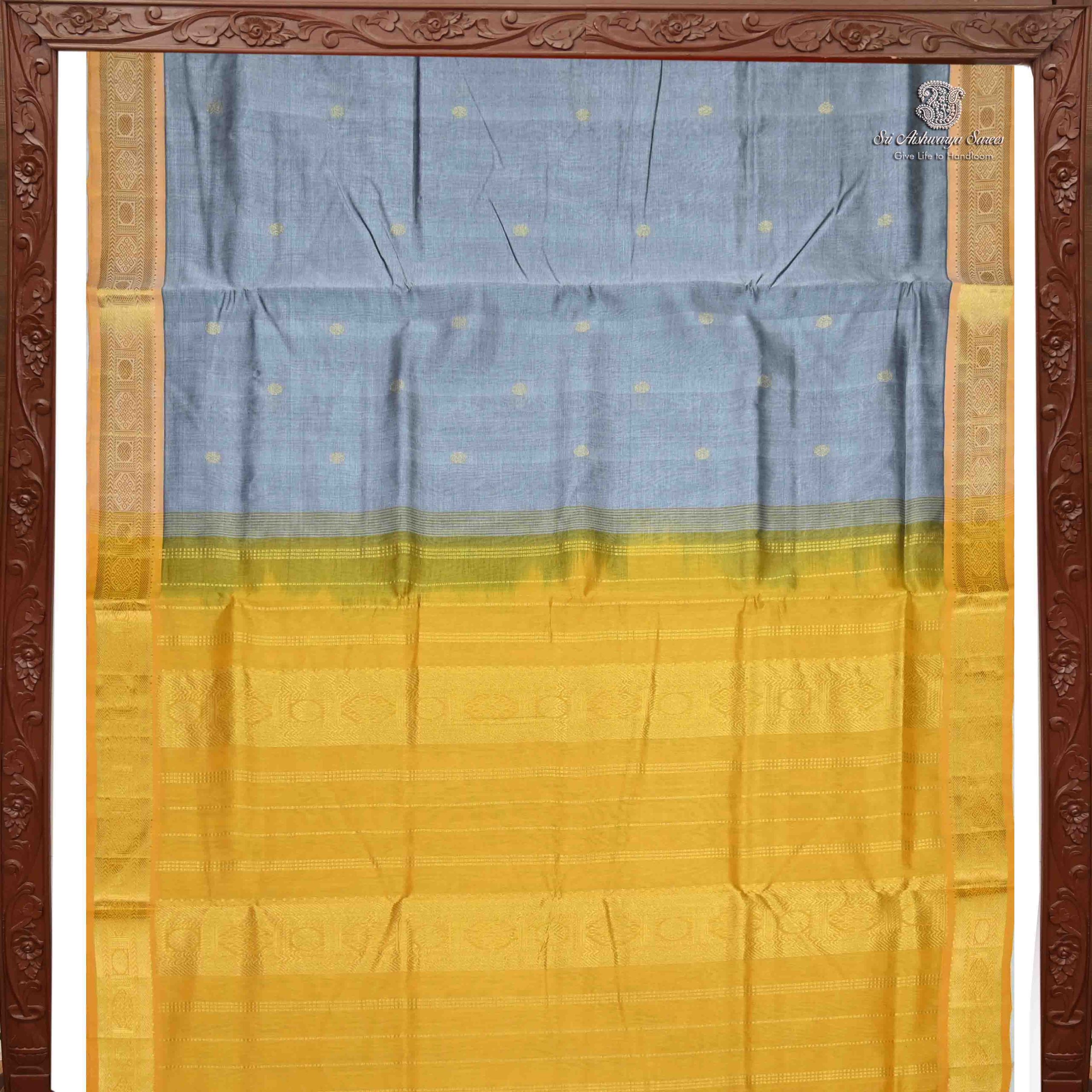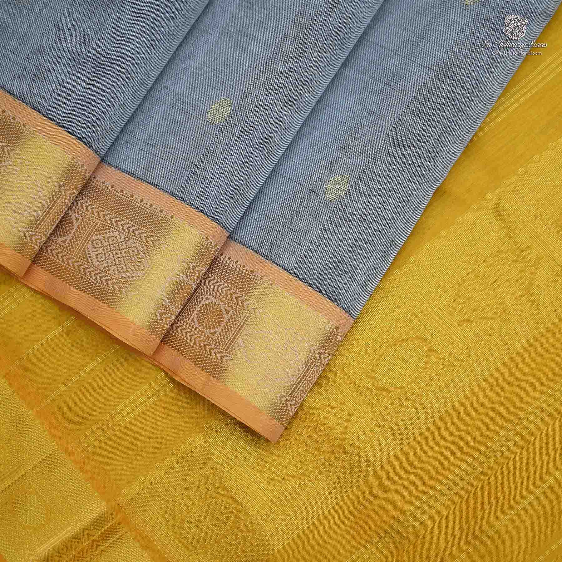 Pure silk cotton saree with a gray body and bright yellow rich pallu featuring graceful butta design. A classic handloom piece with timeless elegance.