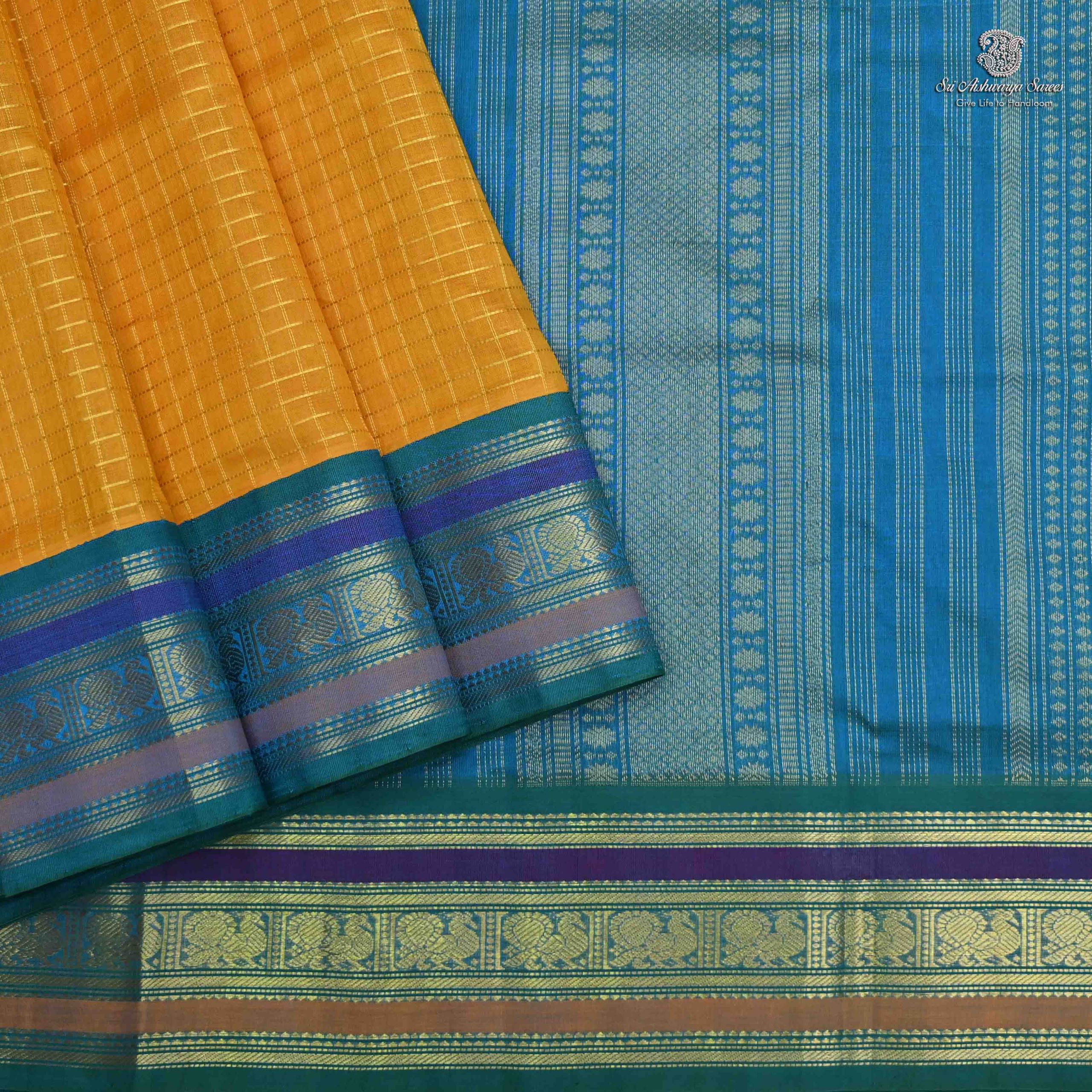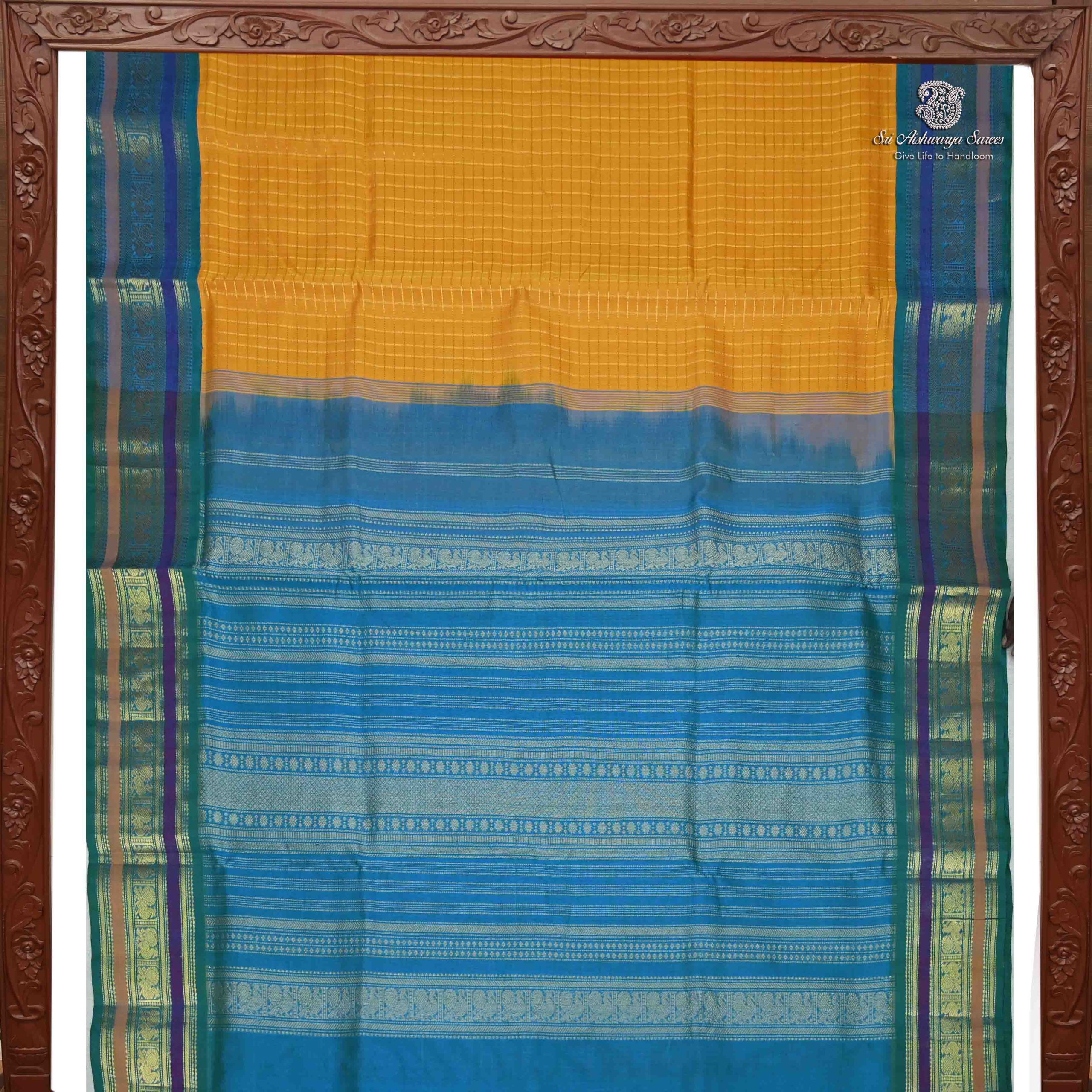 “Silk cotton handloom saree in traditional muthukattam mubagam design, Bright Yellow body with sky blue rich pallu and contrast blouse.”