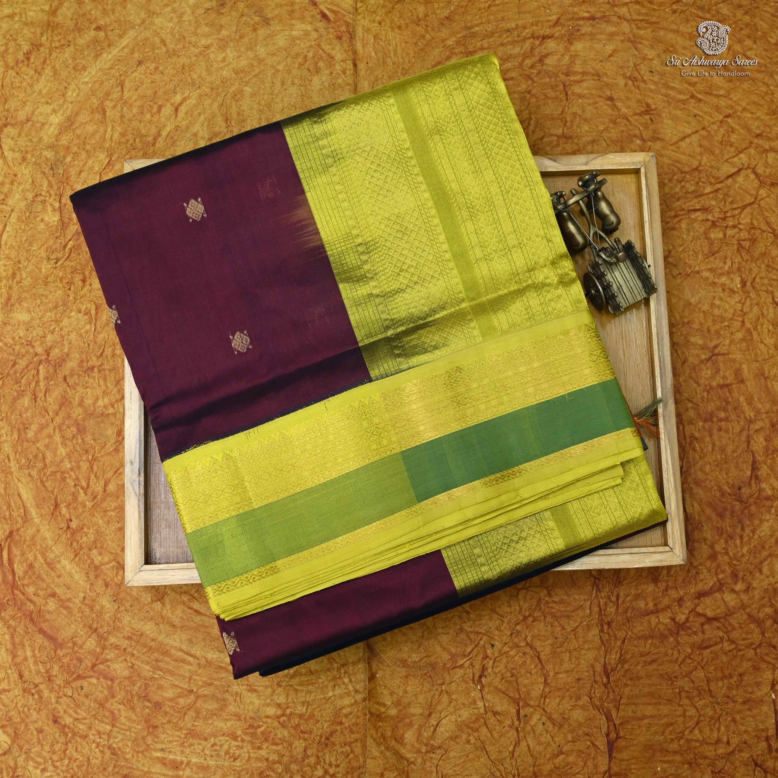 Pure silk cotton saree with a chocolate brown body and lemon yellow rich pallu featuring graceful butta design. A classic handloom piece with timeless elegance.