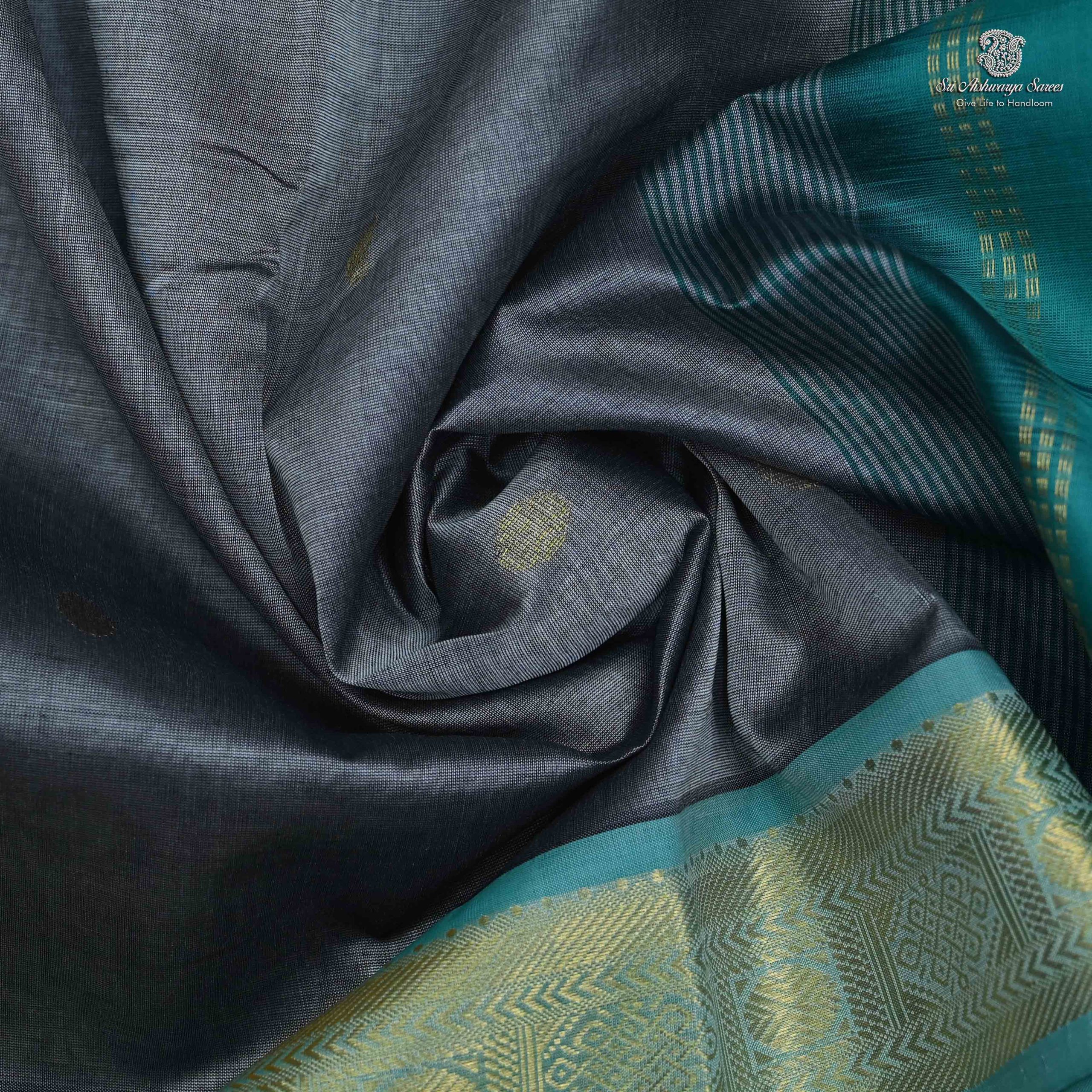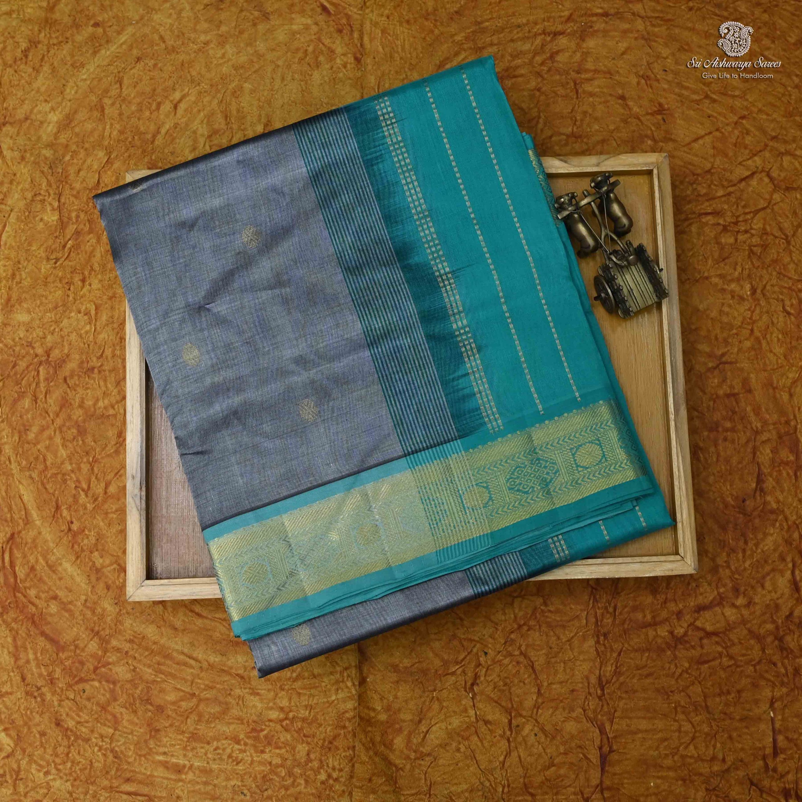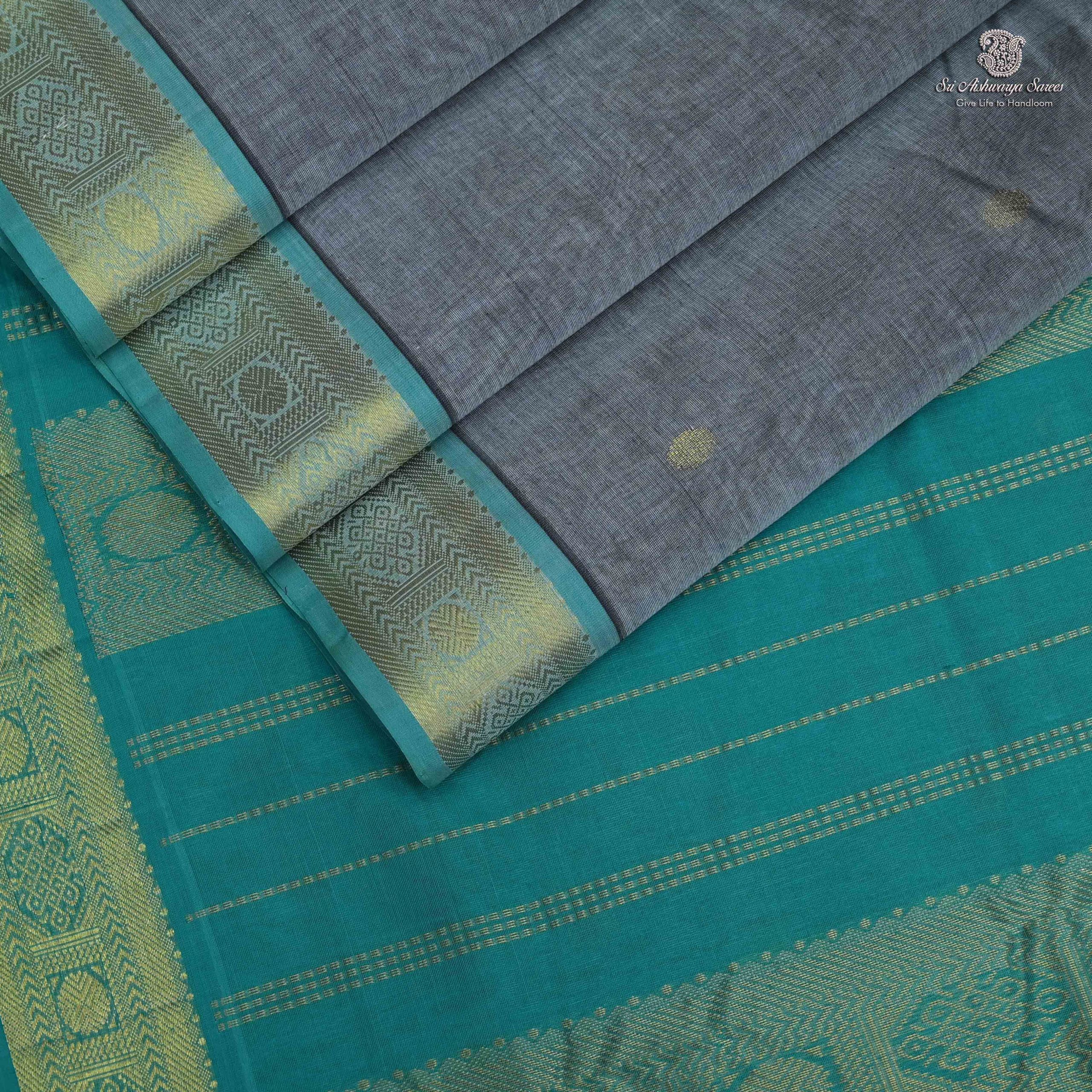 Pure silk cotton saree with a gray body and turquoise blue rich pallu featuring graceful butta design. A classic handloom piece with timeless elegance.