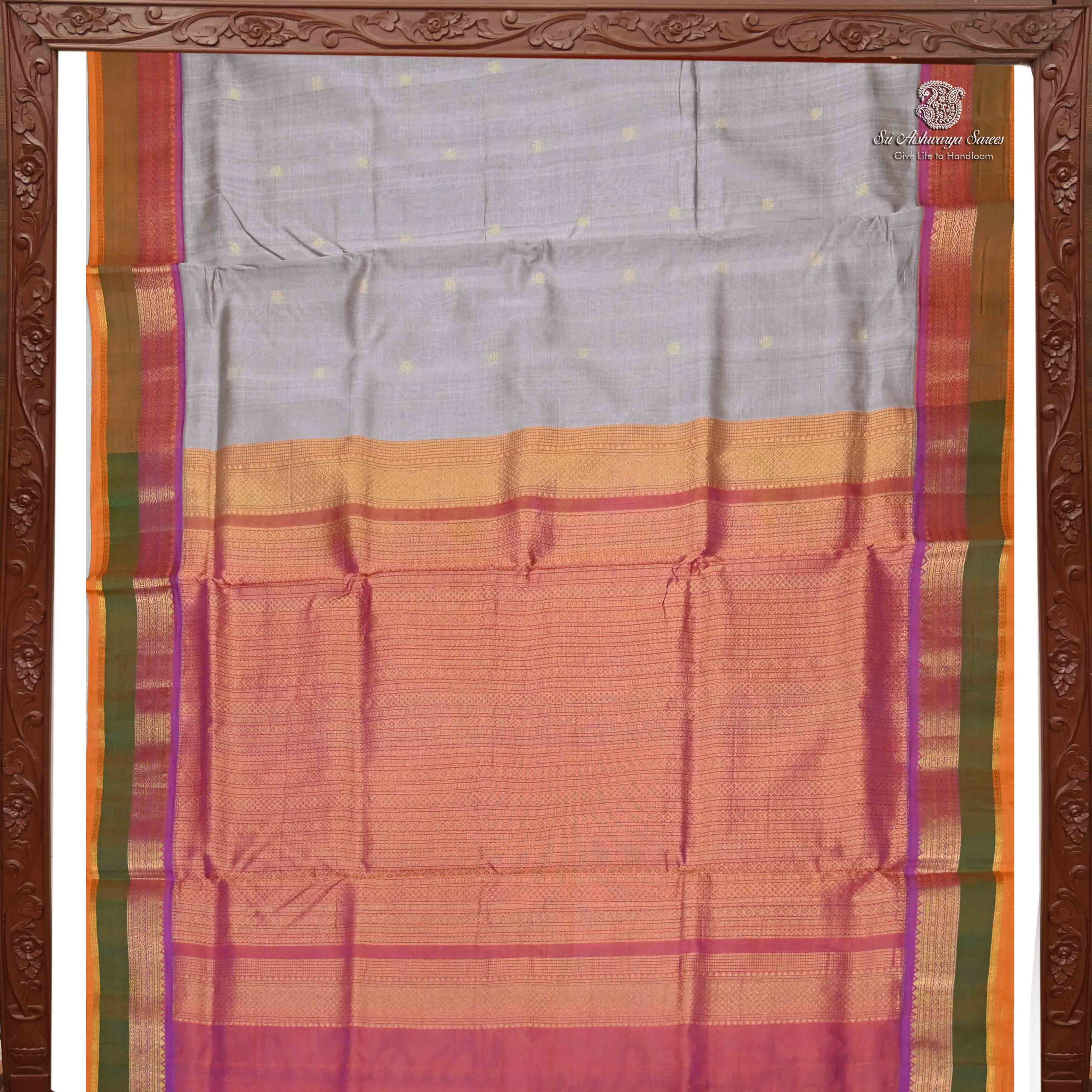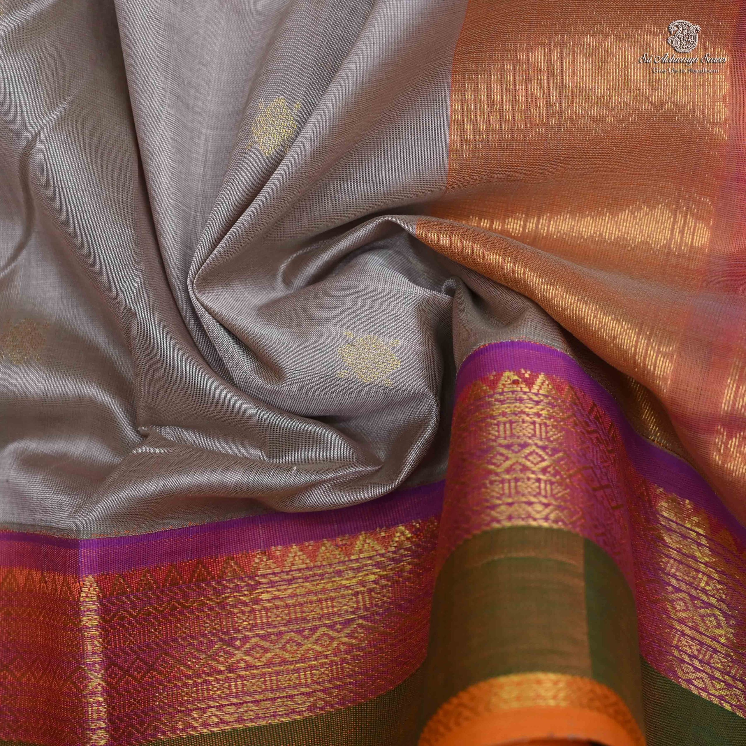Pure silk cotton saree with a gray body and pink rich pallu featuring graceful butta design. A classic handloom piece with timeless elegance.