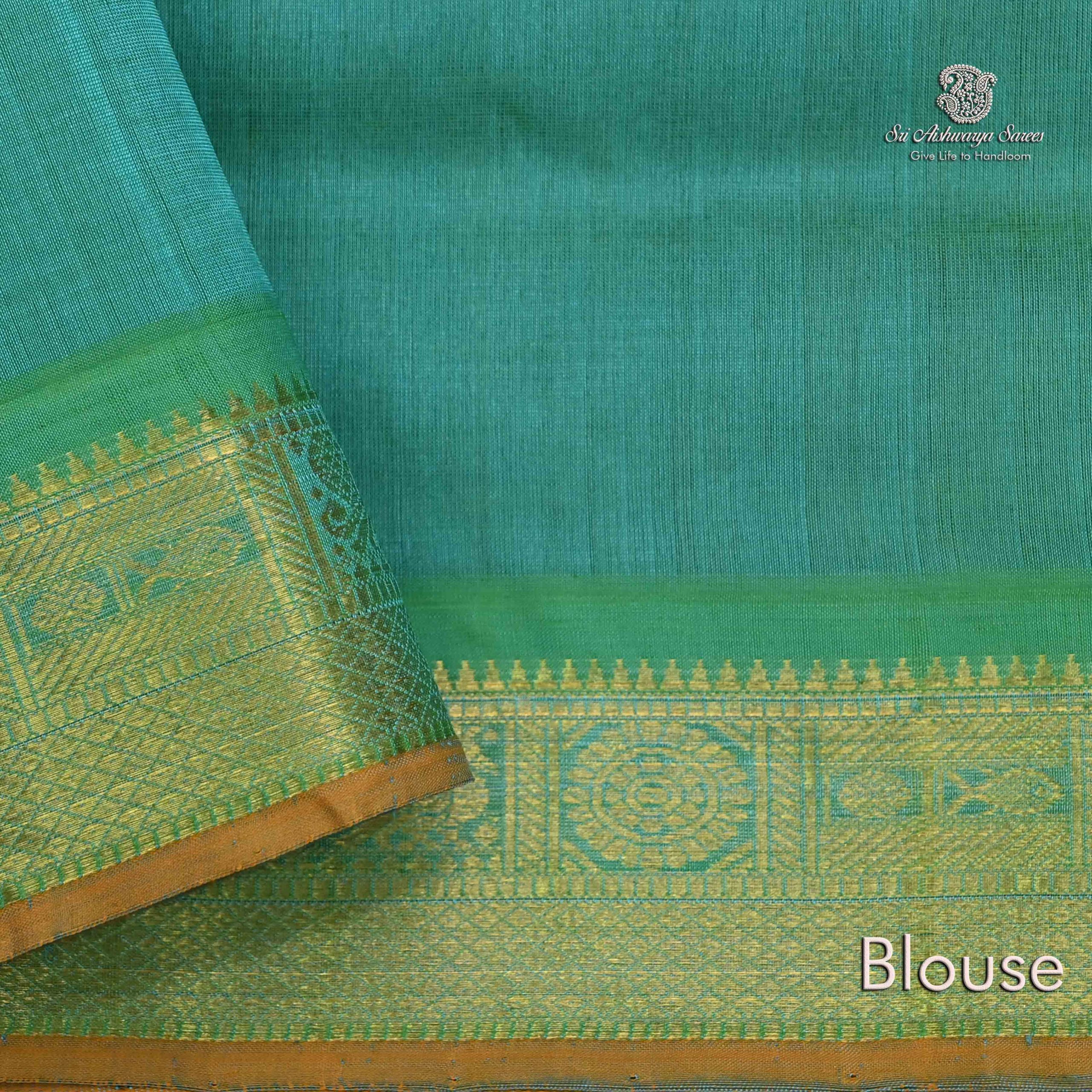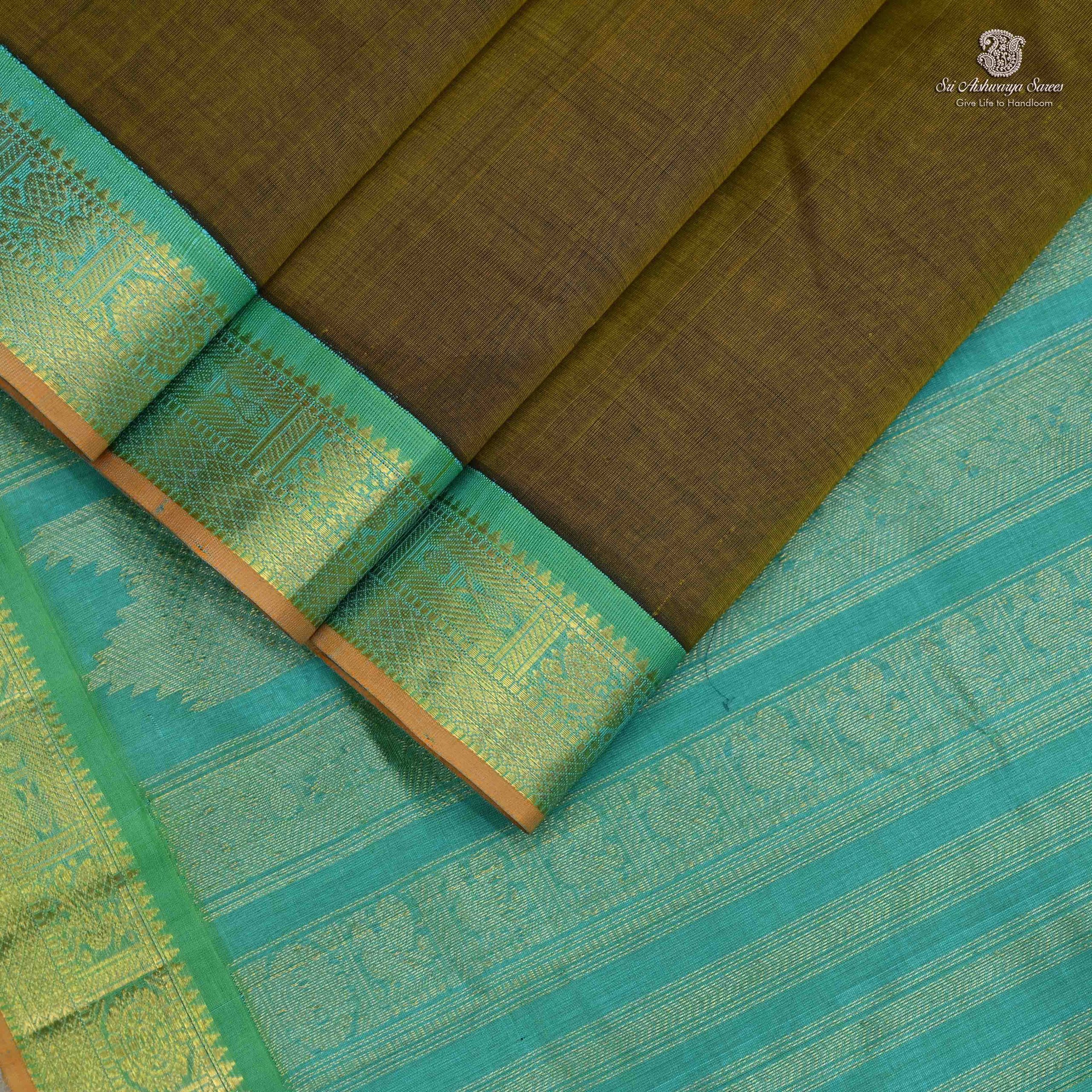 Pure silk cotton saree with a green mehndi body and turquoise rich pallu in a simple design. A graceful handloom weave for timeless traditional elegance.