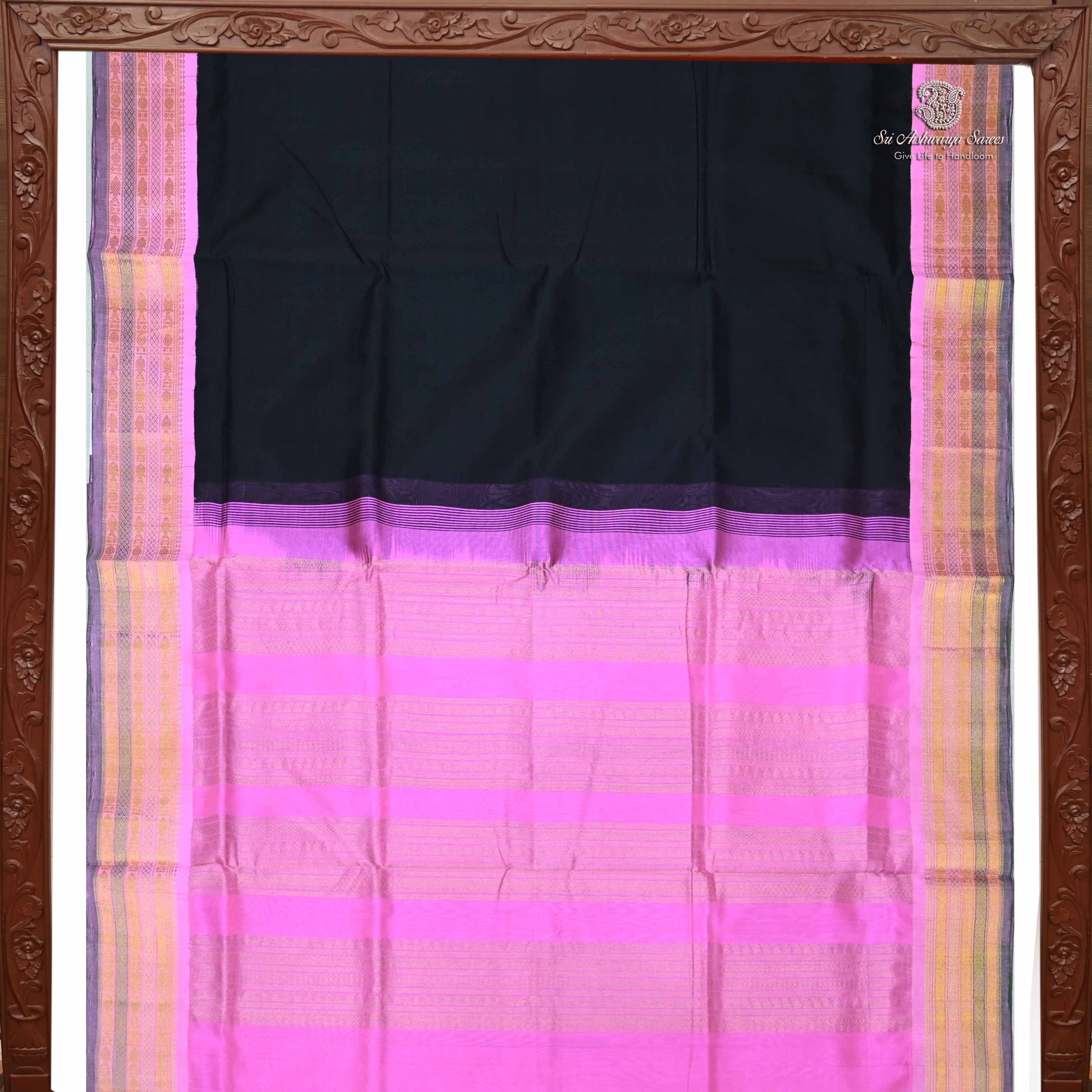 Pure handloom silk cotton saree with a black body and rich light pink pallu in korvai design. A traditional weave showcasing elegance and charm.