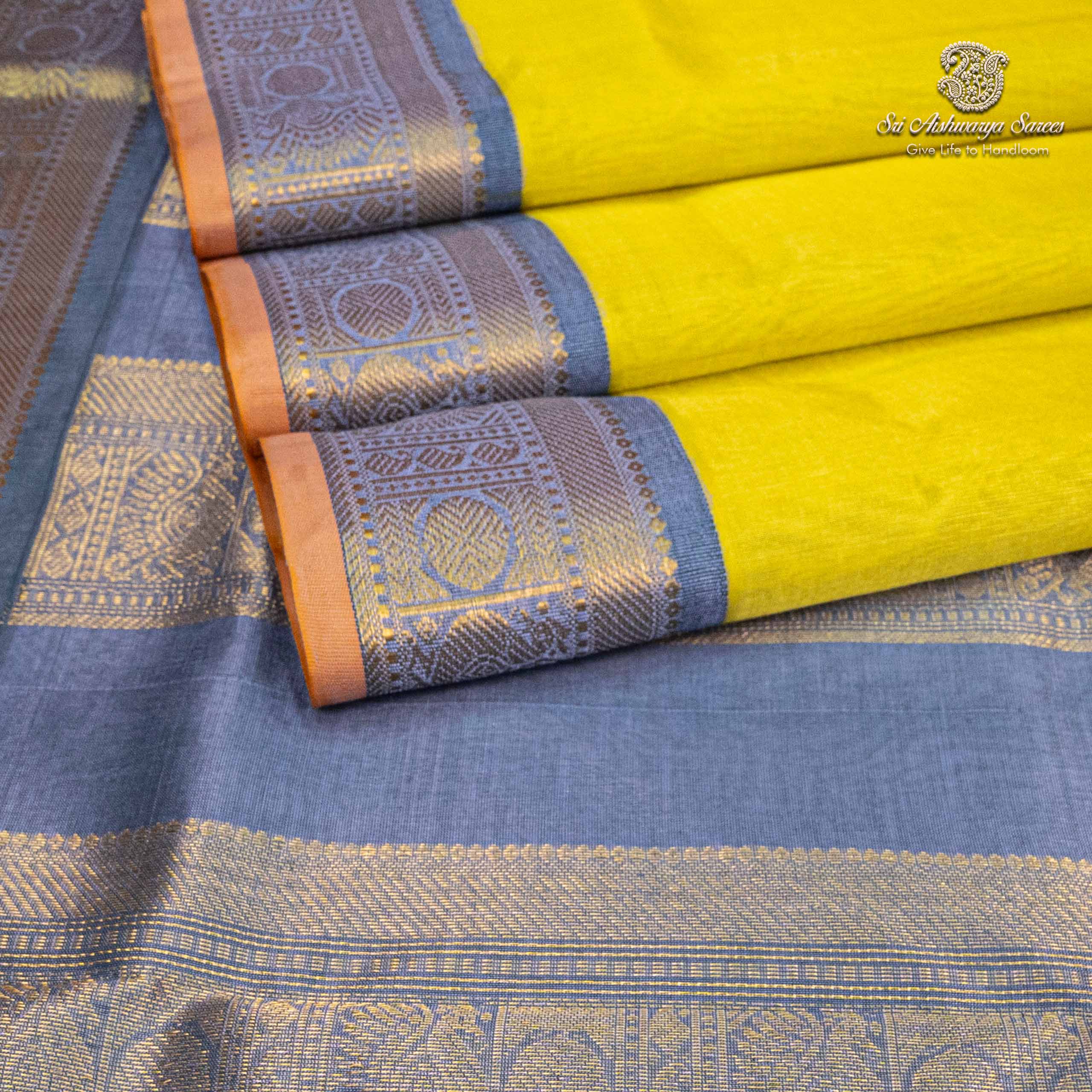 Introducing the Korvai Silk Cotton Saree in Lemon Yellow, a graceful blend of tradition and modern elegance. Crafted from high-quality silk cotton, this saree offers exceptional comfort along with refined sophistication. It an ideal choice for festive occasions, family gatherings, and elegant everyday wear.