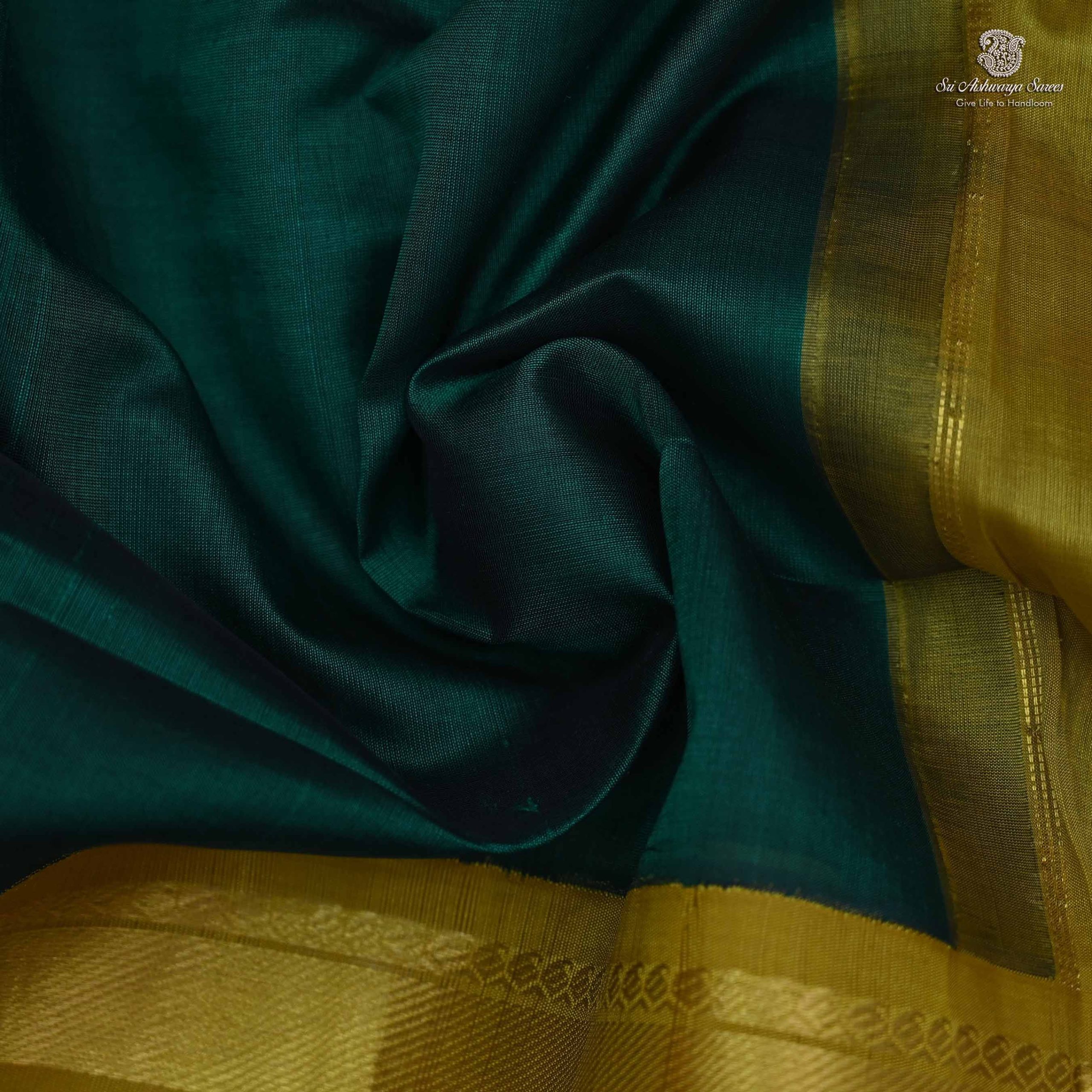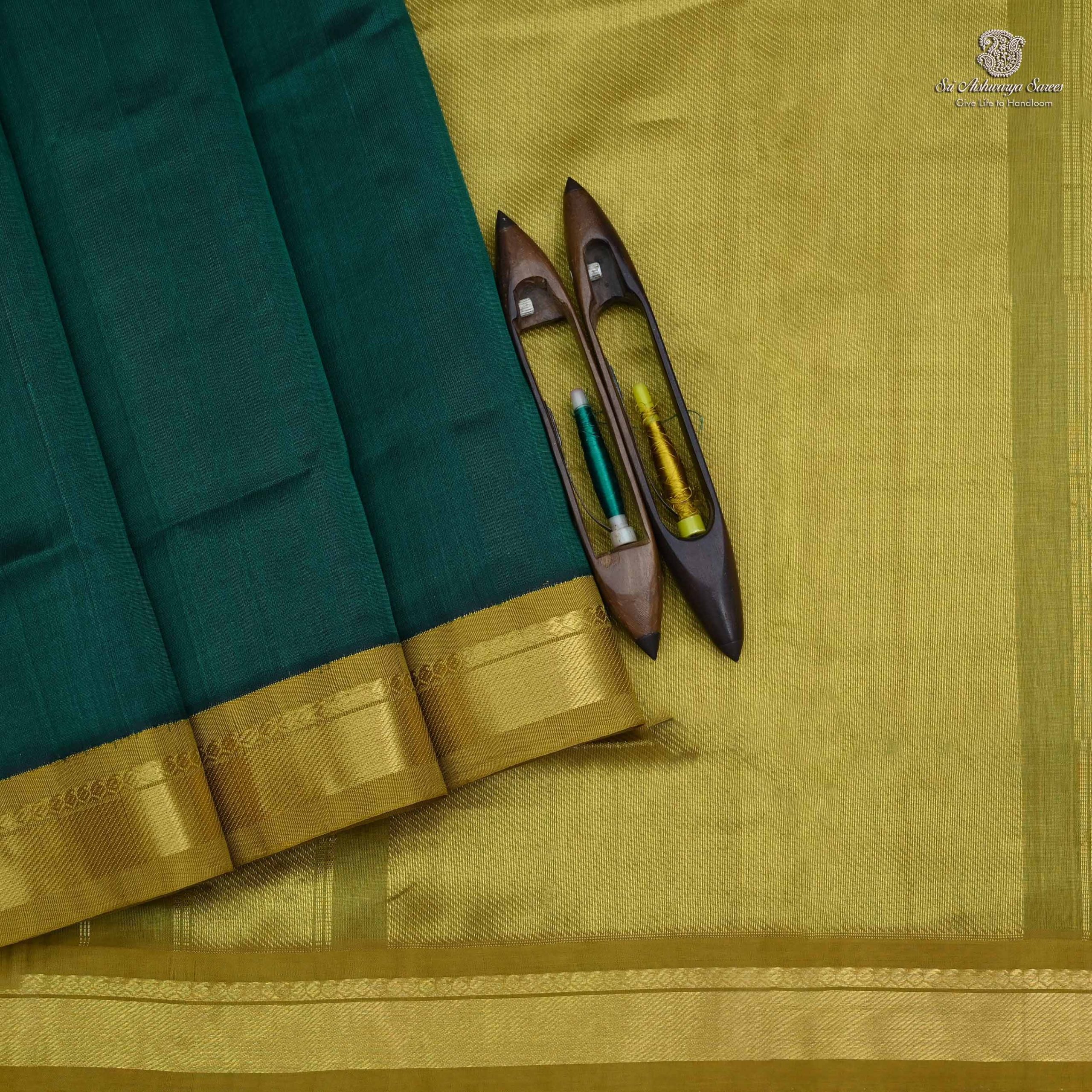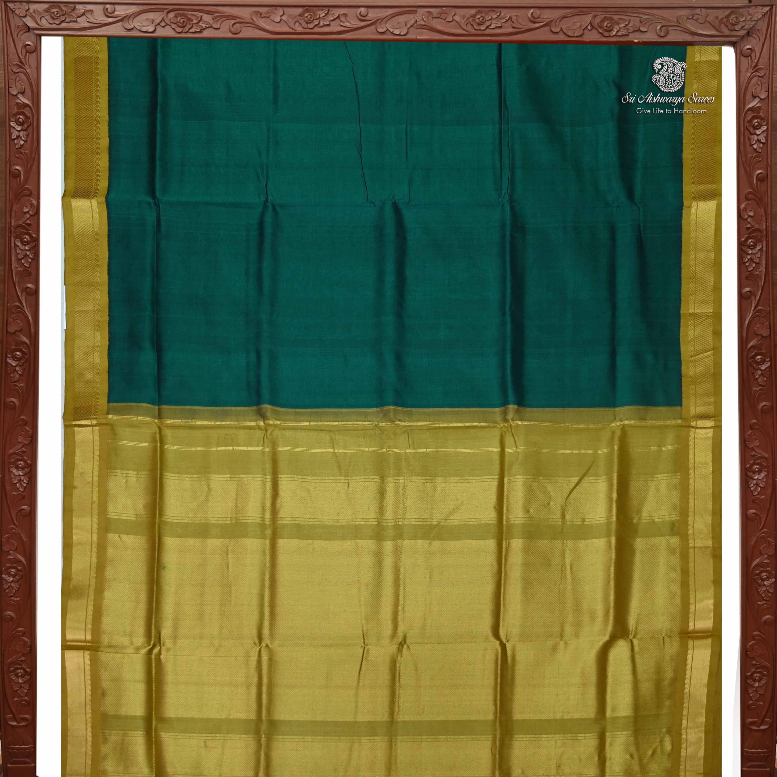 Pure handloom silk cotton saree with a peacock green body and rich mehandi green pallu in korvai design. A traditional weave showcasing elegance and charm.