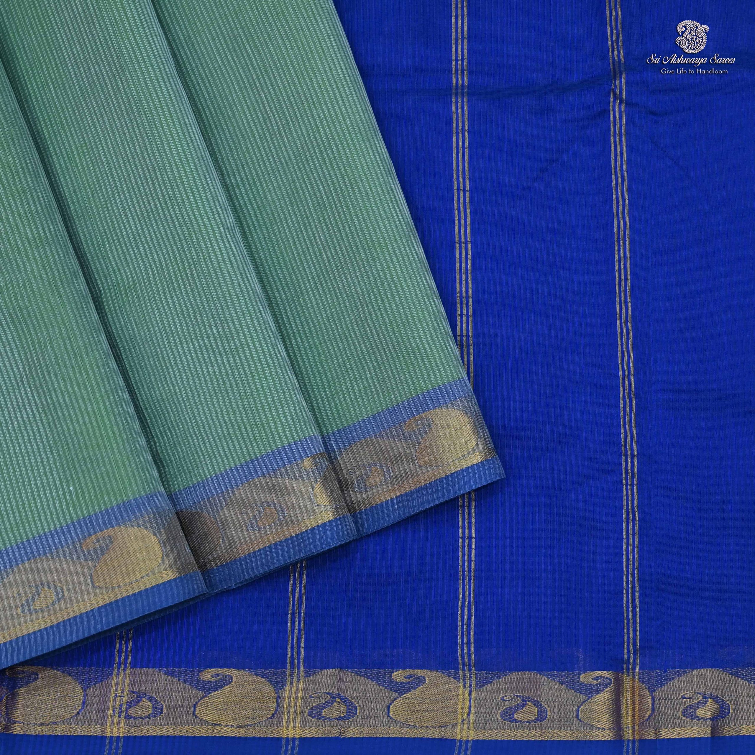 Pure silk cotton saree with a Calm Green body and simple dark blue pallu. A vibrant handloom piece blending elegance with traditional charm.