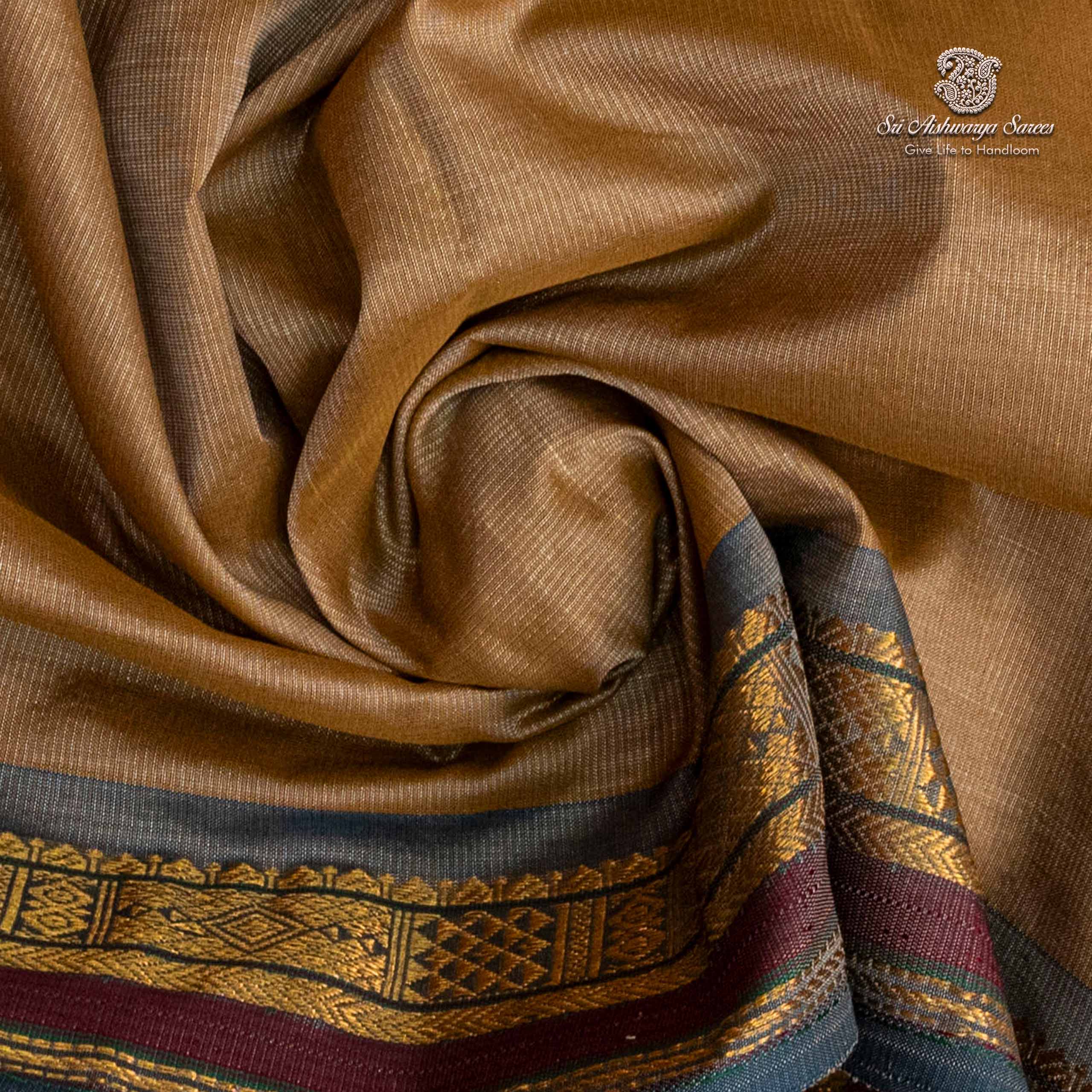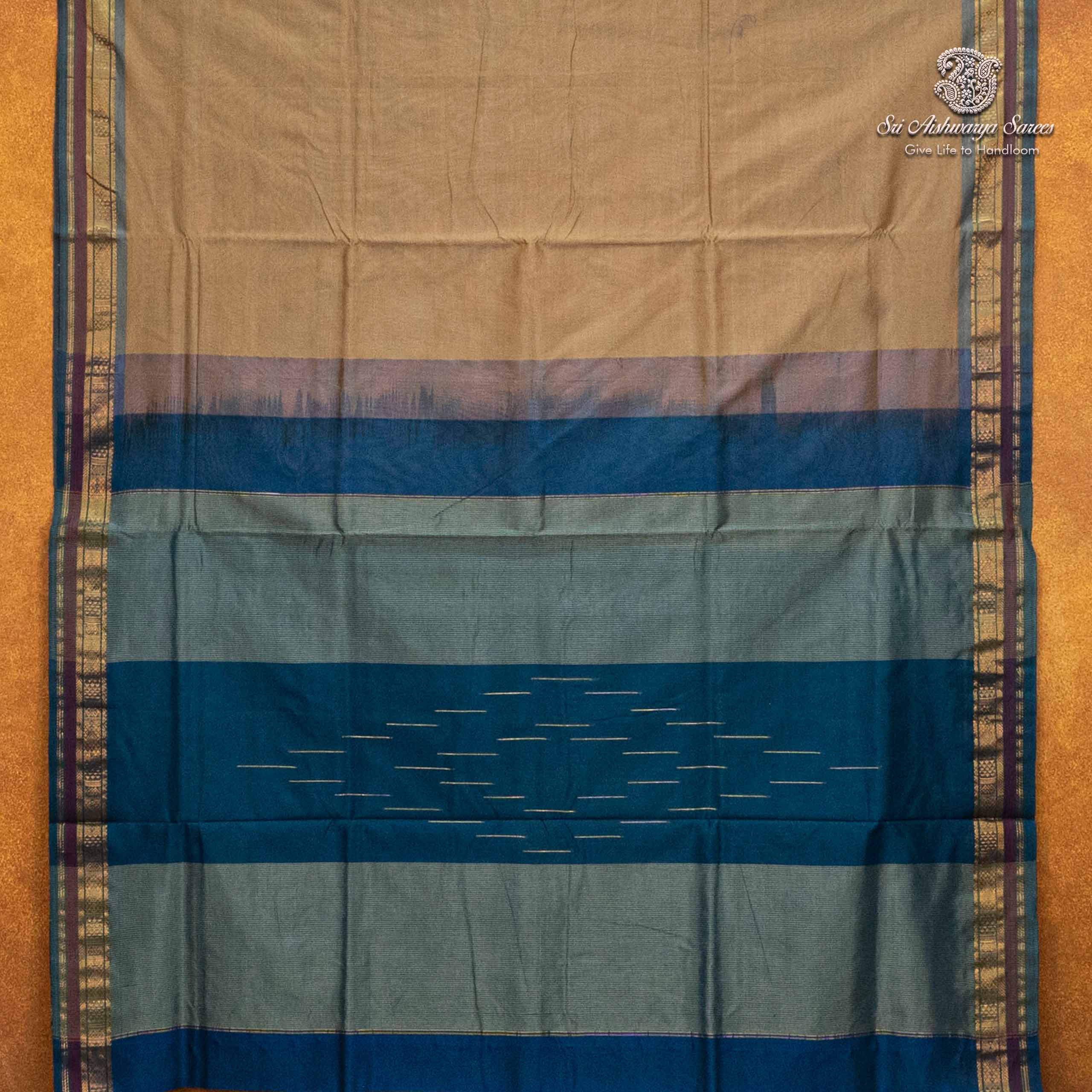 Pure silk cotton saree with a dark beige body and light blue pallu. A vibrant handloom piece blending elegance with traditional charm.