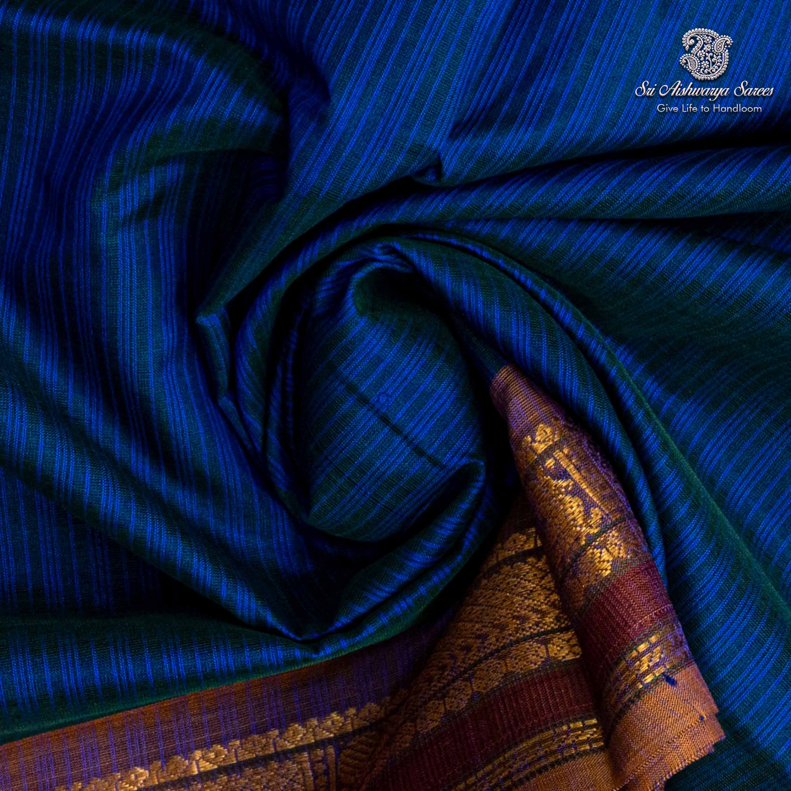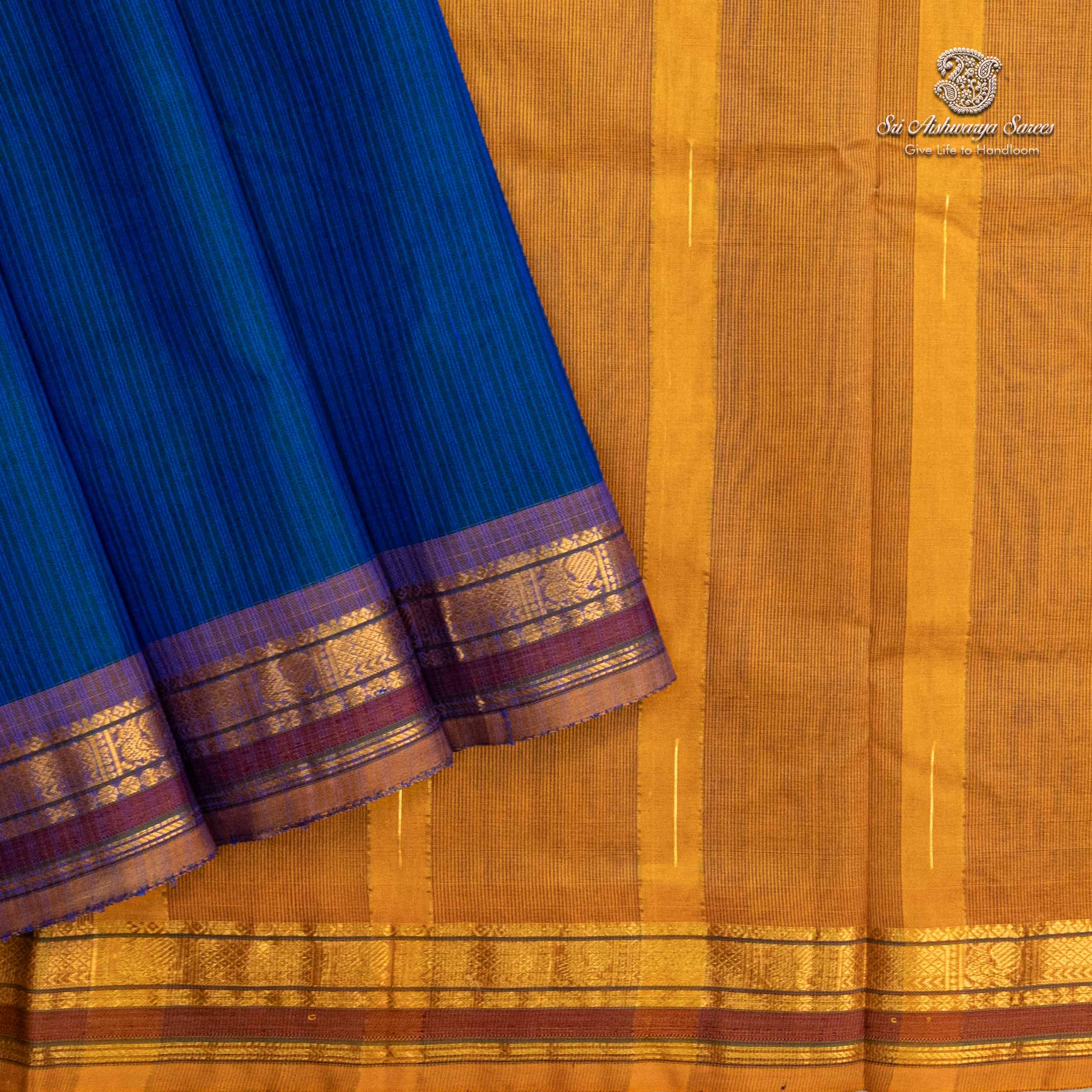 Pure silk cotton saree with a dual shade blue body and mustard yellow pallu. A vibrant handloom piece blending elegance with traditional charm.