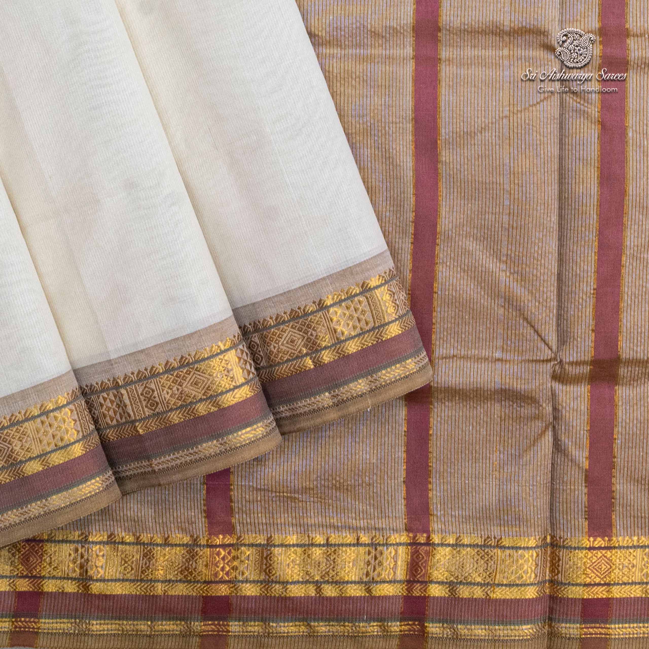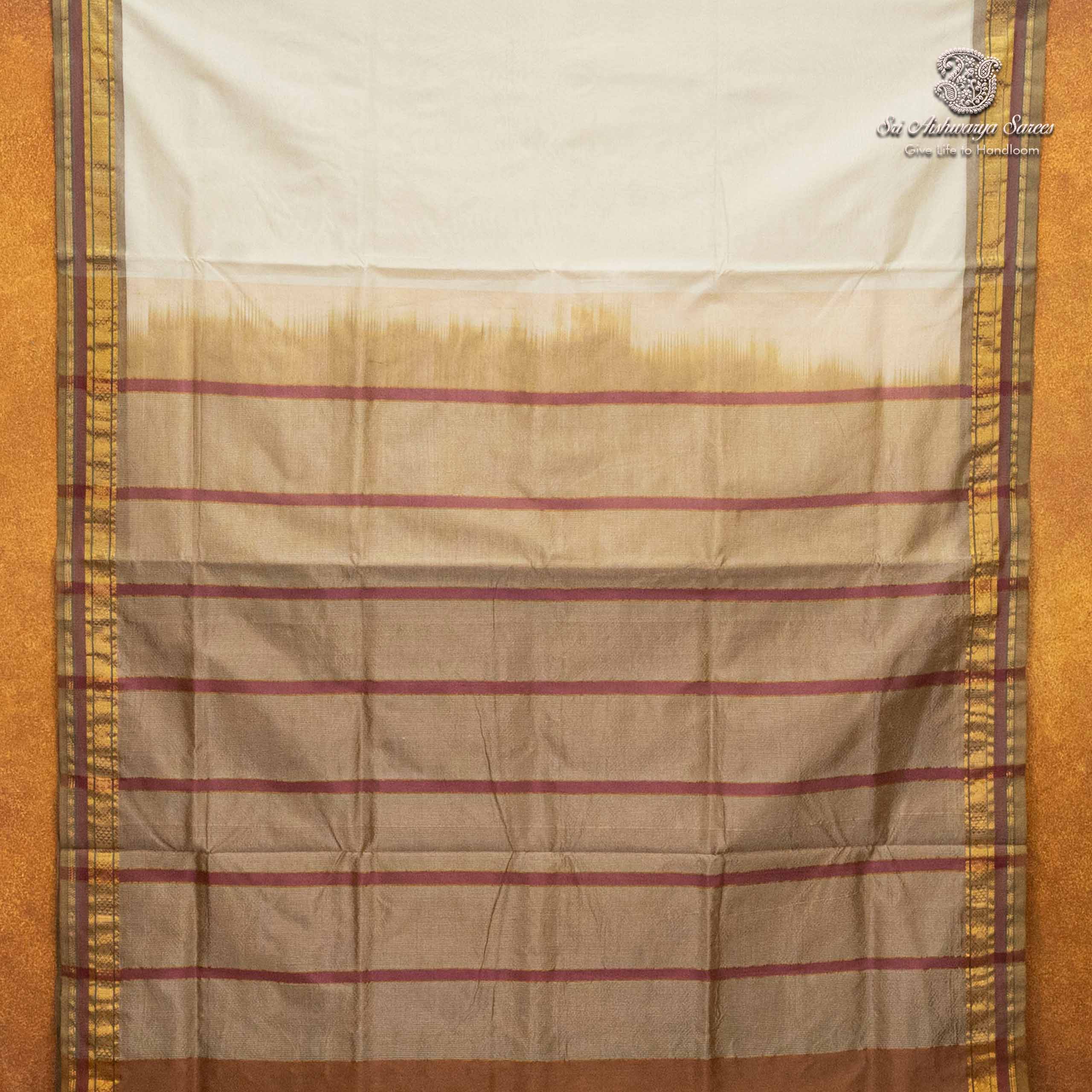 Pure silk cotton saree with a Ivory body and dark beige pallu. A vibrant handloom piece blending elegance with traditional charm.