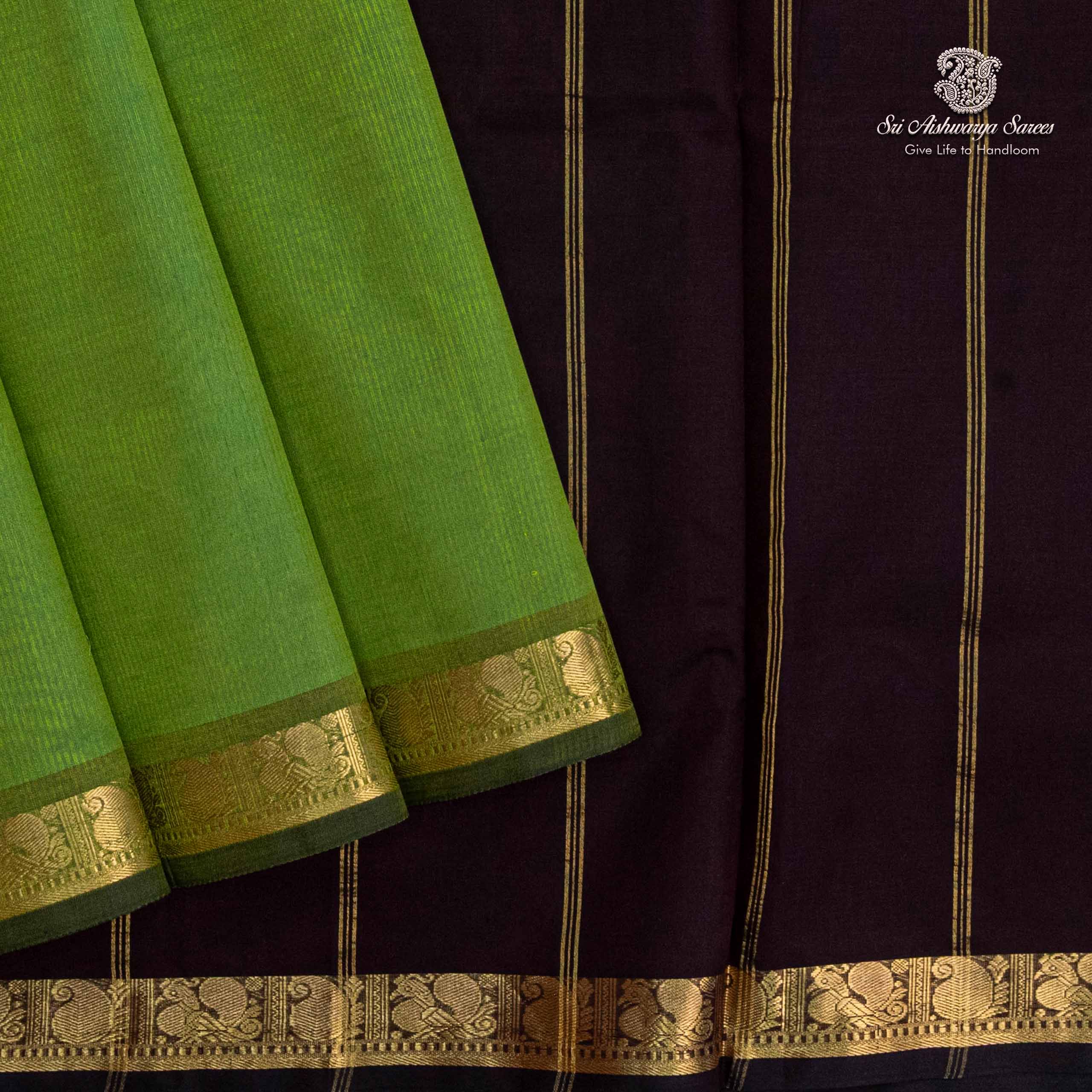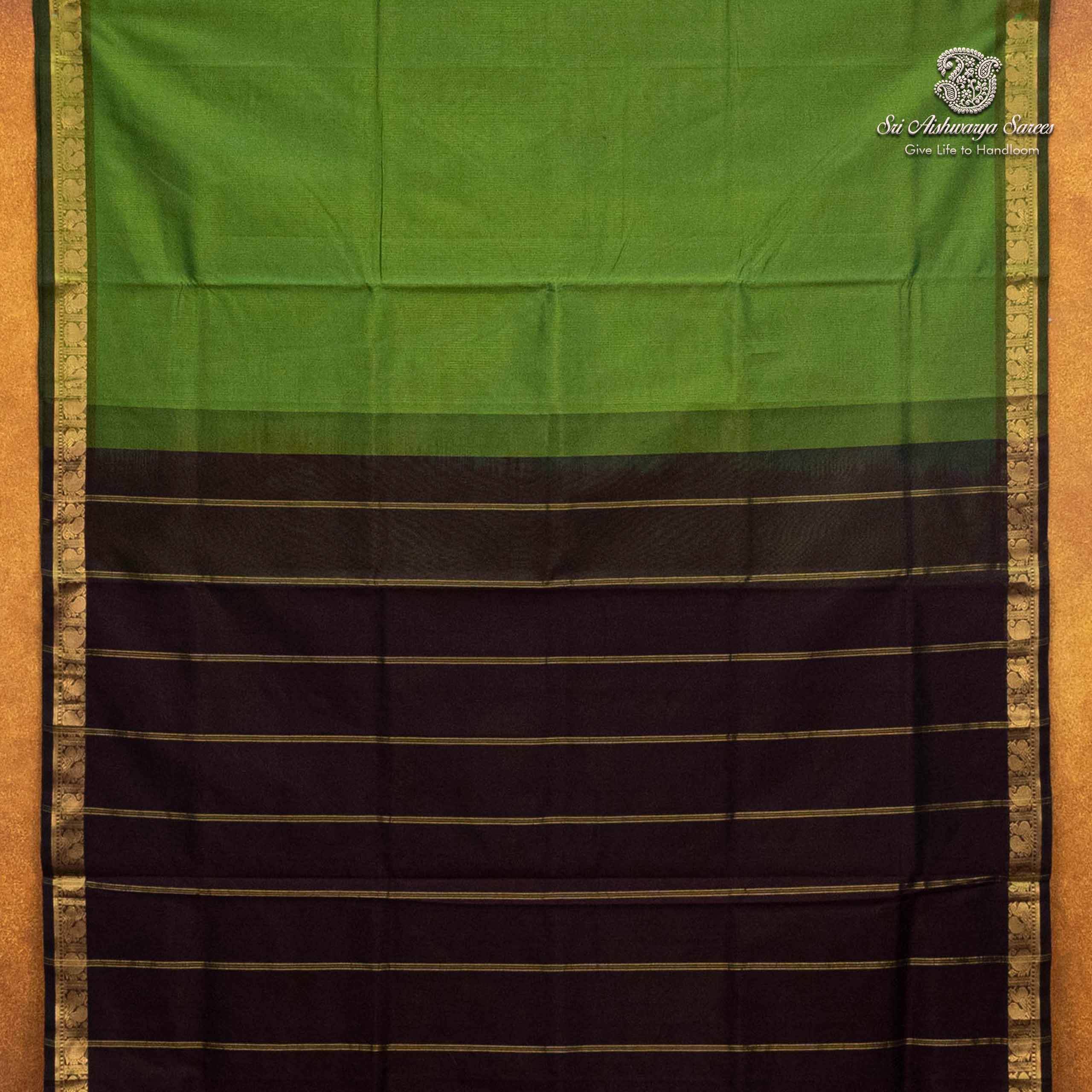 Pure silk cotton saree with a kelly green body and dark brown pallu. A vibrant handloom piece blending elegance with traditional charm.