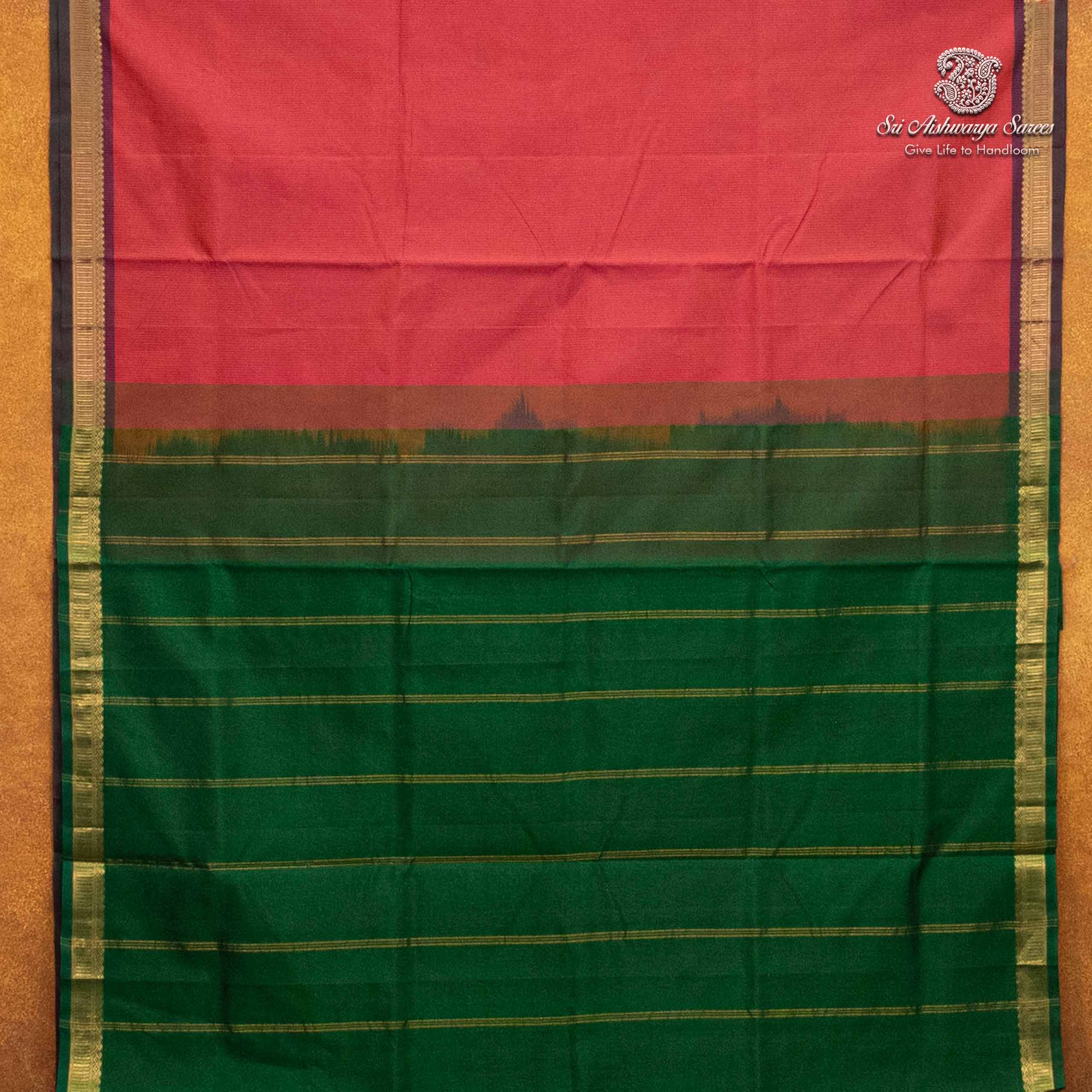 Pure silk cotton saree with a orangish pink body and green pallu. A vibrant handloom piece blending elegance with traditional charm.