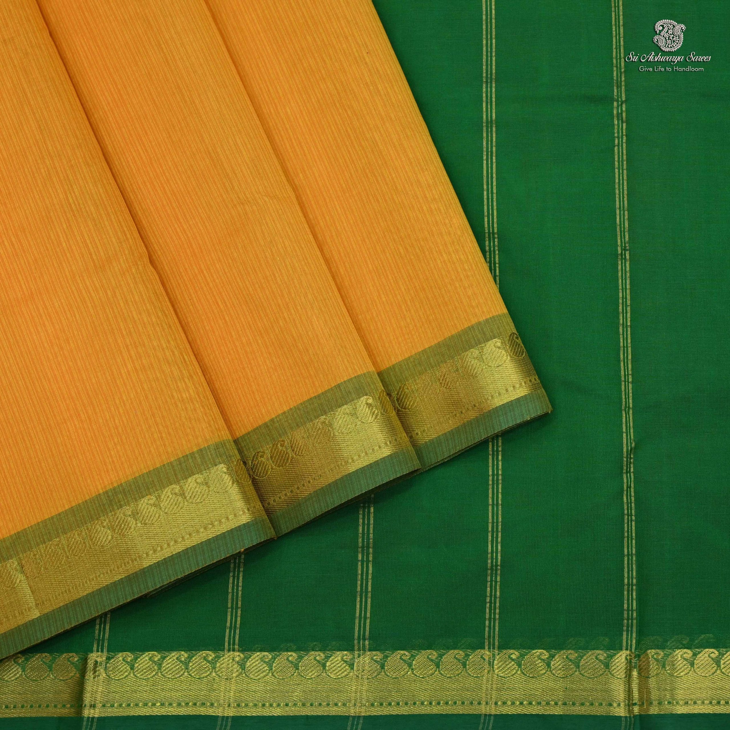 Pure silk cotton saree with a Pastel Yellow body and simple emerald green pallu. A vibrant handloom piece blending elegance with traditional charm.