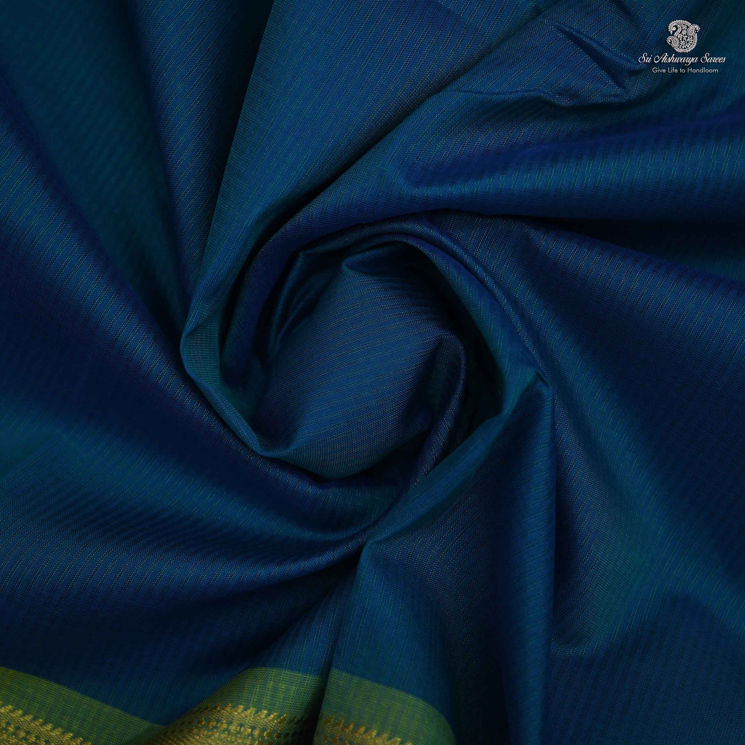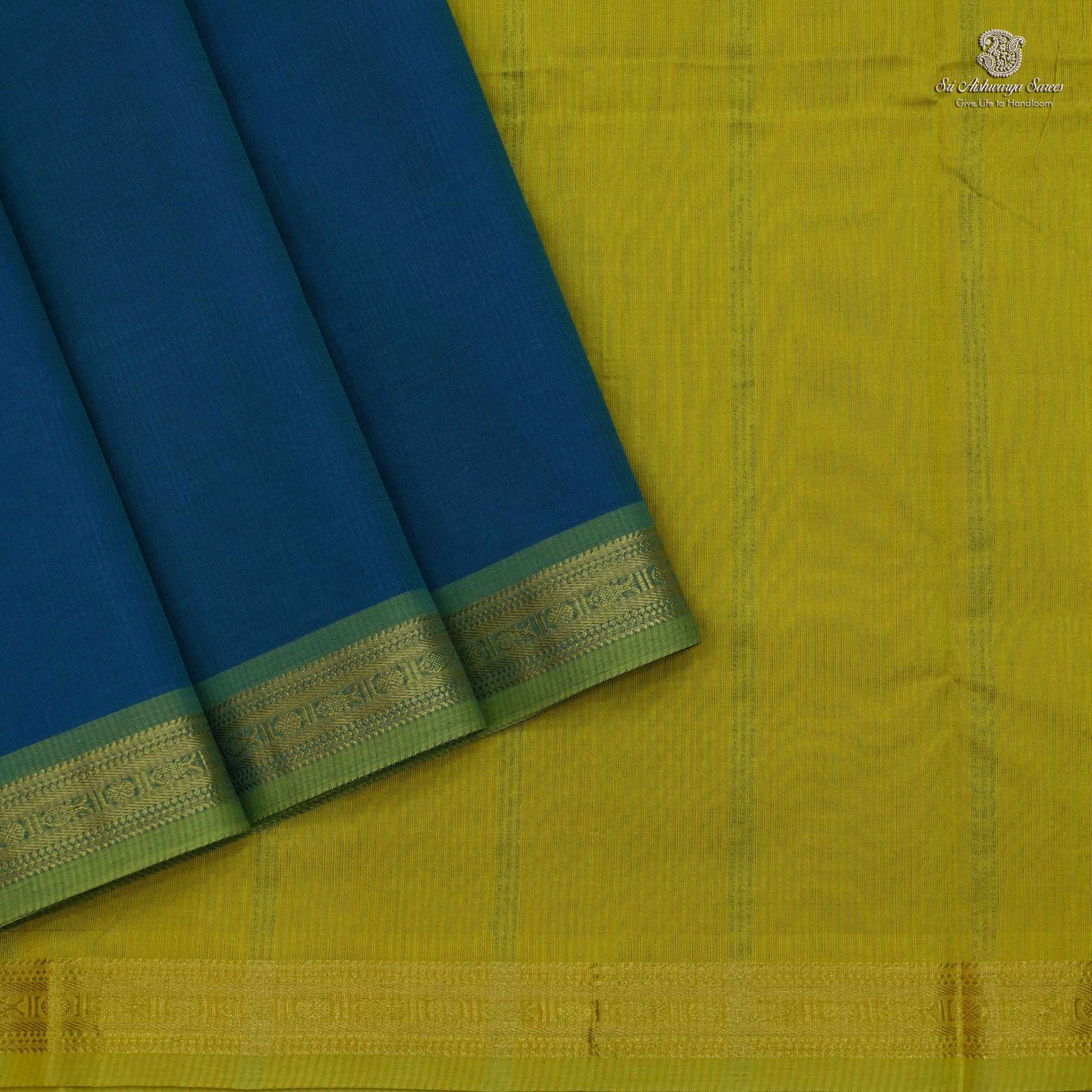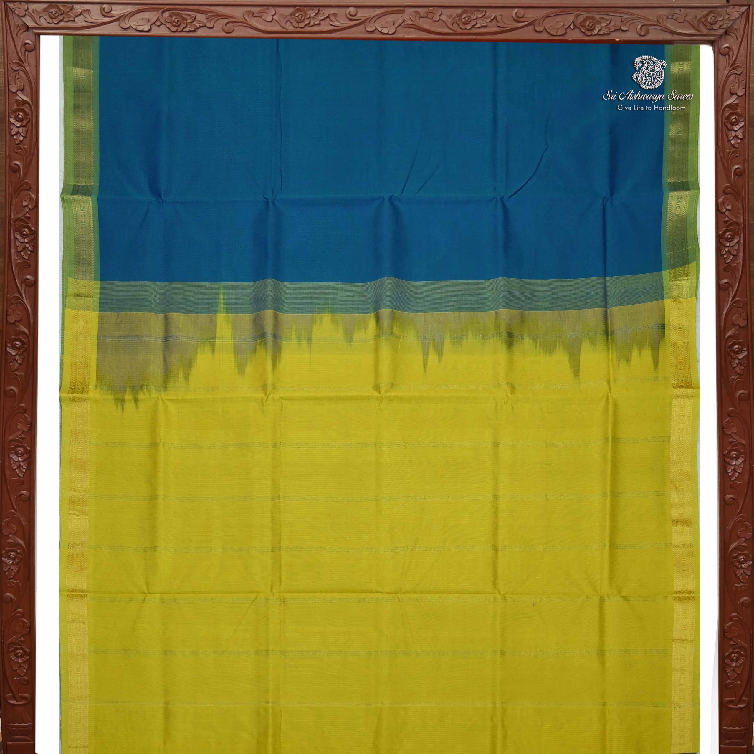 Pure silk cotton saree with a Peacock Blue body and simple chartreuse Green pallu. A vibrant handloom piece blending elegance with traditional charm.